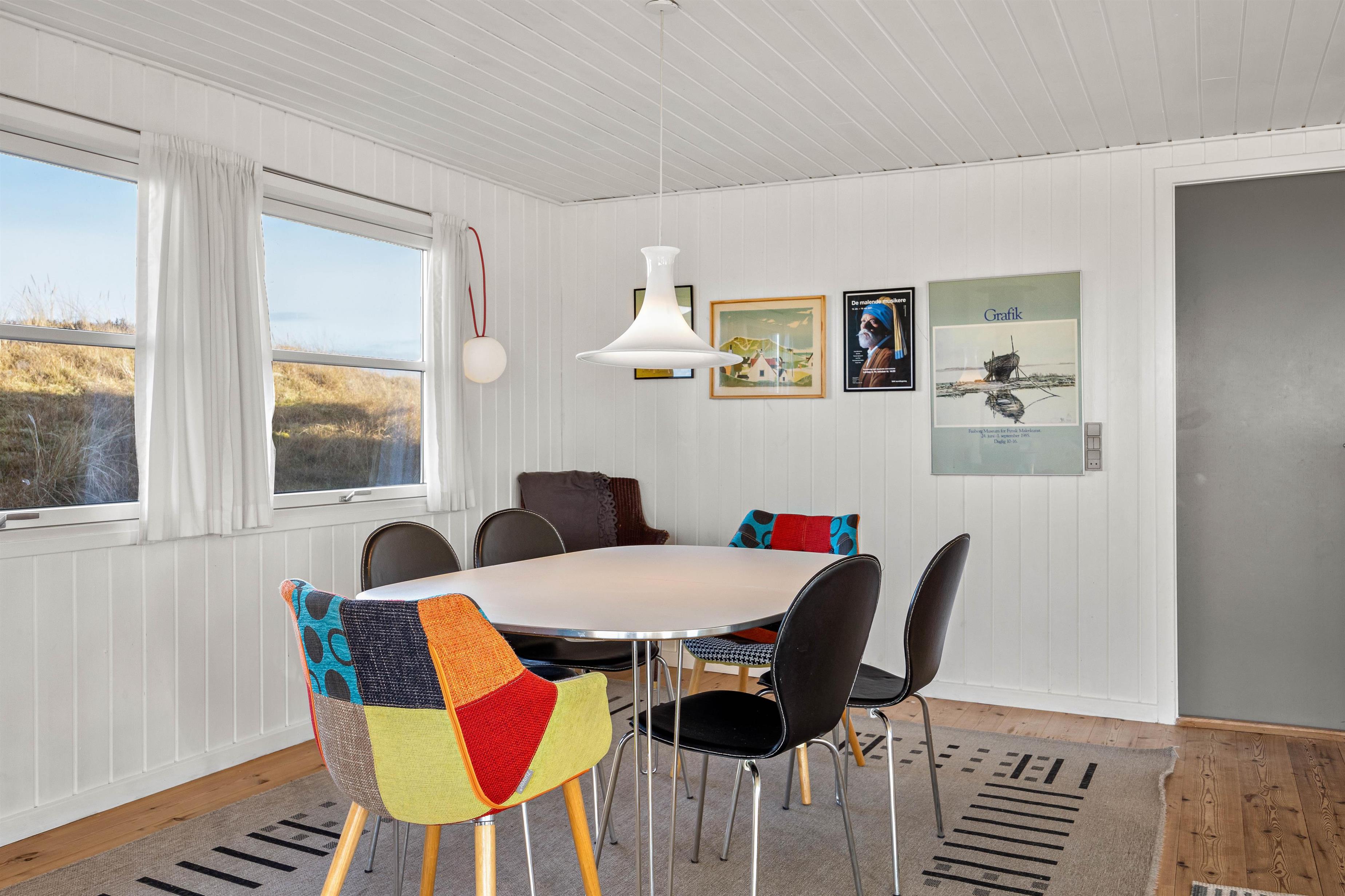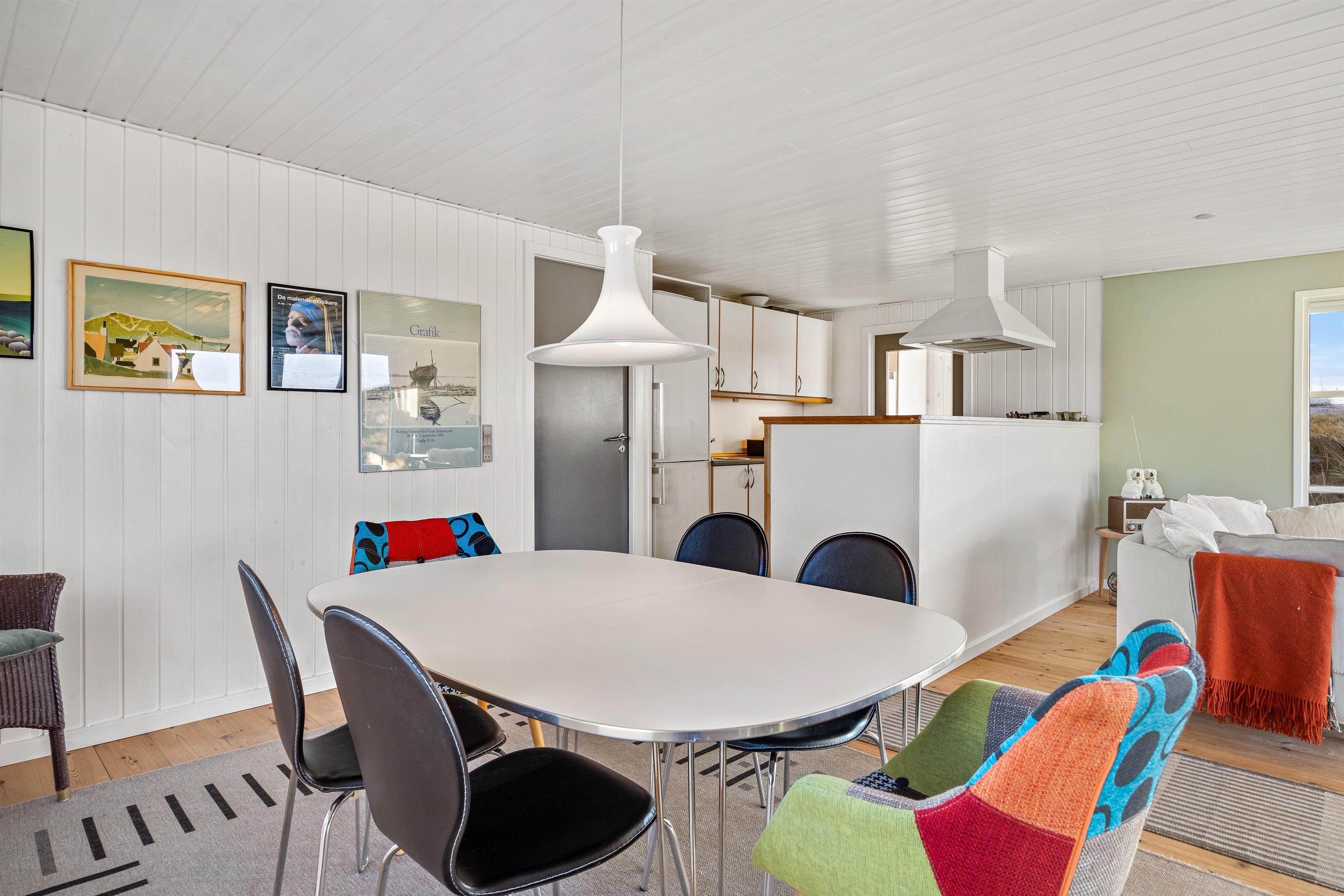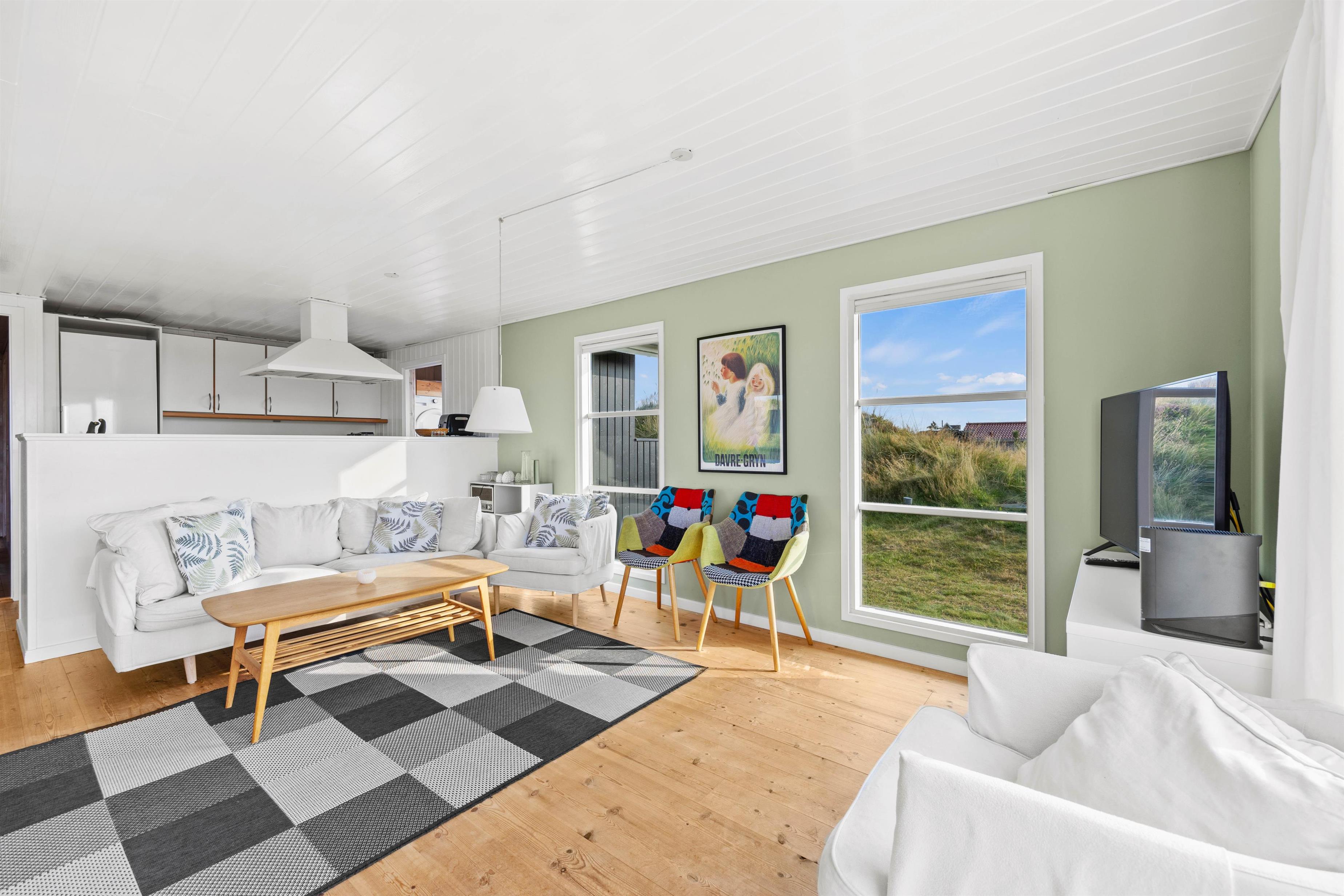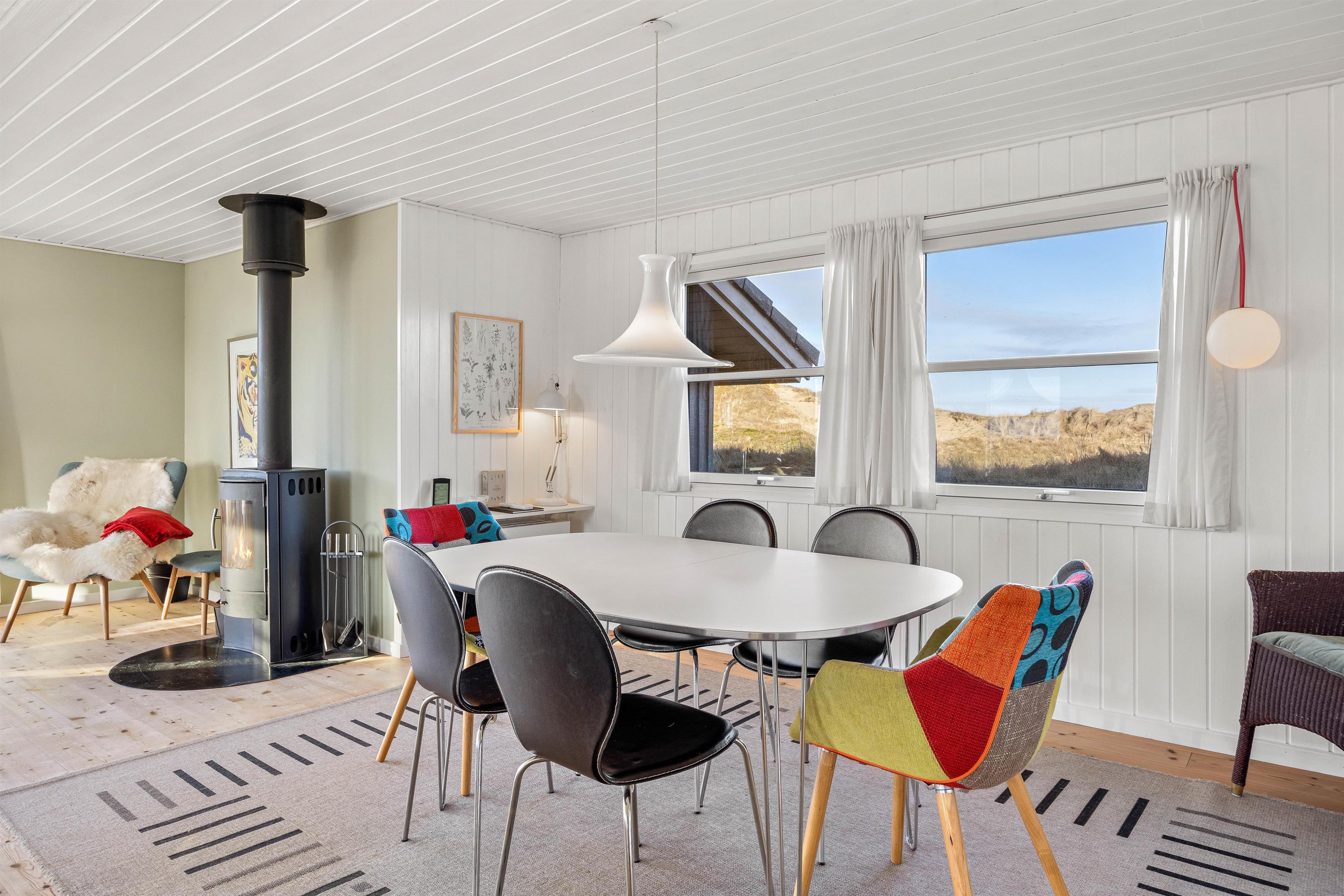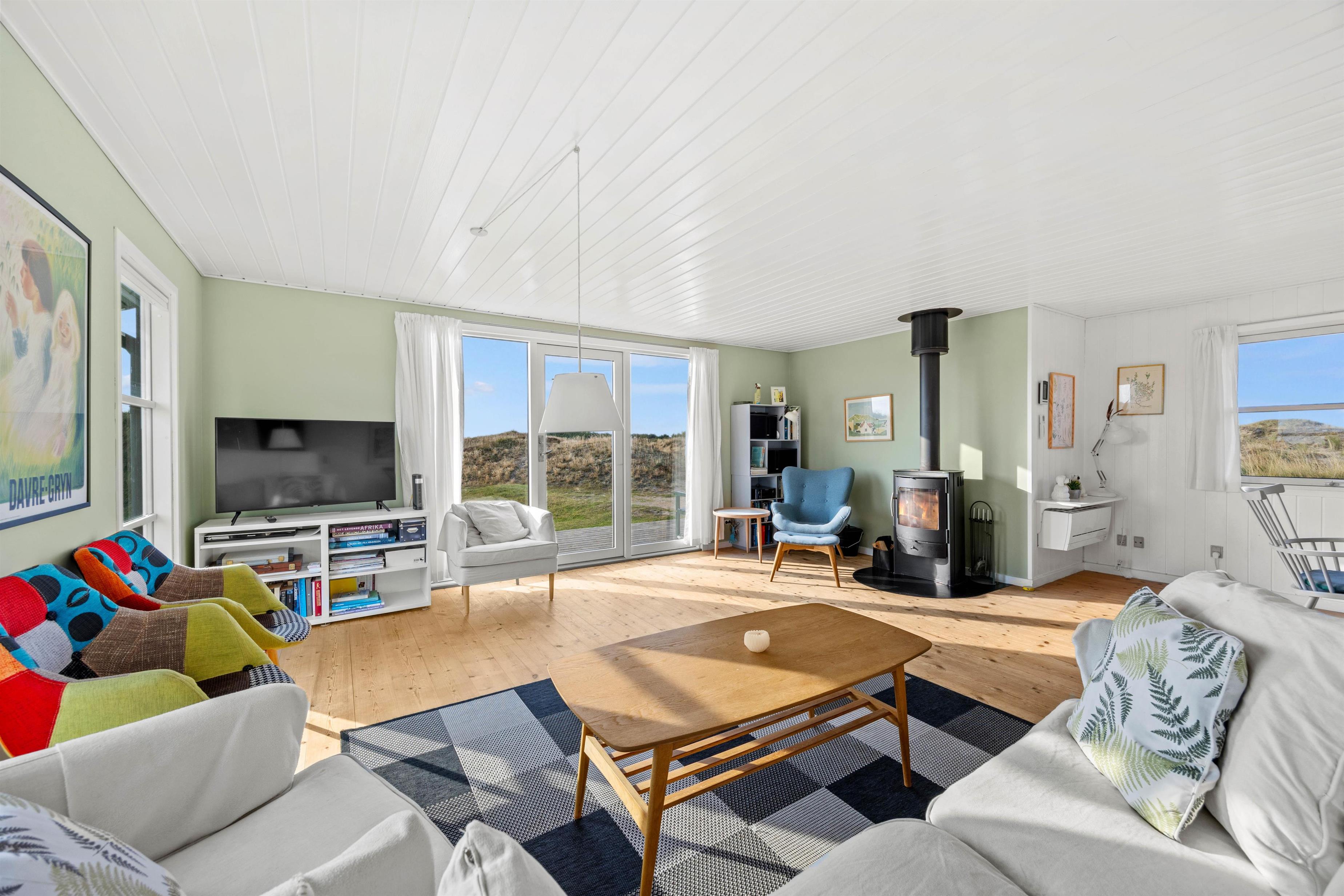 Når hele ferieflokken samles til hyggelige stunder, er alrummet med de mange vinduer og lysindfald oplagt at samles i til diverse aktiviteter. Her kan I lave det hele sammen i indbydende omgivelser med en lys skandinavisk indretning, lige fra en omgang brætspil til at tænde for en god film på tv’et. Kom helt ned i gear, mens brændeovnen spreder sin hyggelige, knitrende varme. Desuden er varmepumpen med til at opretholde en energivenlig ferie og et godt indeklima.