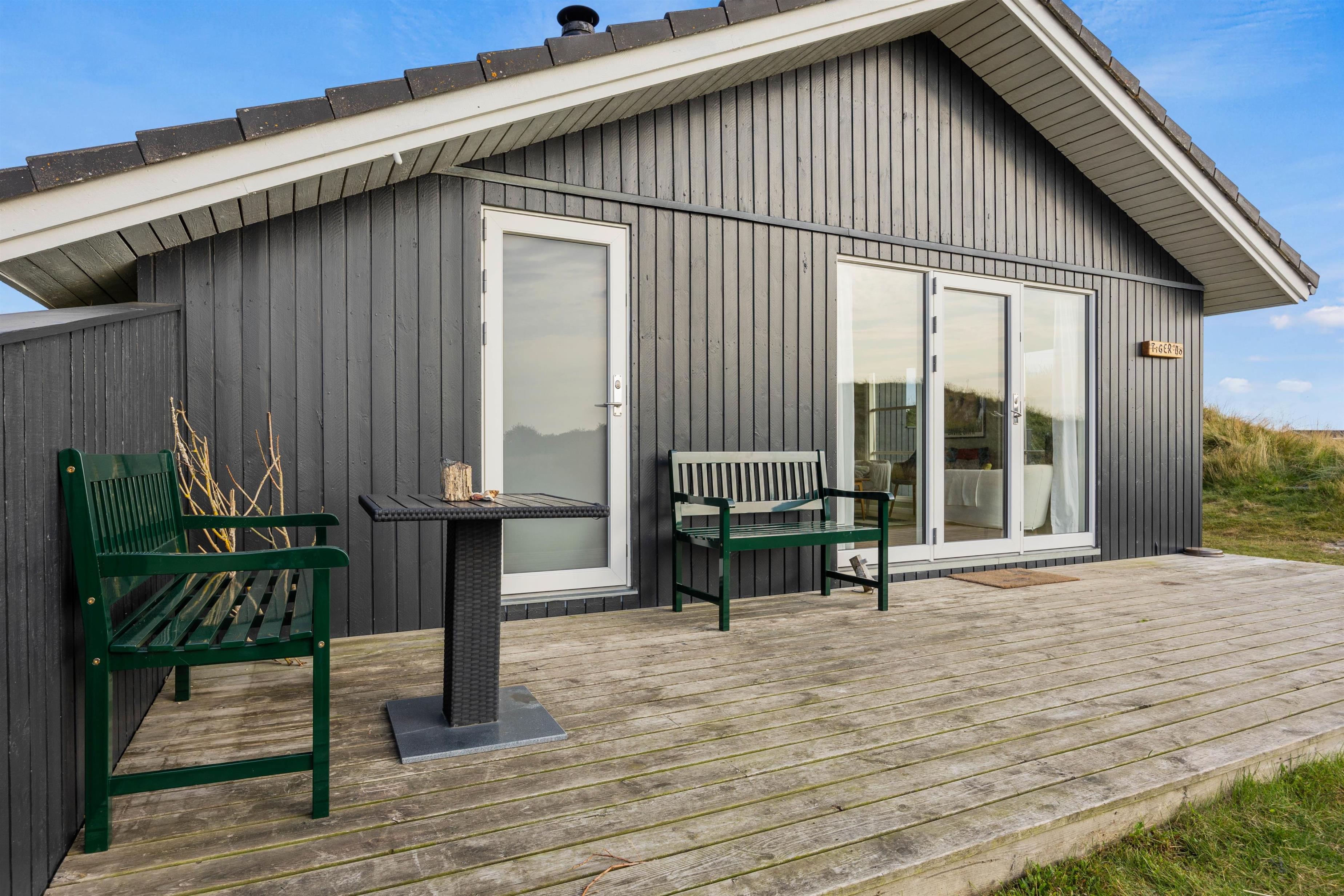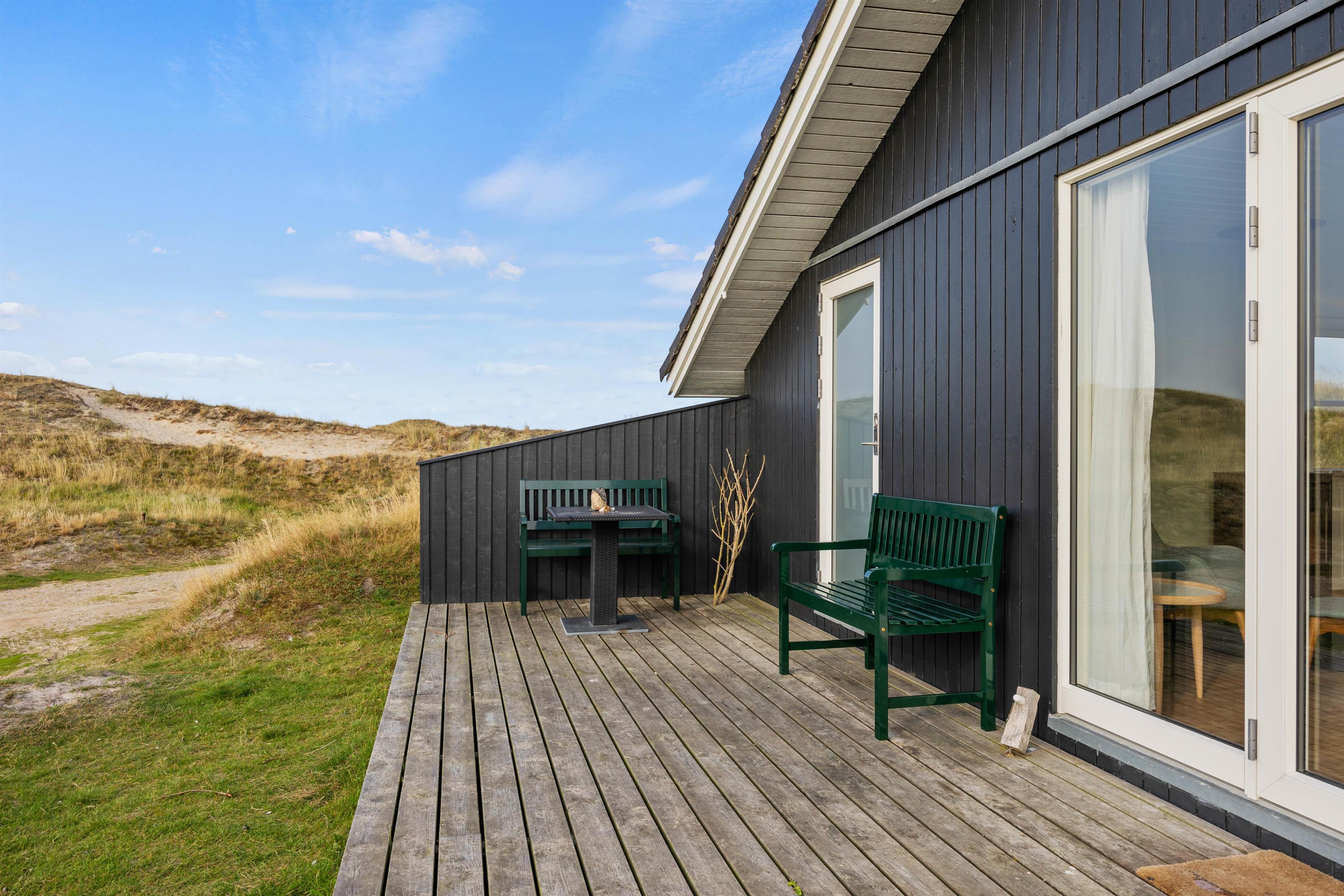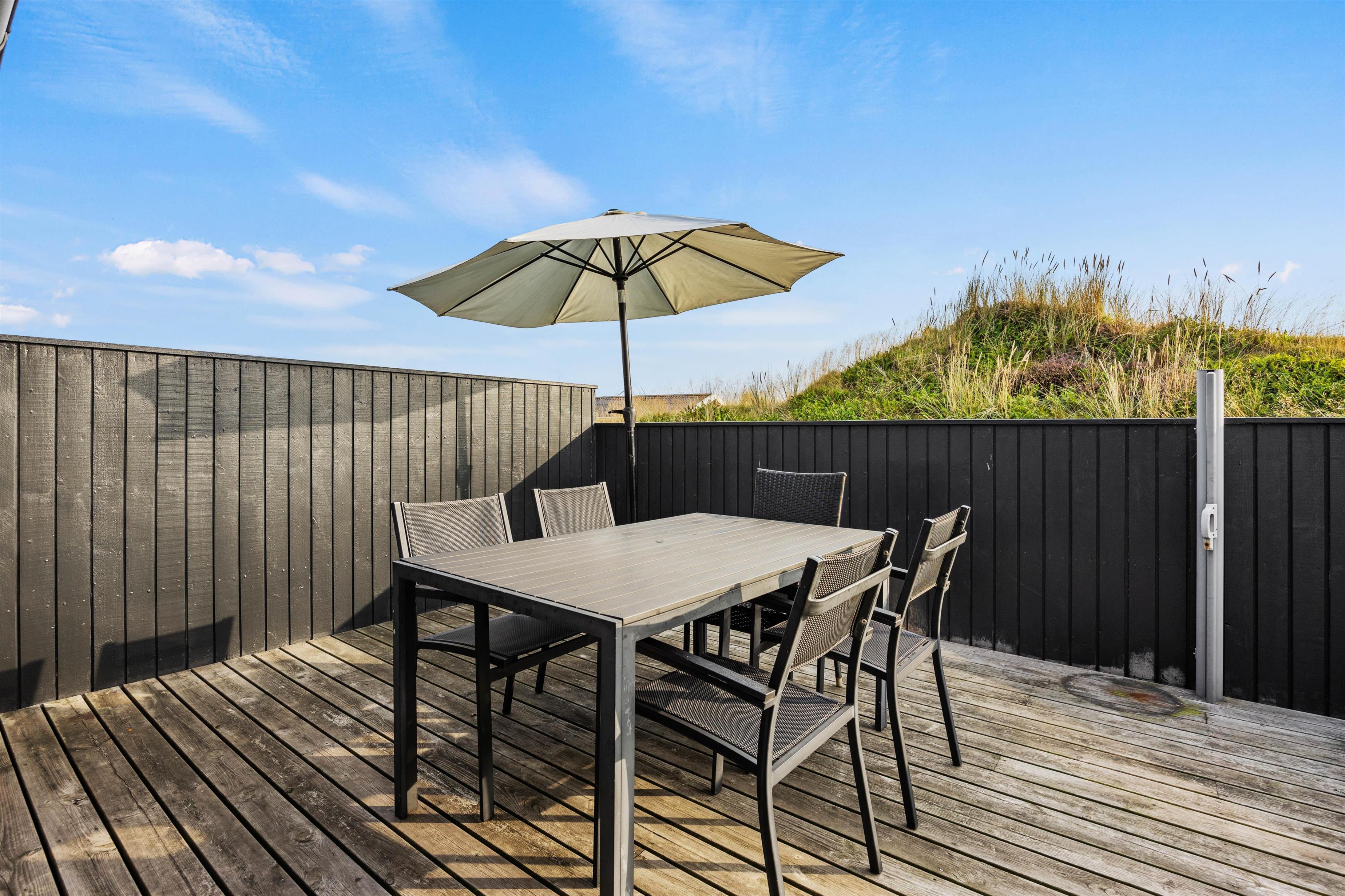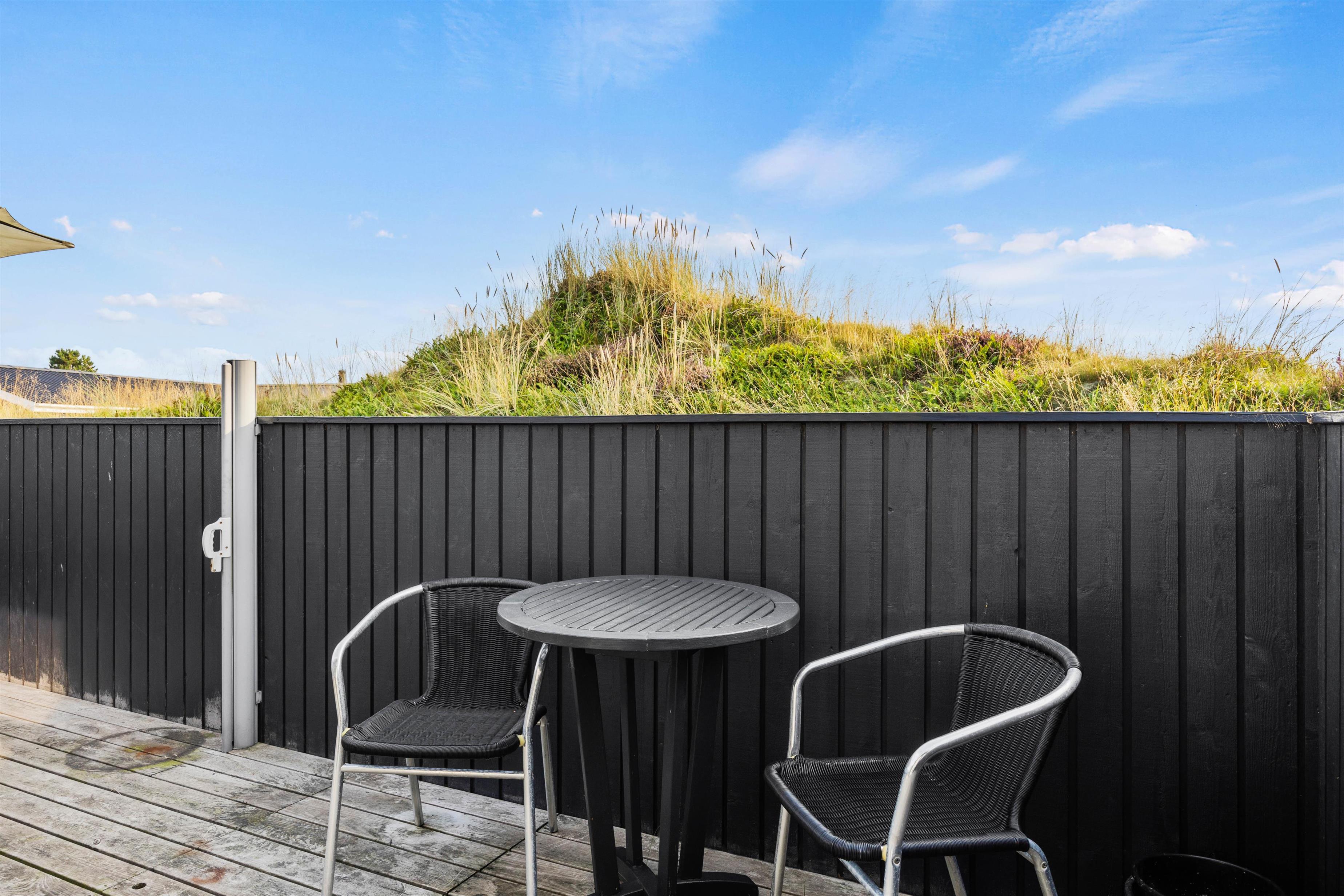 På udeområdet har I også 2 dejlige terrasser, hvor I kan sidde i læ og dase i havemøbler og liggestole, og om aftenen kan I samles på terrasserne til en lækker middag, der kan tilberedes på gasgrillen.