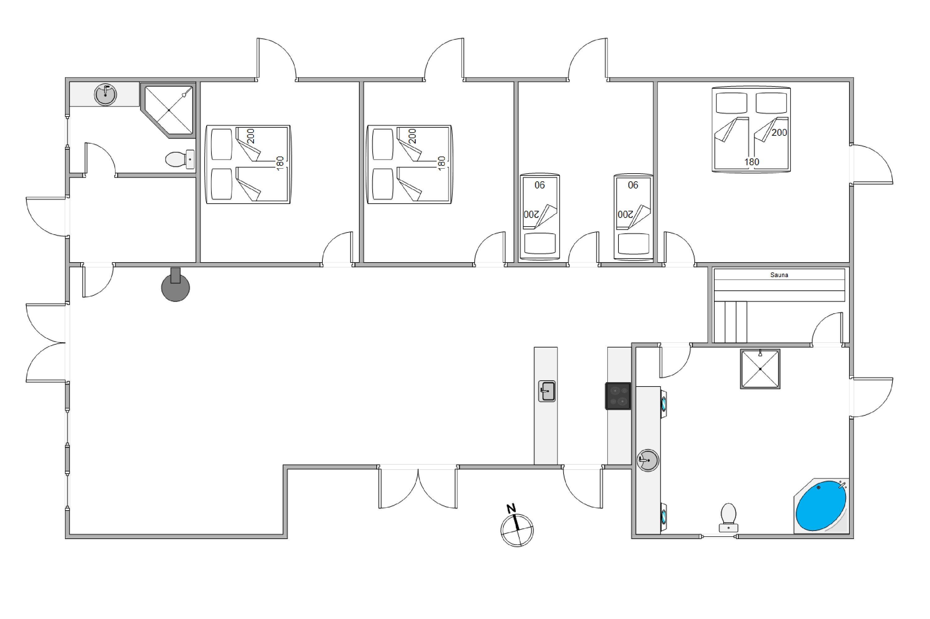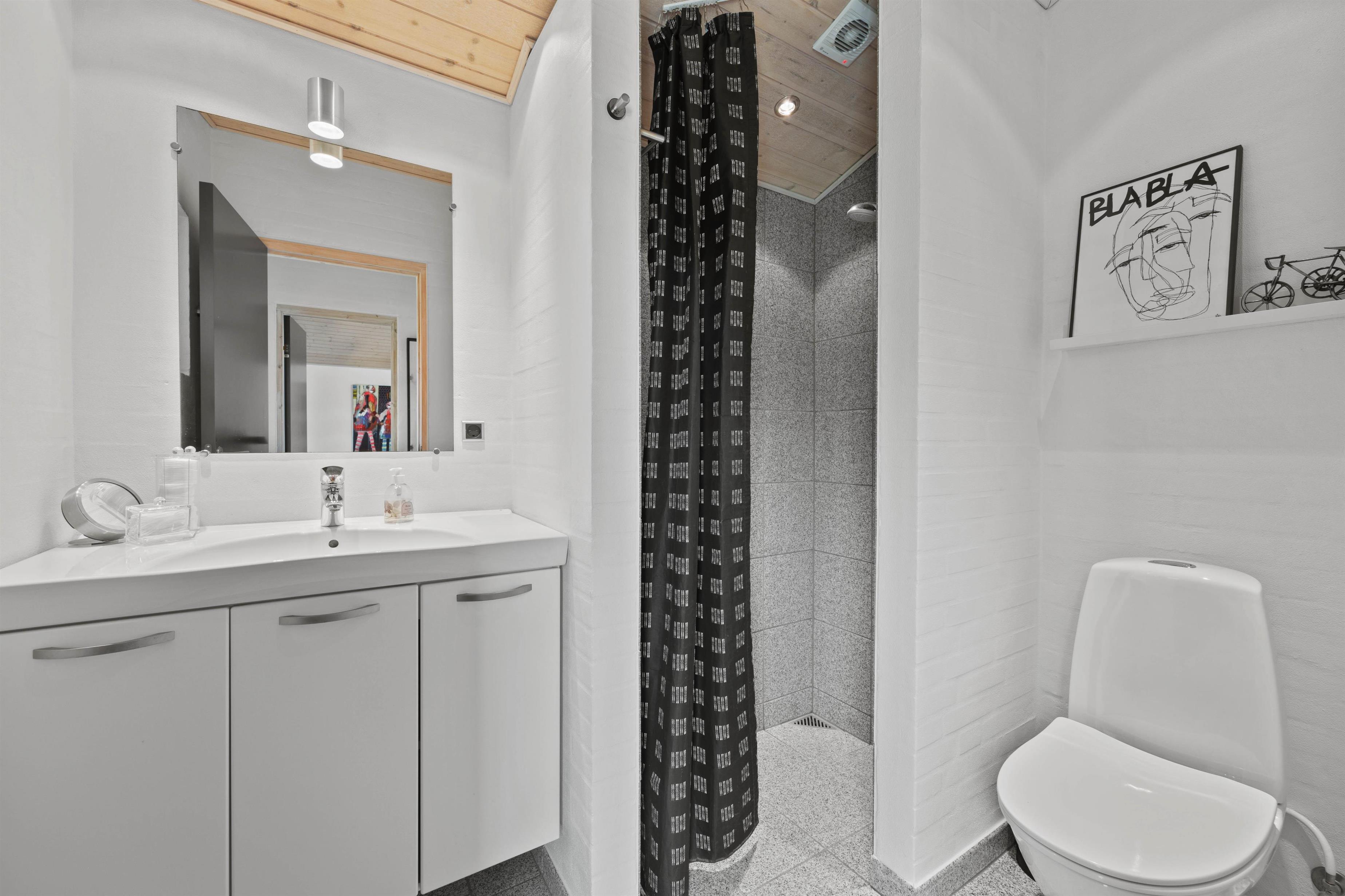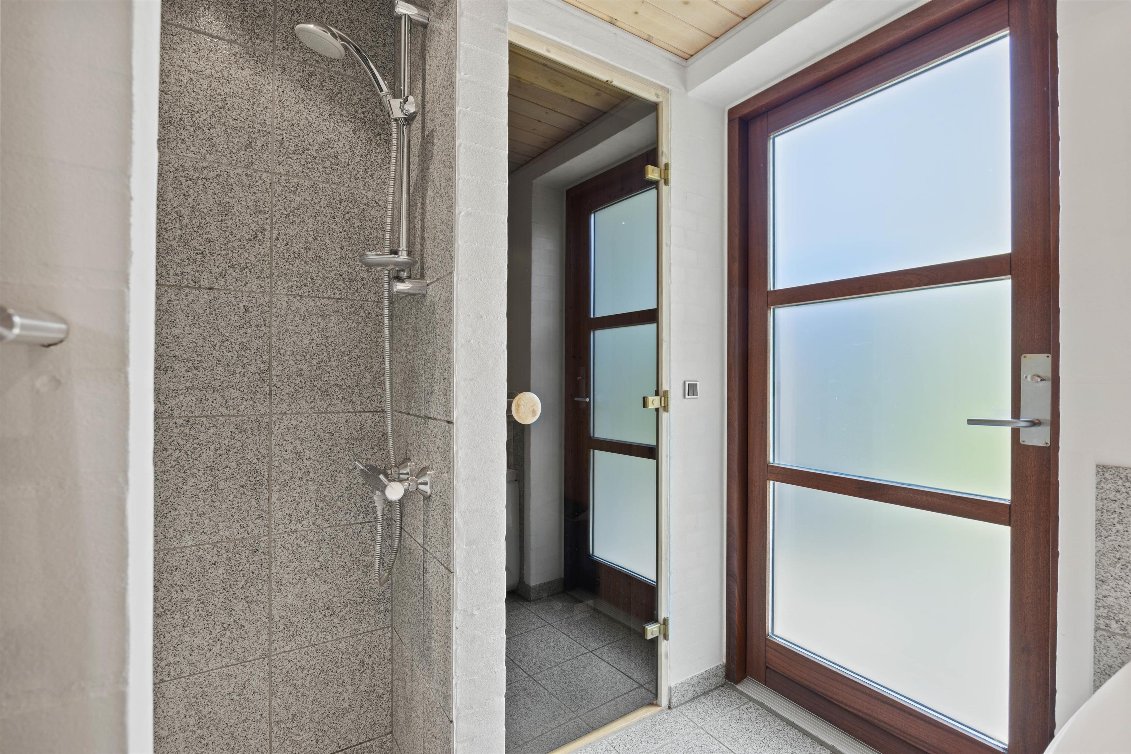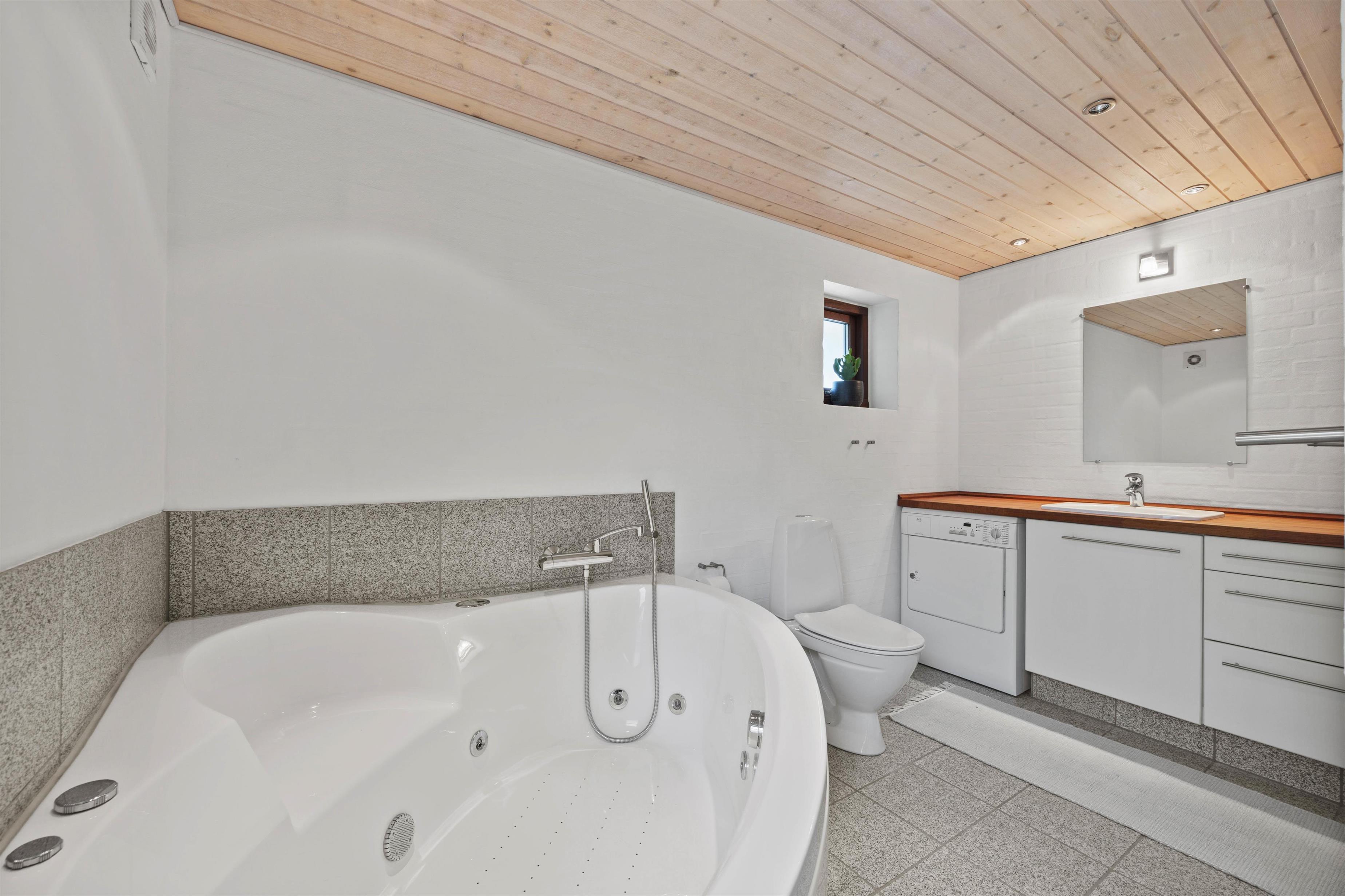 Sommerhusets ene badeværelse er udstyret med sauna og boblebad, perfekte til en afslappende stund. Også her finder I både vaskemaskine og tørretumbler, der sørger for at friske håndklæderne op under feriens løb.