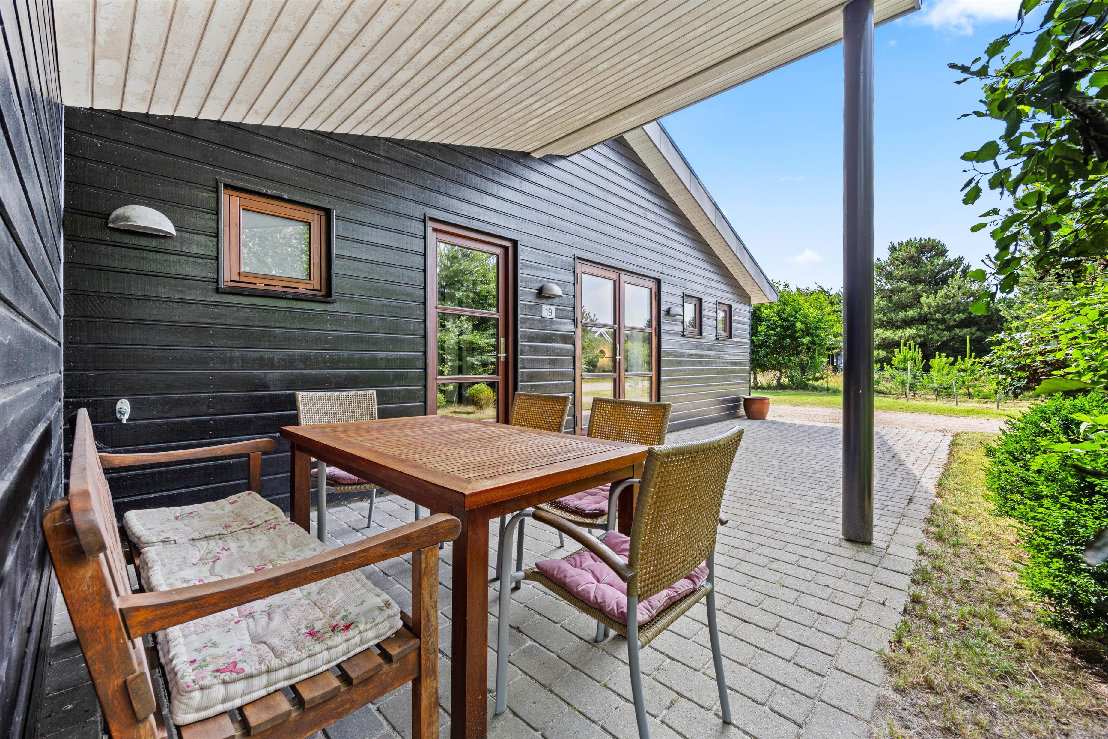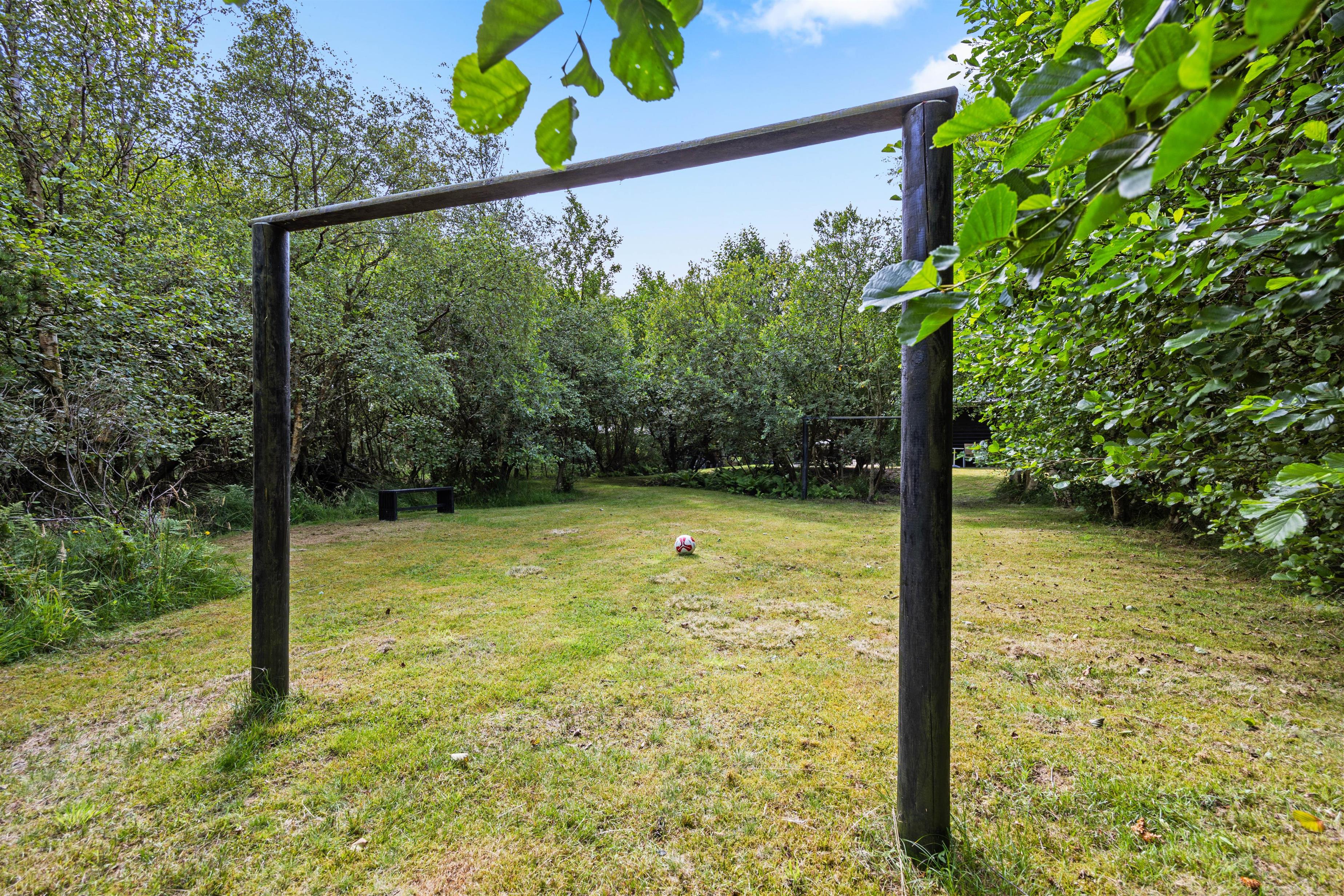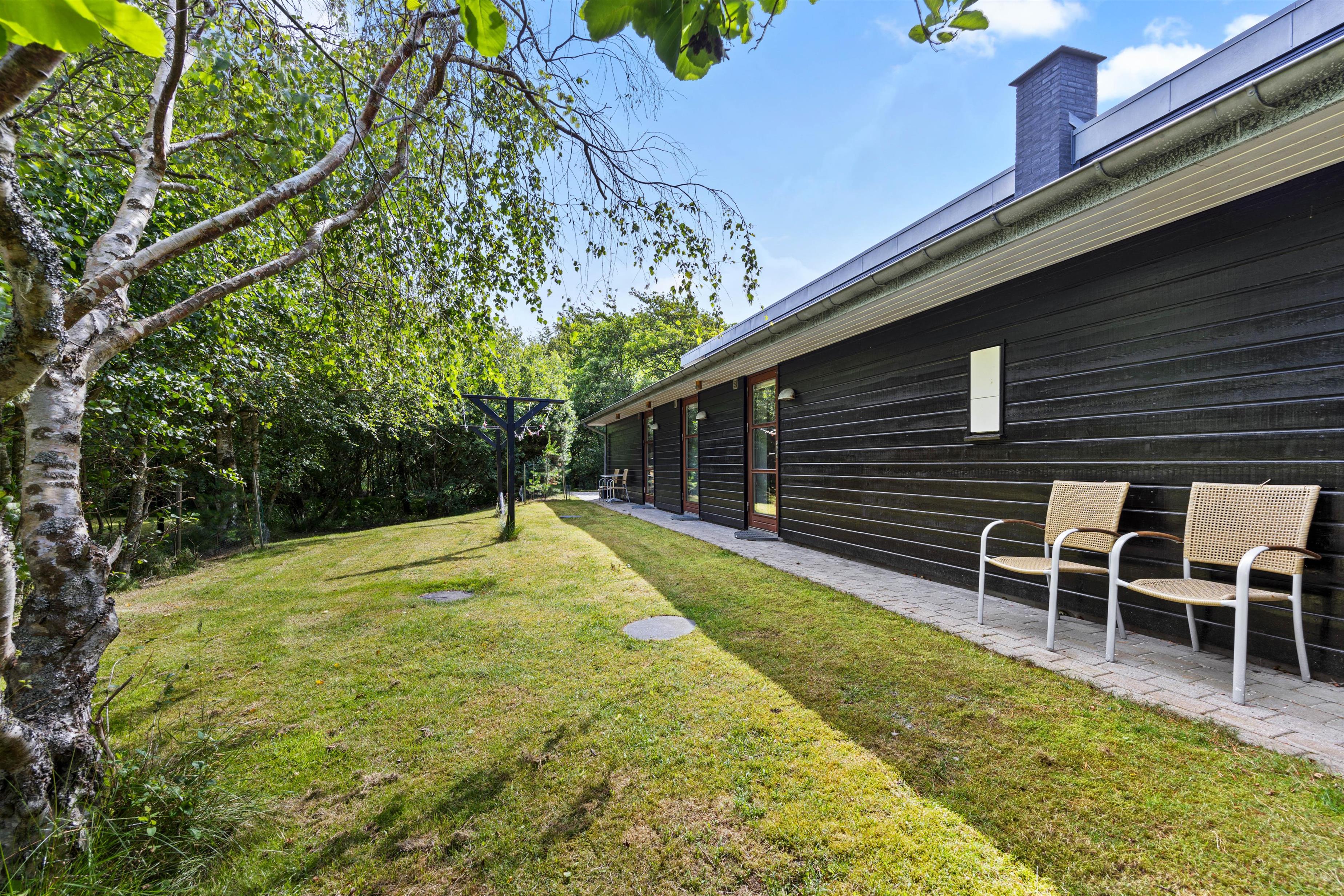 Den overdækkede terrasse og den naturskønne grund omkring feriehuset tilbyder masser af muligheder for at nyde ferien i det fri. Her kan I arrangere hyggelige grillaftner, slappe af i solen eller spille spil. Mon ikke I også kan få arrangeret en fodboldkamp eller lignende på den grønne plæne?