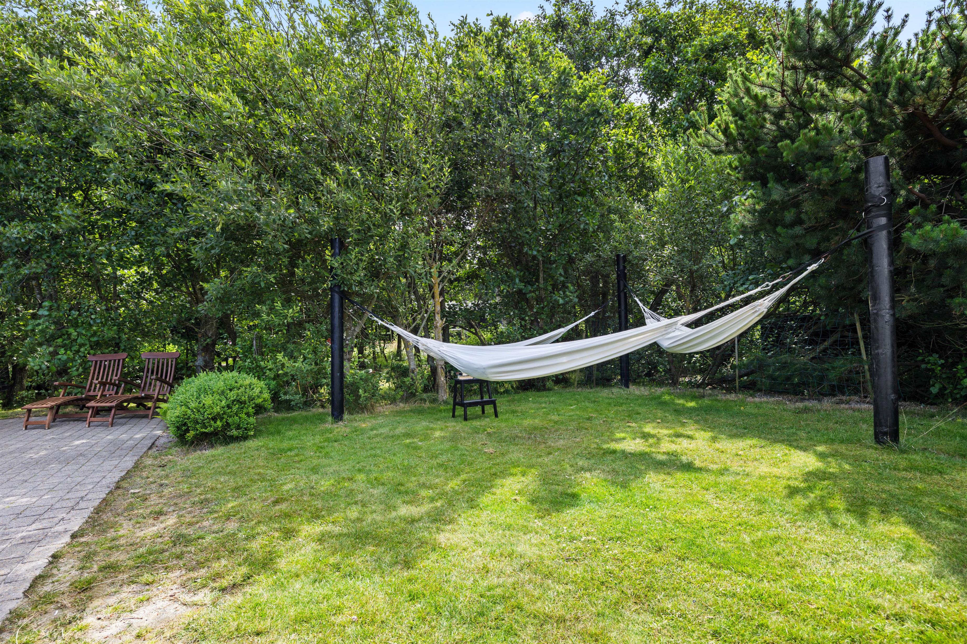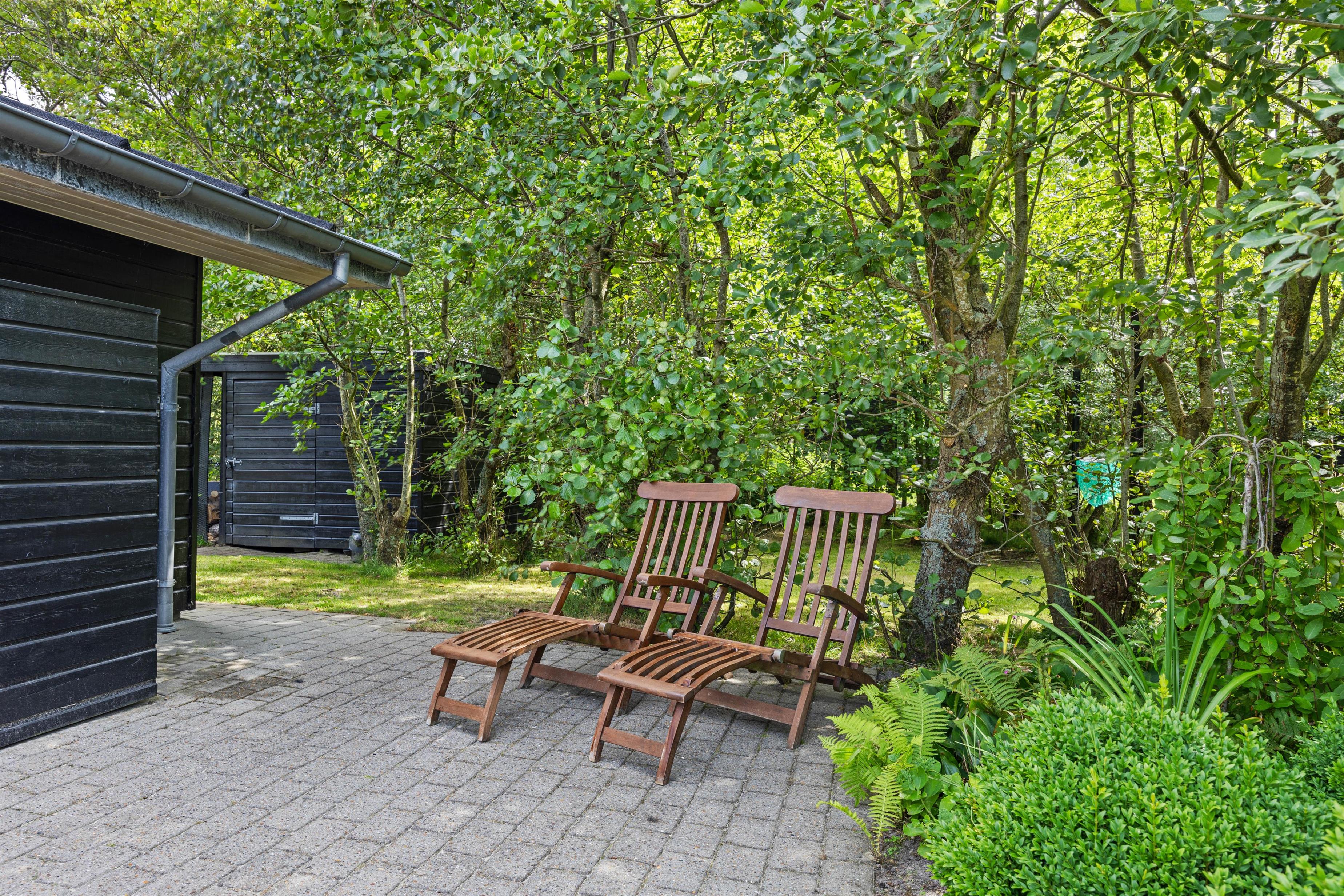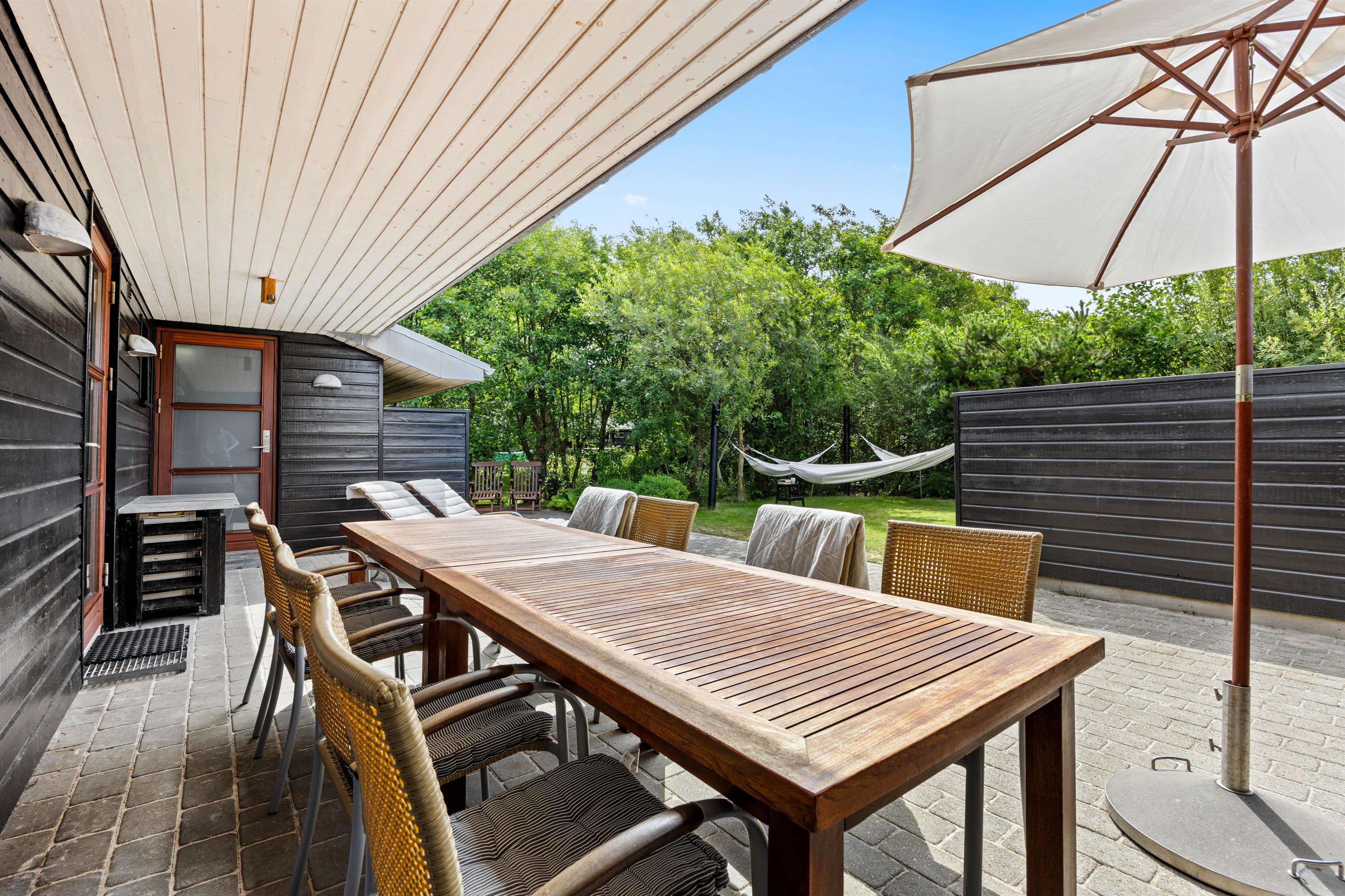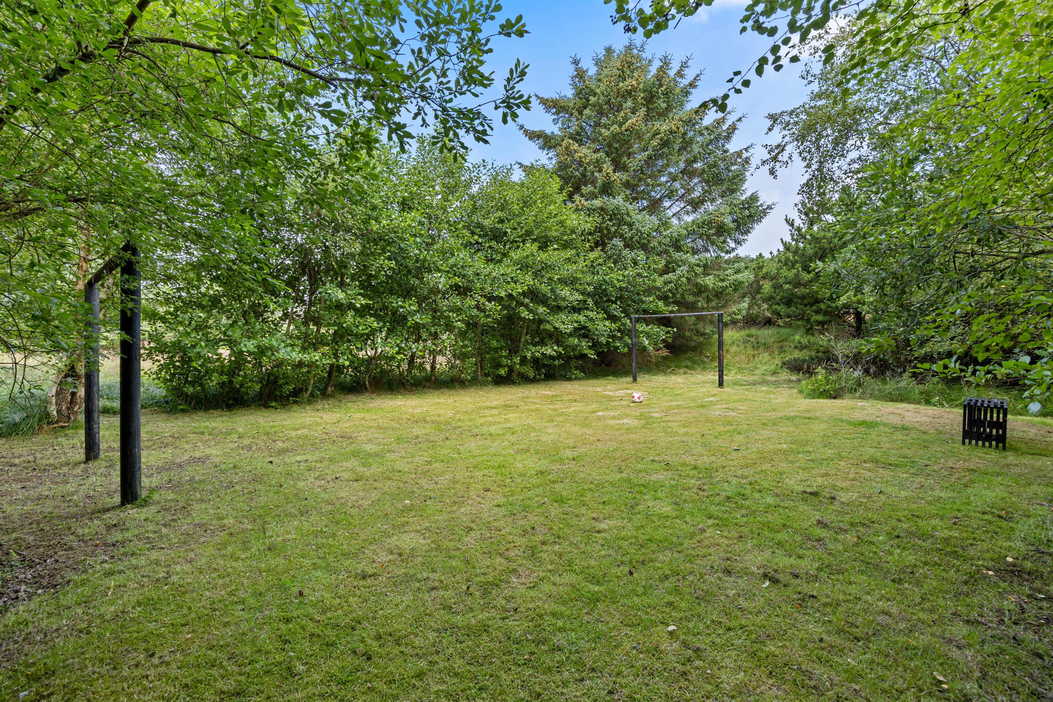 Den overdækkede terrasse og den naturskønne grund omkring feriehuset tilbyder masser af muligheder for at nyde ferien i det fri. Her kan I arrangere hyggelige grillaftner, slappe af i solen eller spille spil. Mon ikke I også kan få arrangeret en fodboldkamp eller lignende på den grønne plæne?