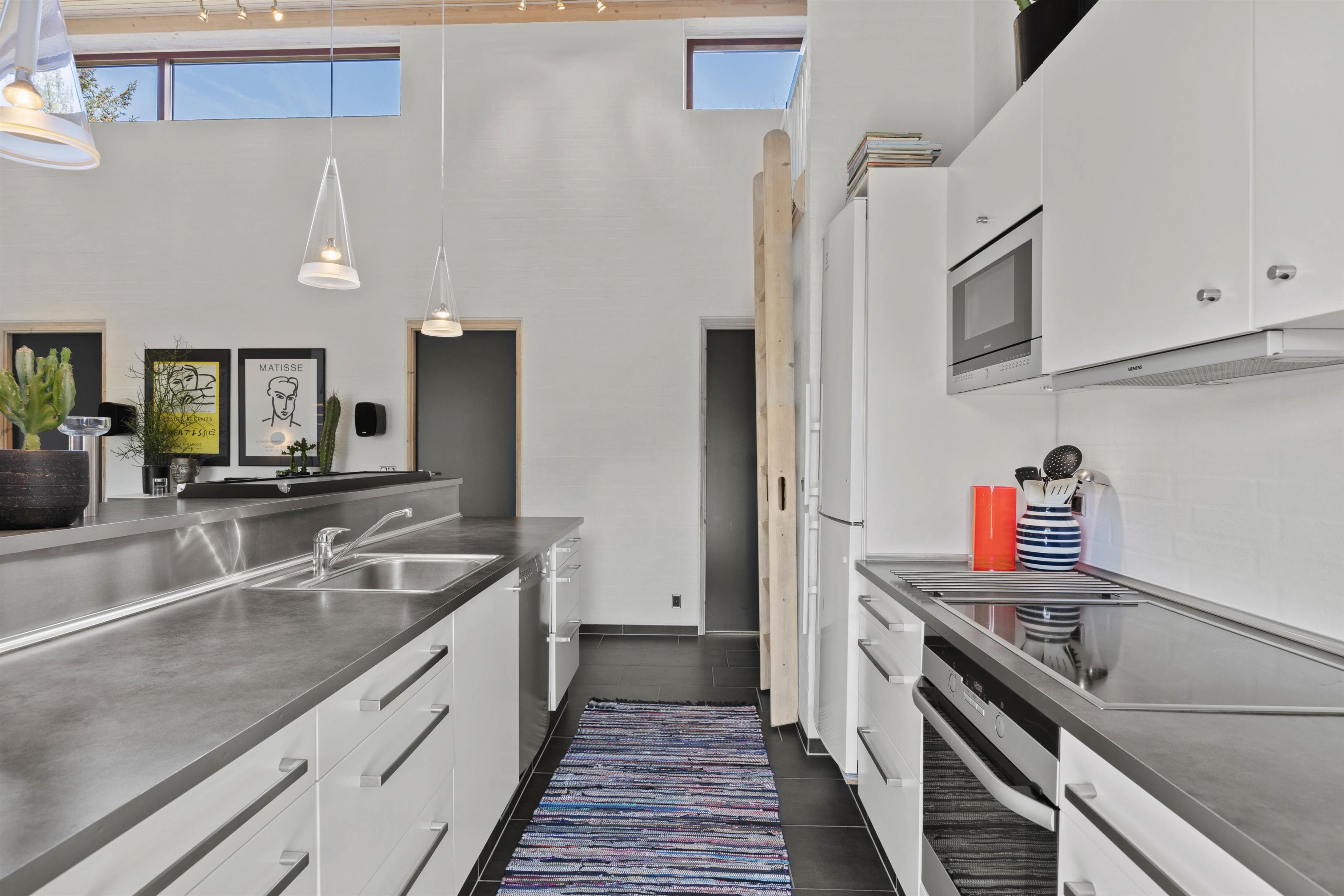 I hjertet af Skovly 19 er den rummelige stue med brændeovnen, der indbyder til afslapning og samvær. Her kan familie og venner samles omkring varmen fra ilden eller nyde en film via Chromecast efter en aktiv dag. Her er højt til loftet og en moderne indretning, der sammen skaber en behagelig atmosfære. I forlængelse af stuen finder I det lange spisebord og et samtalekøkken, hvor I sammen kan skabe nogle gode retter, der samler familien om bordet.