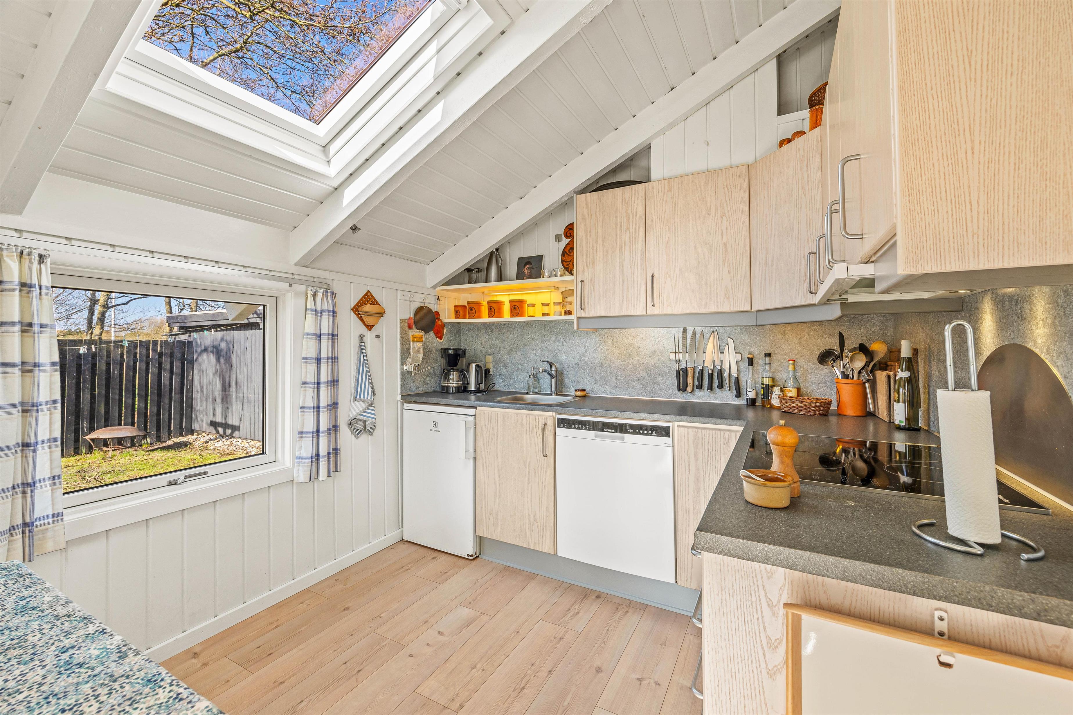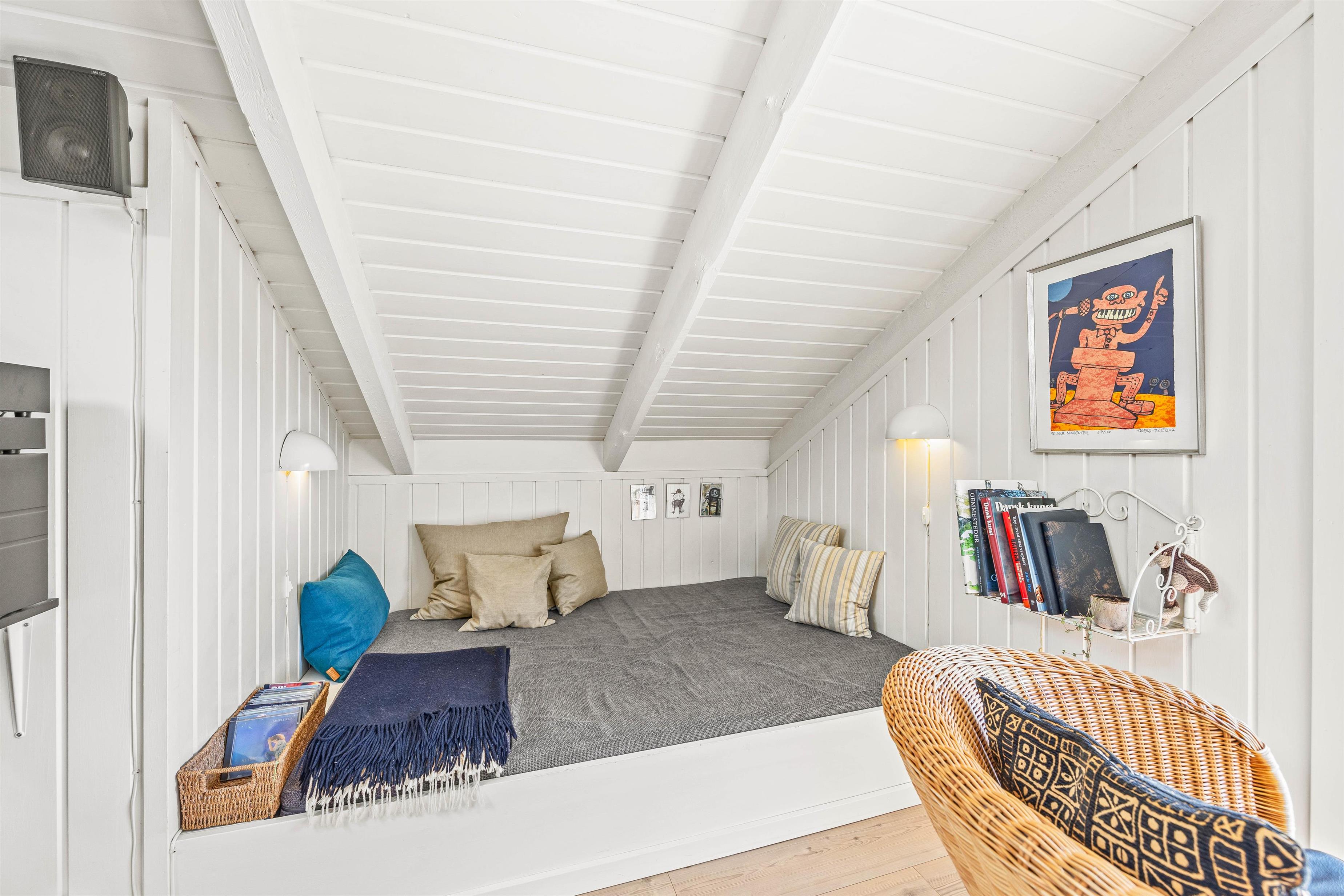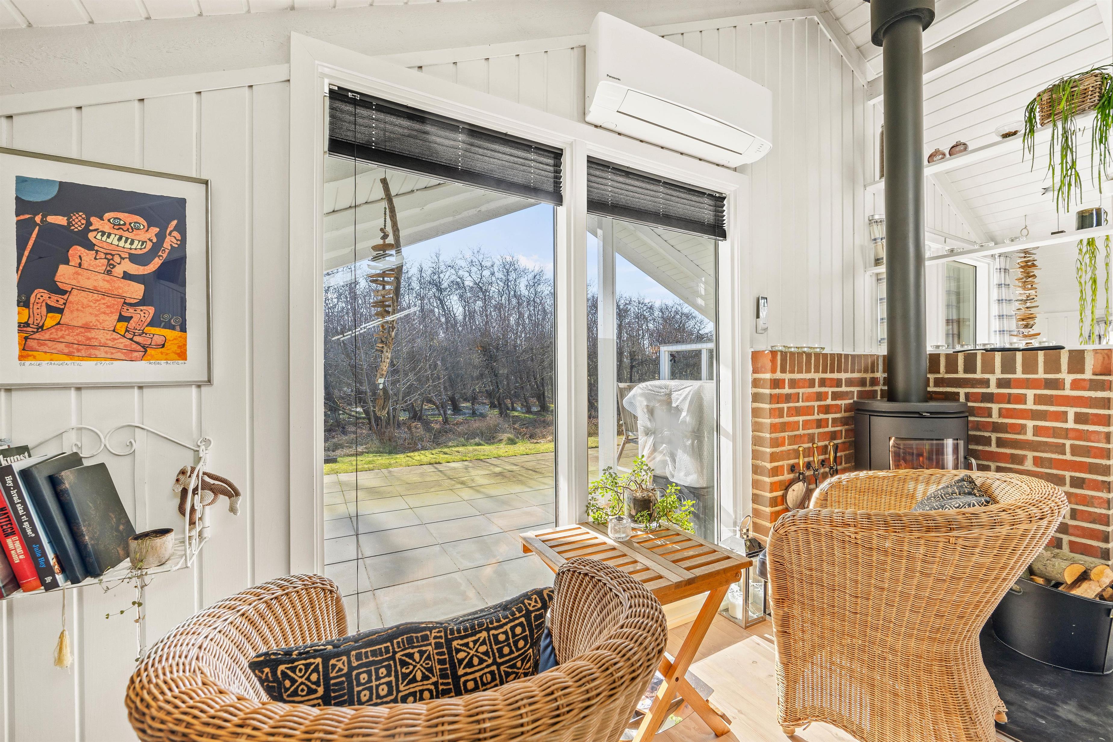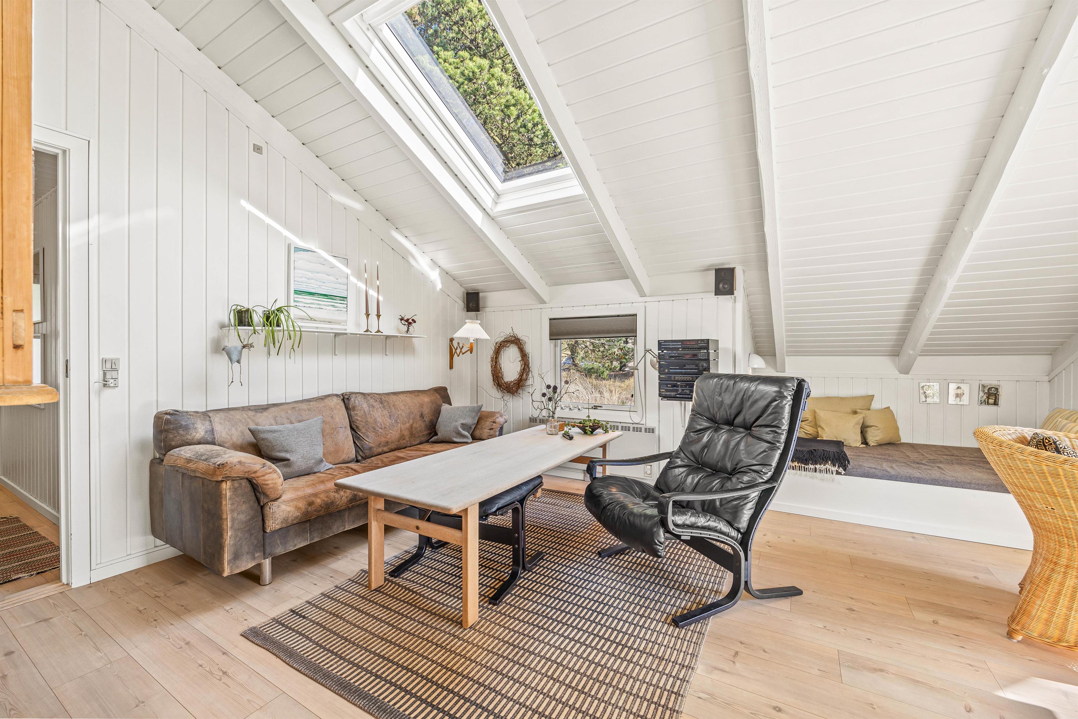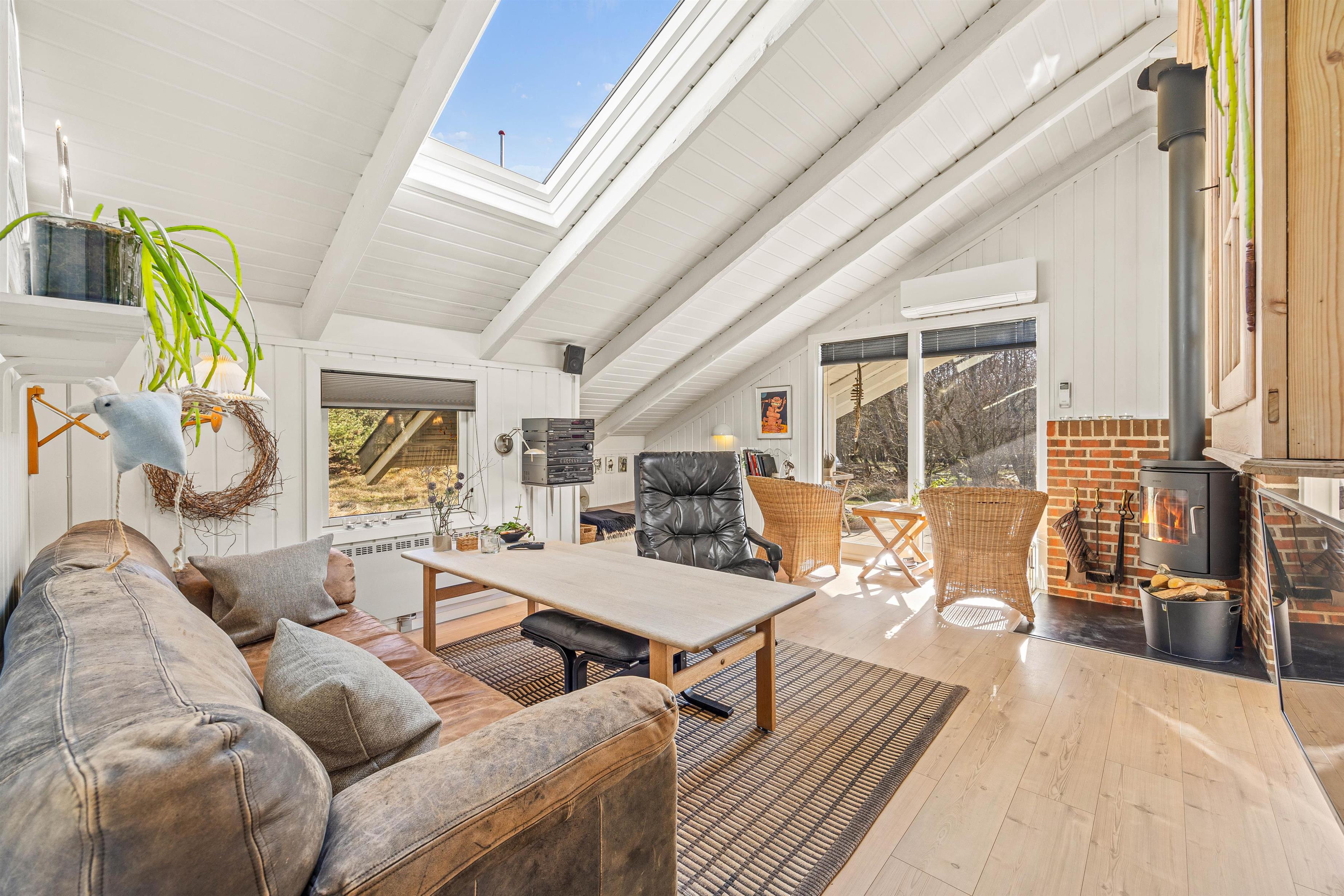 Hjerterummet i sommerhuset er den hyggelige stue med loft til kip og en fin indretning med sans for detaljerne. Her kan I sætte jer godt til rette i sofaen, mens brændeovnen knitrer, og I ser en god film i fjernsynet. Sommerhuset har danske tv-kanaler. Her er også en alkove til afslapning, og som et ekstra plus er der en energibesparende varmepumpe i feriehuset.