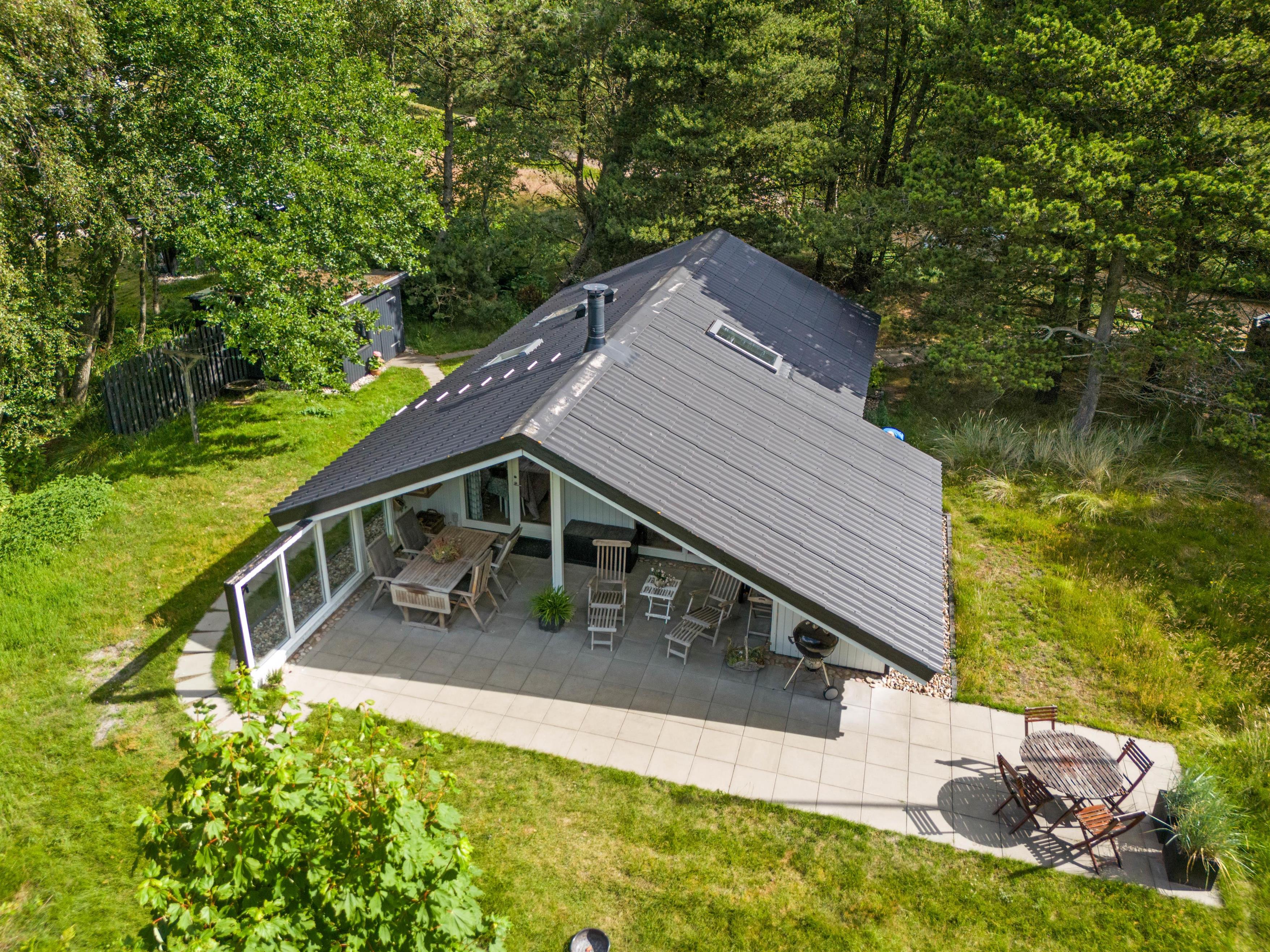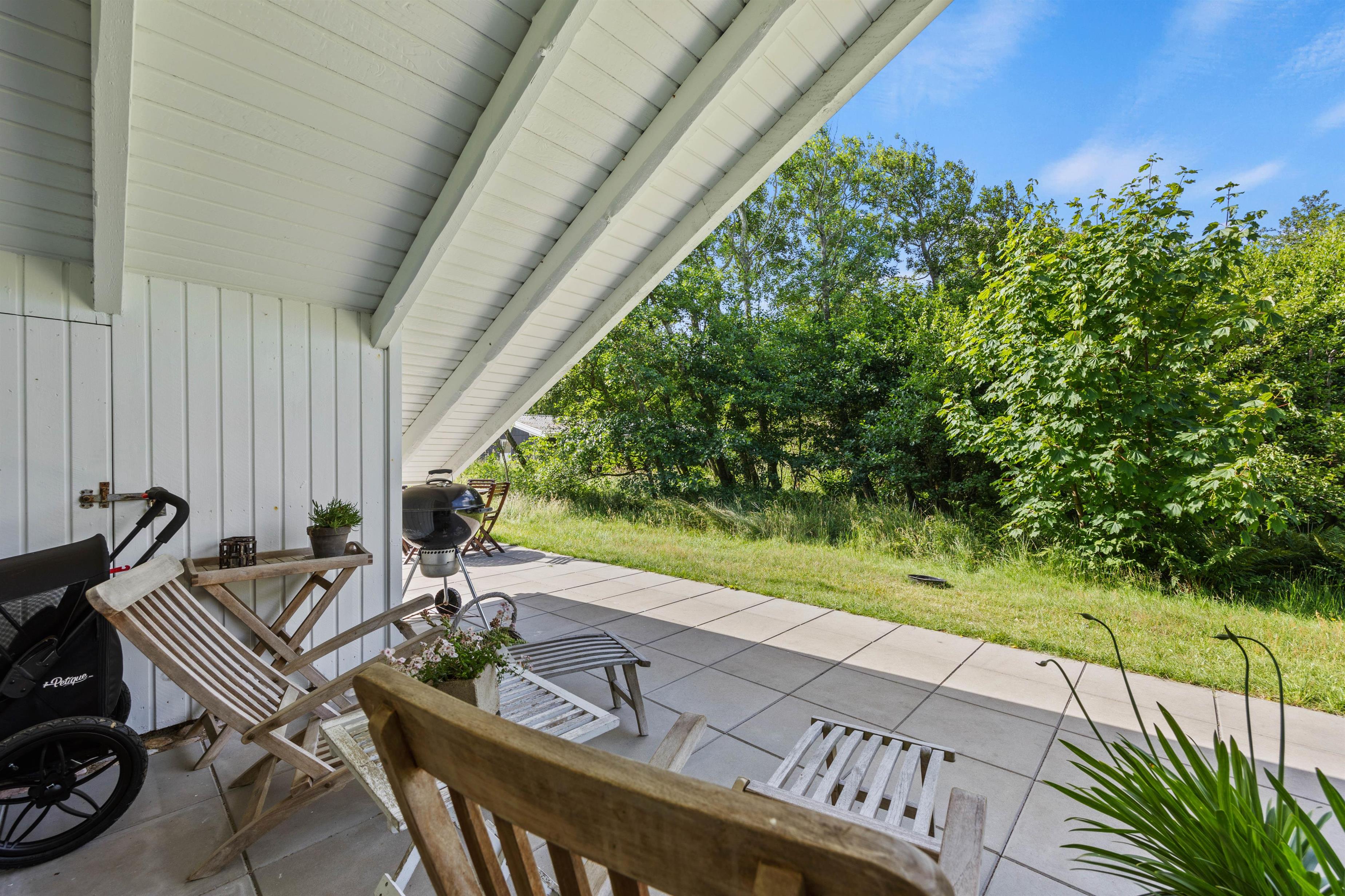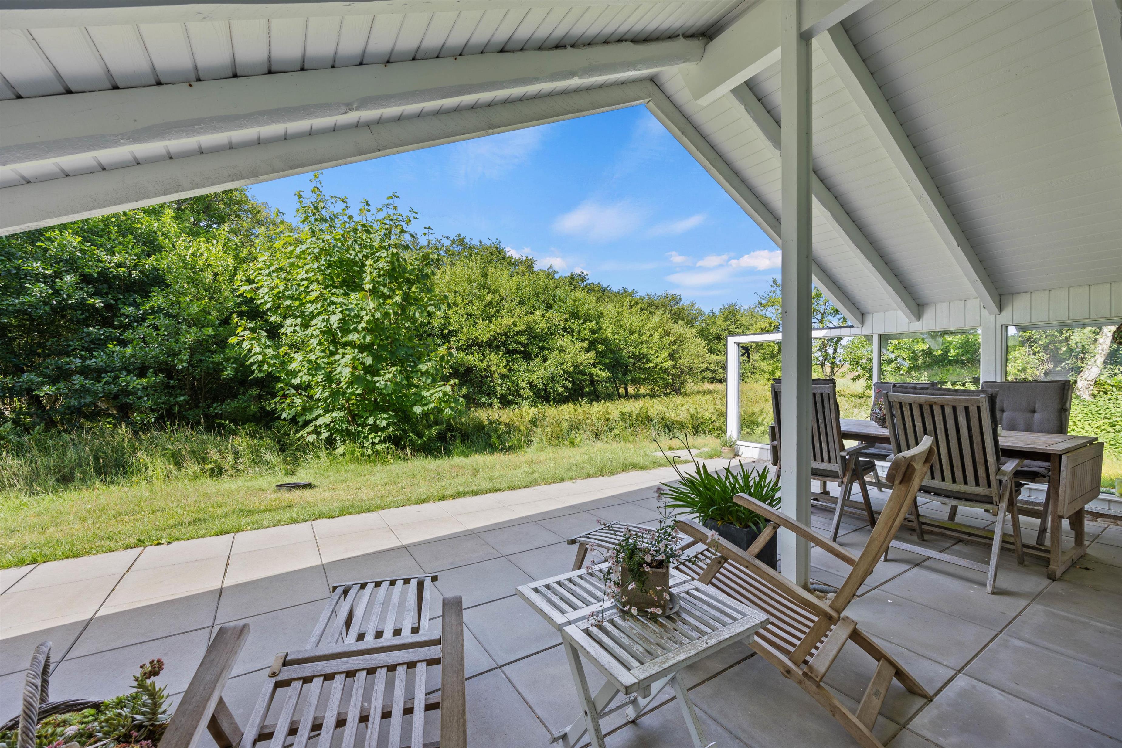 Sommerhuset ligger på en 1900 m2 stor naturgrund omgivet af buske og træer. Her kan I nyde privatlivet på den store terrasse, som er delvist overdækket og afskærmet. Terrassen strækker sig fra østsiden, mod syd og helt om til den vestlige side af sommerhuset, så I hele dagen har mulighed for at nyde varmen fra sommersolen.