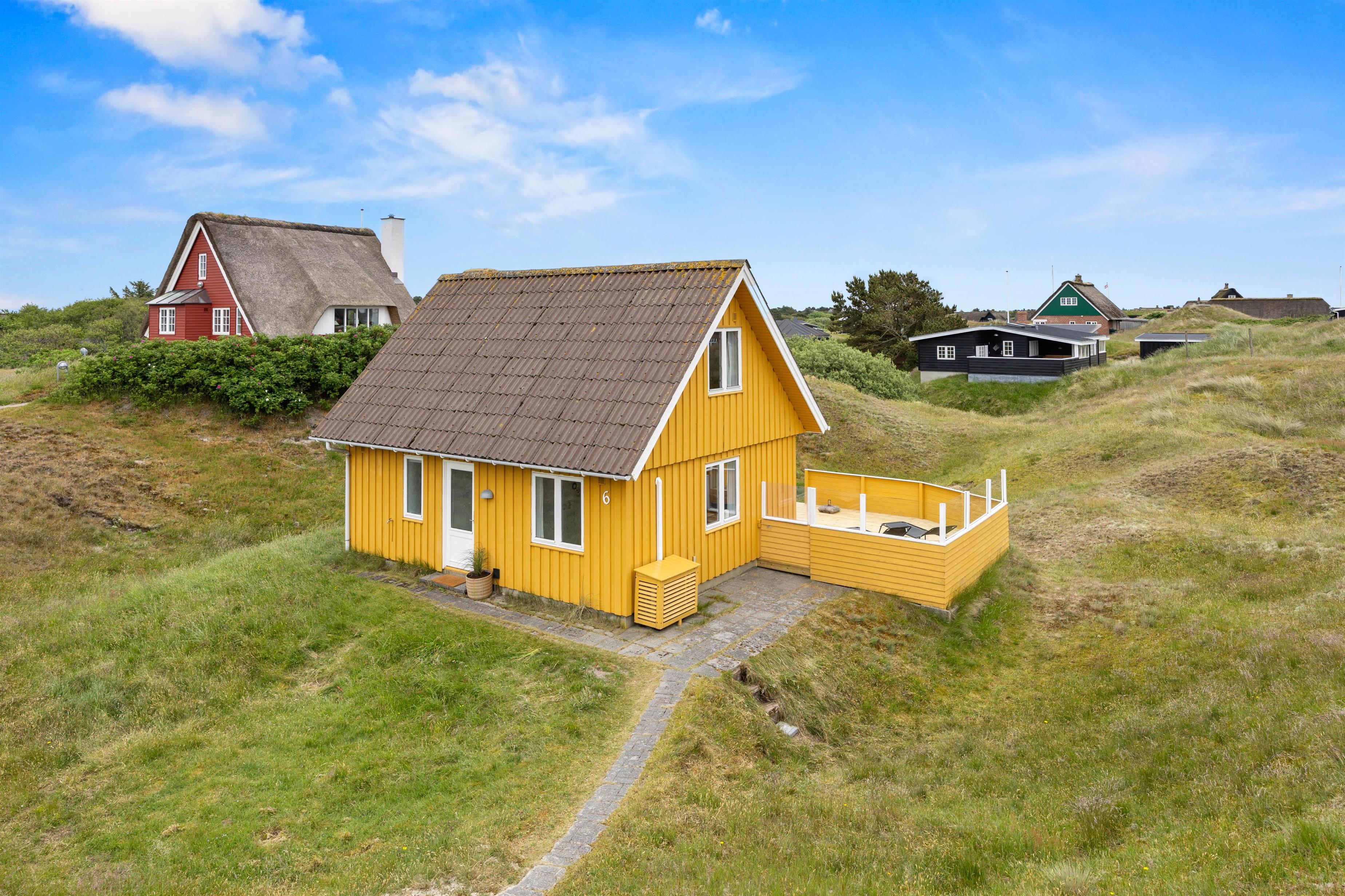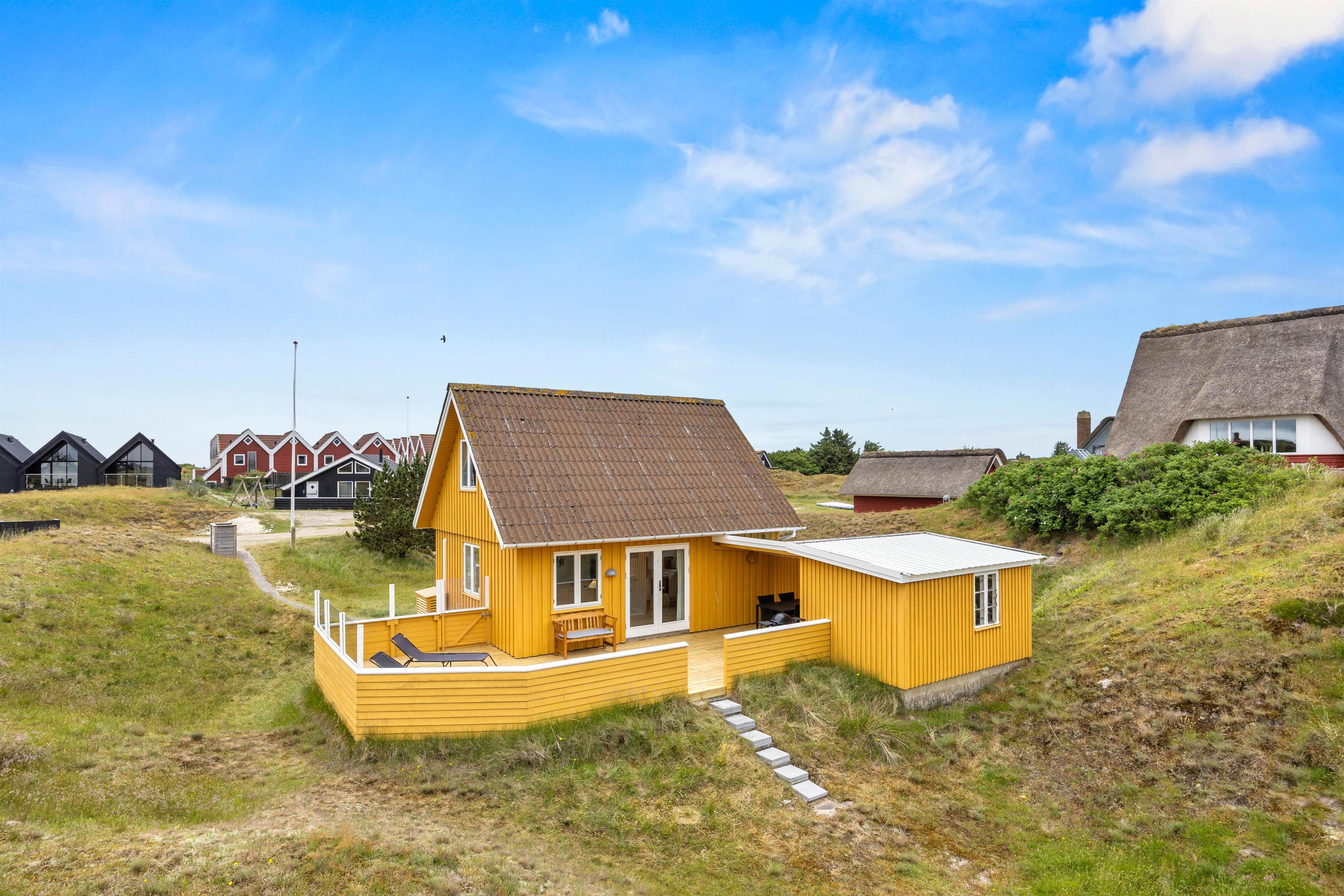 Selvom sommerhuset er naturskønt placeret, ligger det ikke langt fra alfarvej. Indkøbsmulighederne er kun 1300 meter væk, så I nemt kan købe ind til jeres ophold uden besvær. Dette gør det bekvemt at lave hjemmelavede måltider i sommerhusets veludstyrede køkken og nyde dem på terrassen med udsigt til klitterne.