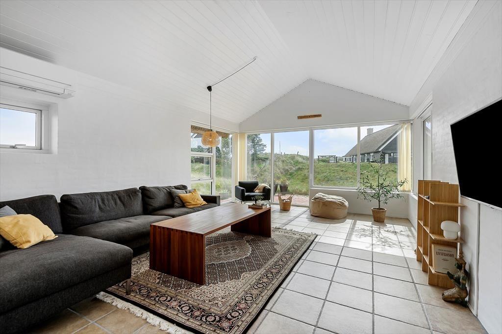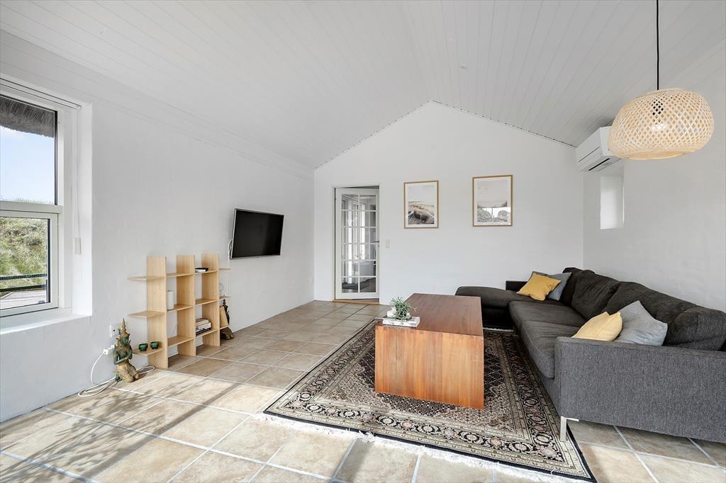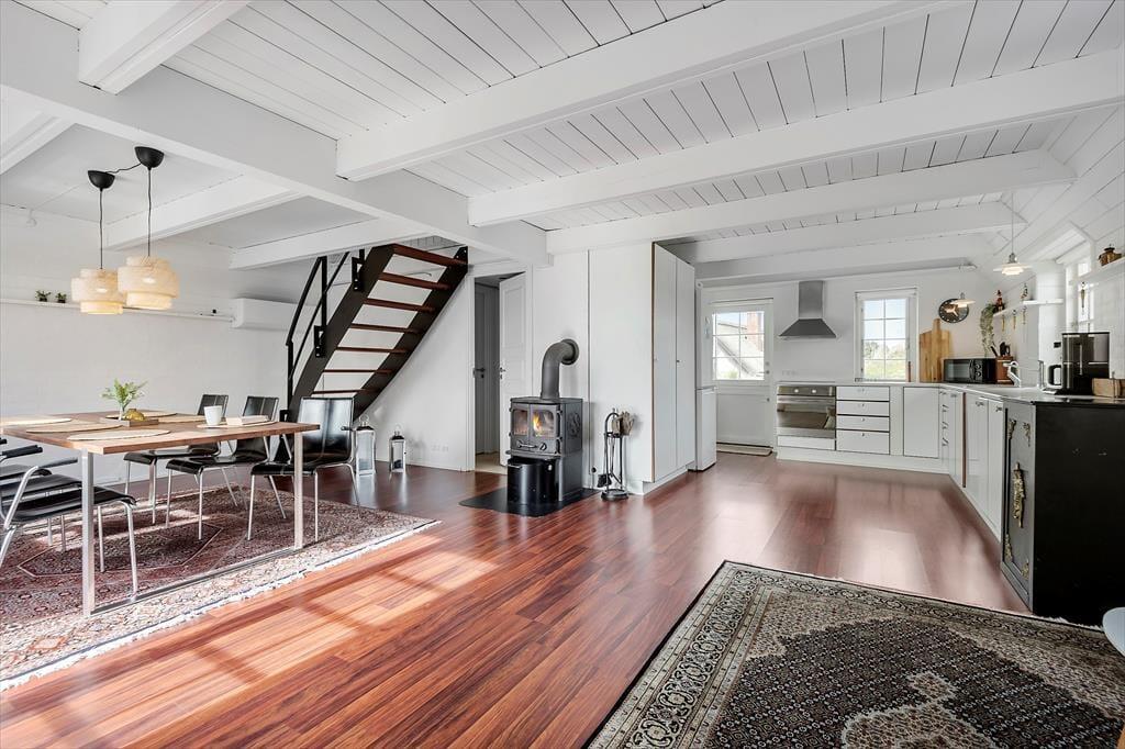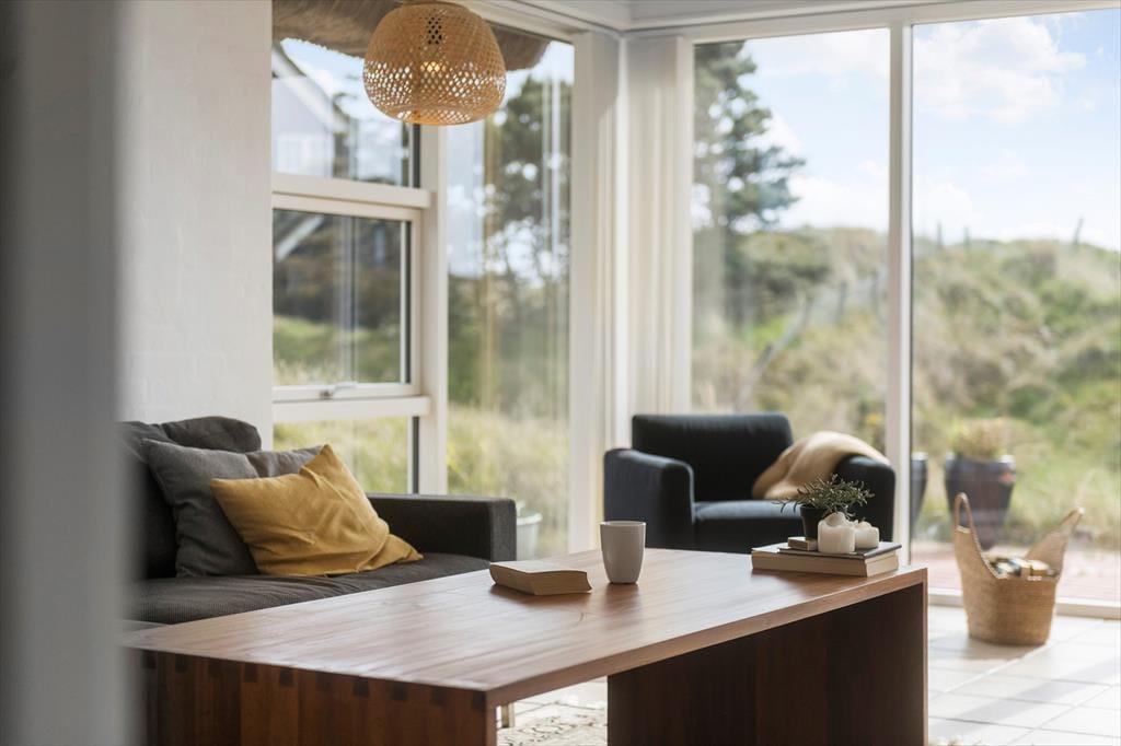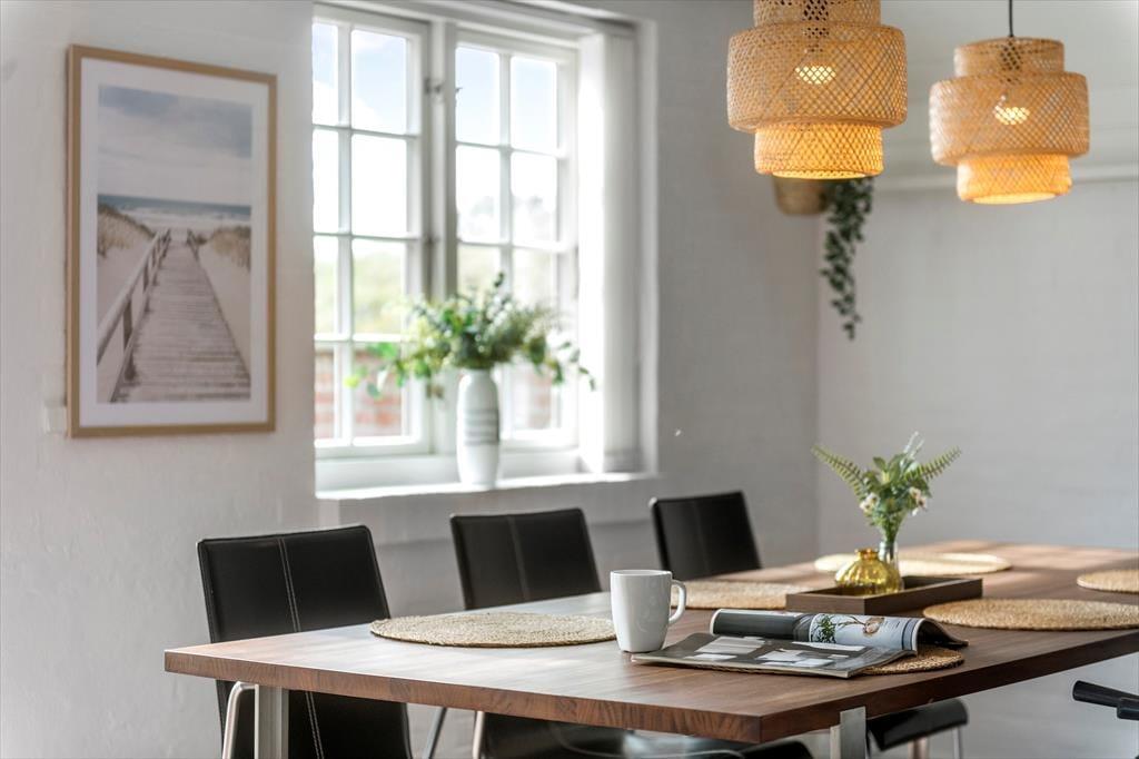 Indendørs venter et lyst og stilfuldt interiør, der balancerer det moderne og enkle med masser af varme og feriehygge. Den rummelige indretning i to etager giver plads til både fællesskab og fordybelse, og det åbne opholdsrum samler det hele på fineste vis. Her finder du både et hyggeligt sofaområde og spiseplads, hvor I kan nyde feriens måltider i fællesskab. Det tidløse køkken indbyder til madlavning, og de store vinduespartier giver et smukt lysindfald og en skøn udsigt til terrassen og den grønne beplantning udenfor. Når dagen går på hæld, og roen sænker sig, er der noget ganske særligt ved at slappe af i de velindrettede soveværelser, hvor hver detalje er gennemtænkt for at sikre en god nattesøvn. Alt i alt er her tænkt på, hvordan I får de bedst mulige rammer for en ferie med nærvær og afslapning.