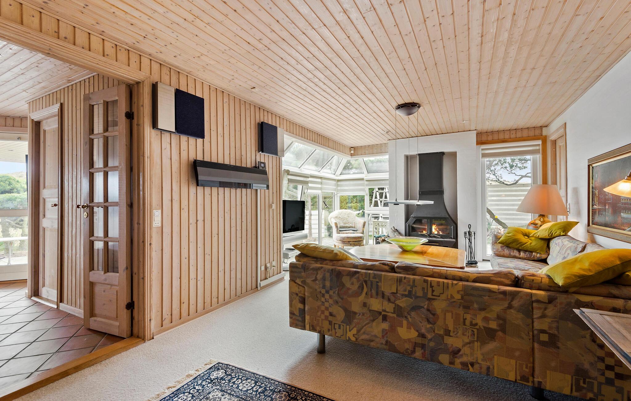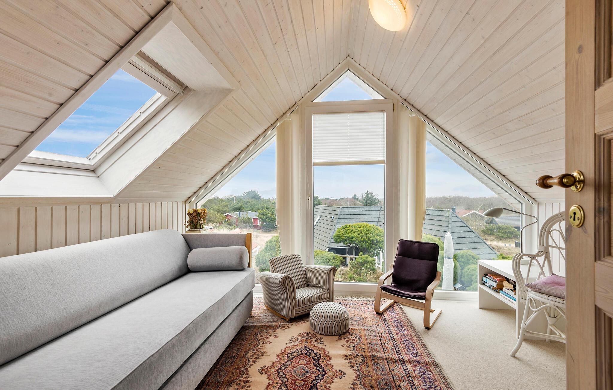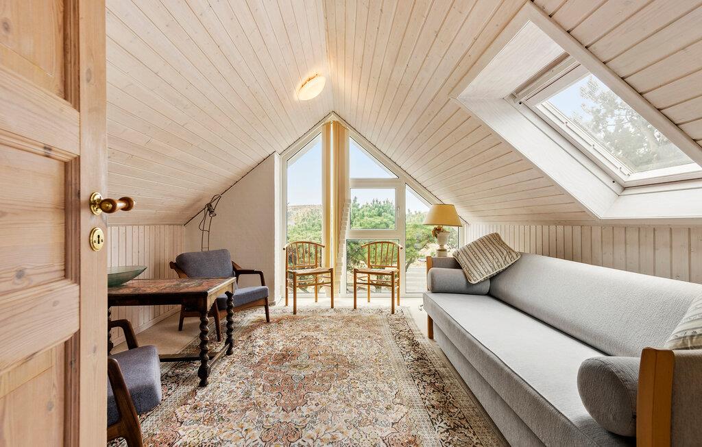 Dette charmerende sommerhus byder jer velkommen i en rolig og beskyttet beliggenhed. Den rummelige ejendom ligger lige ud til klitterne og tilbyder de bedste betingelser for en afslappende ferie med familien. Oplev det stilfulde interiør med kærligt afstemte detaljer. I opholdsstuen indbyder et stort sofahjørne til at blive hængende, hvor brændeovnen sørger for hyggelig varme på kølige dage. Nyd hyggelige timer med spil, gode samtaler eller en kop te med udsigten udenfor. På øverste etage finder I et ekstra retræterum under taget – lyst, roligt og med en smuk udsigt. Et sandt højdepunkt er det rummelige wellness-område med spabad og sauna.