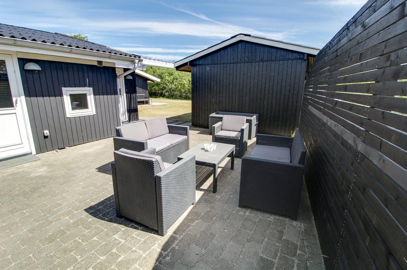 Ferieboligen er beliggende på en 1704 m² stor naturgrund. Der er 500 m til havet. Nærmeste forretning er beliggende i en afstand af 1500 m. Der er carport til rådighed.