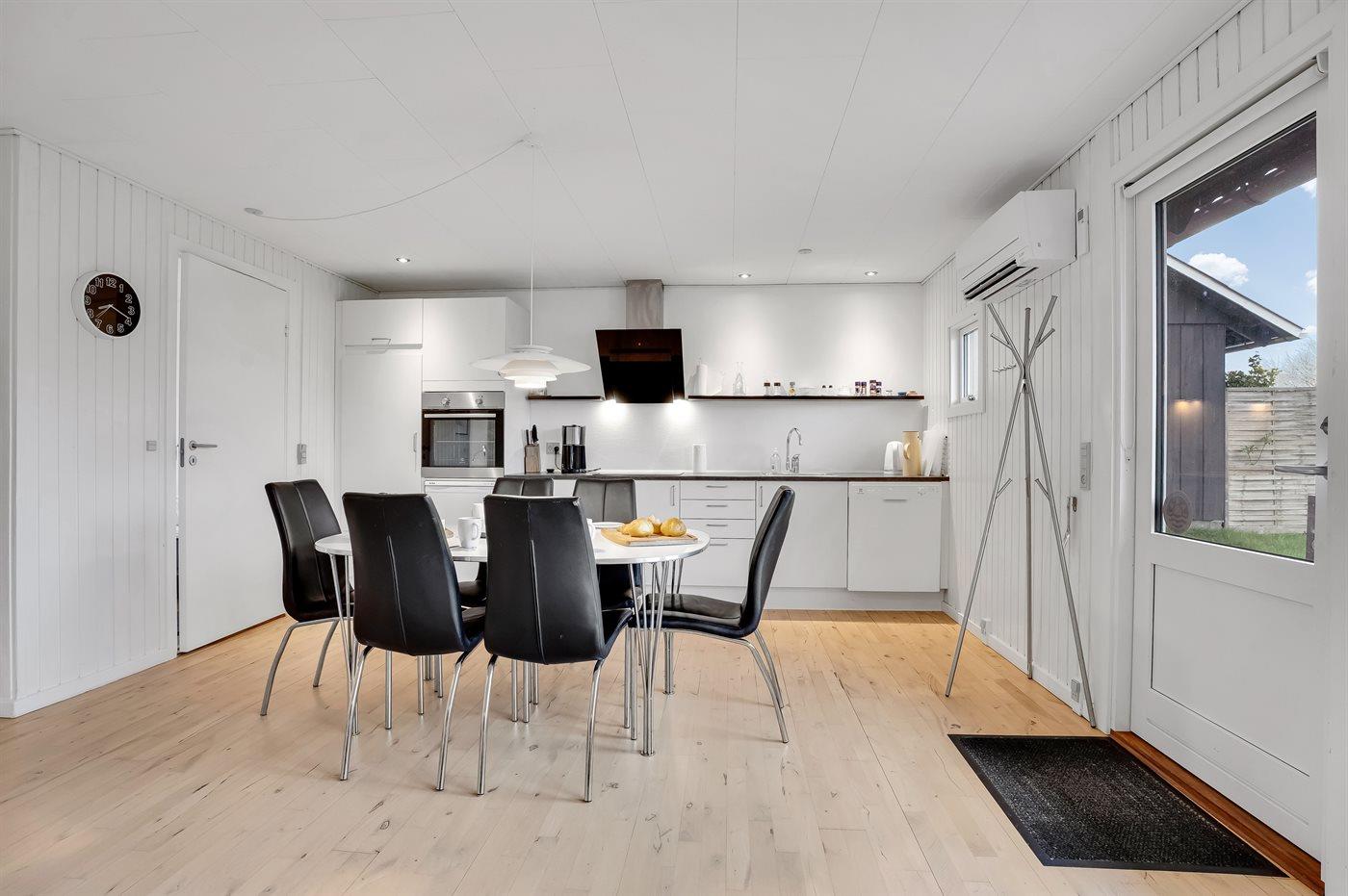 Køkkenet er udstyret med 1 køleskab. Der er 4 induktionskogeplader, varmluftovn, mikrobølgeovn samt opvaskemaskine.