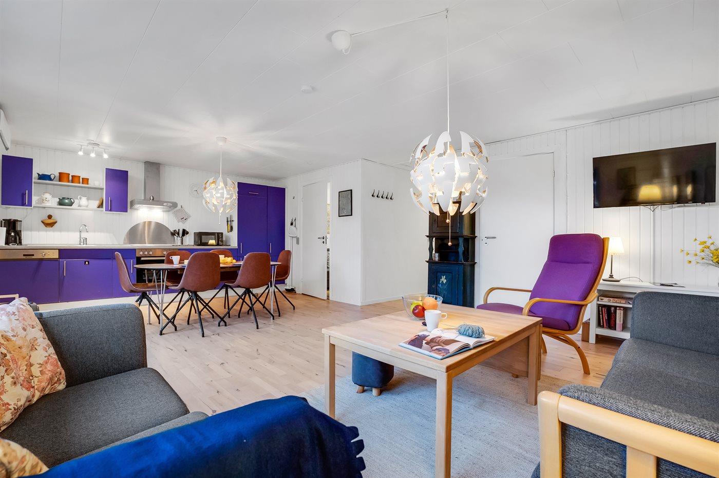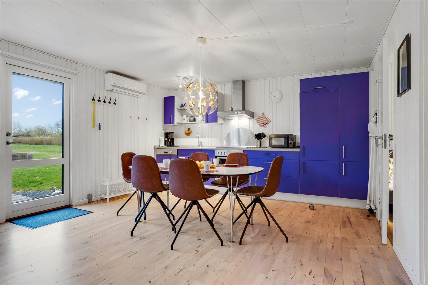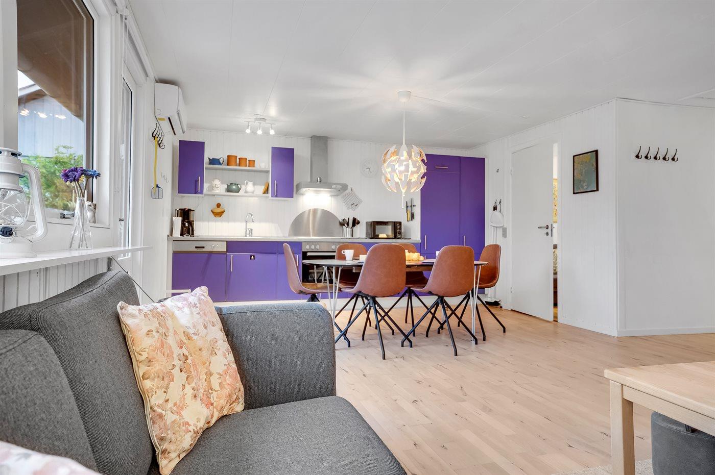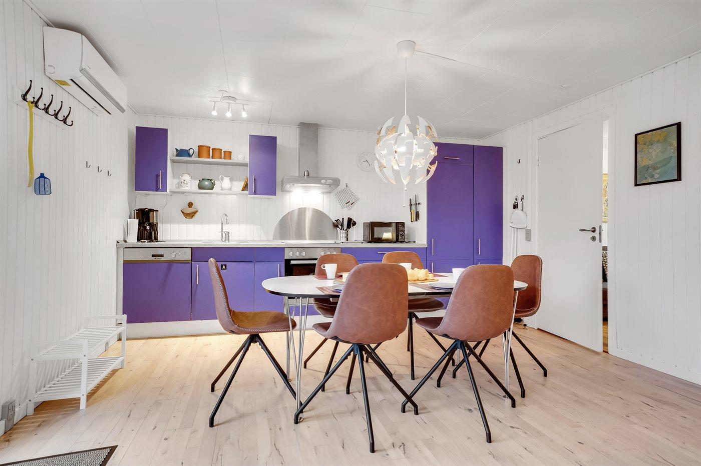 Køkkenet er udstyret med 1 køleskab. Der er 4 keramiske kogeplader, varmluftovn, mikrobølgeovn samt opvaskemaskine.