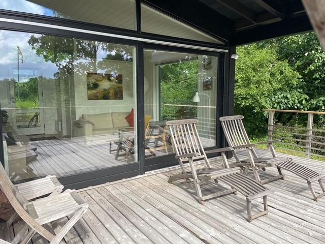 På højt beliggende naturgrund med pragtfuld udsigt over det dejlige skov- og naturområde ved Femmøller ligger dette ældre og løbende renoverede feriehus. Skøn træterrasse i forskudt plan, delvist overdækket, med havemøbler, liggestole, parasol og grill.
