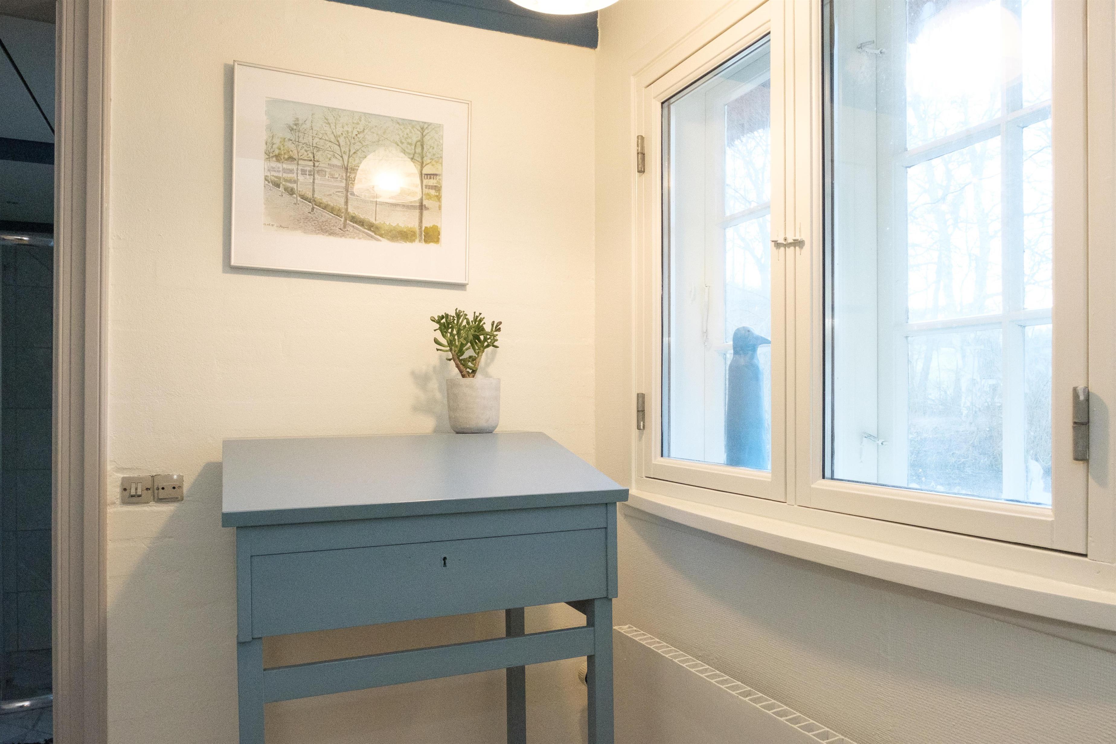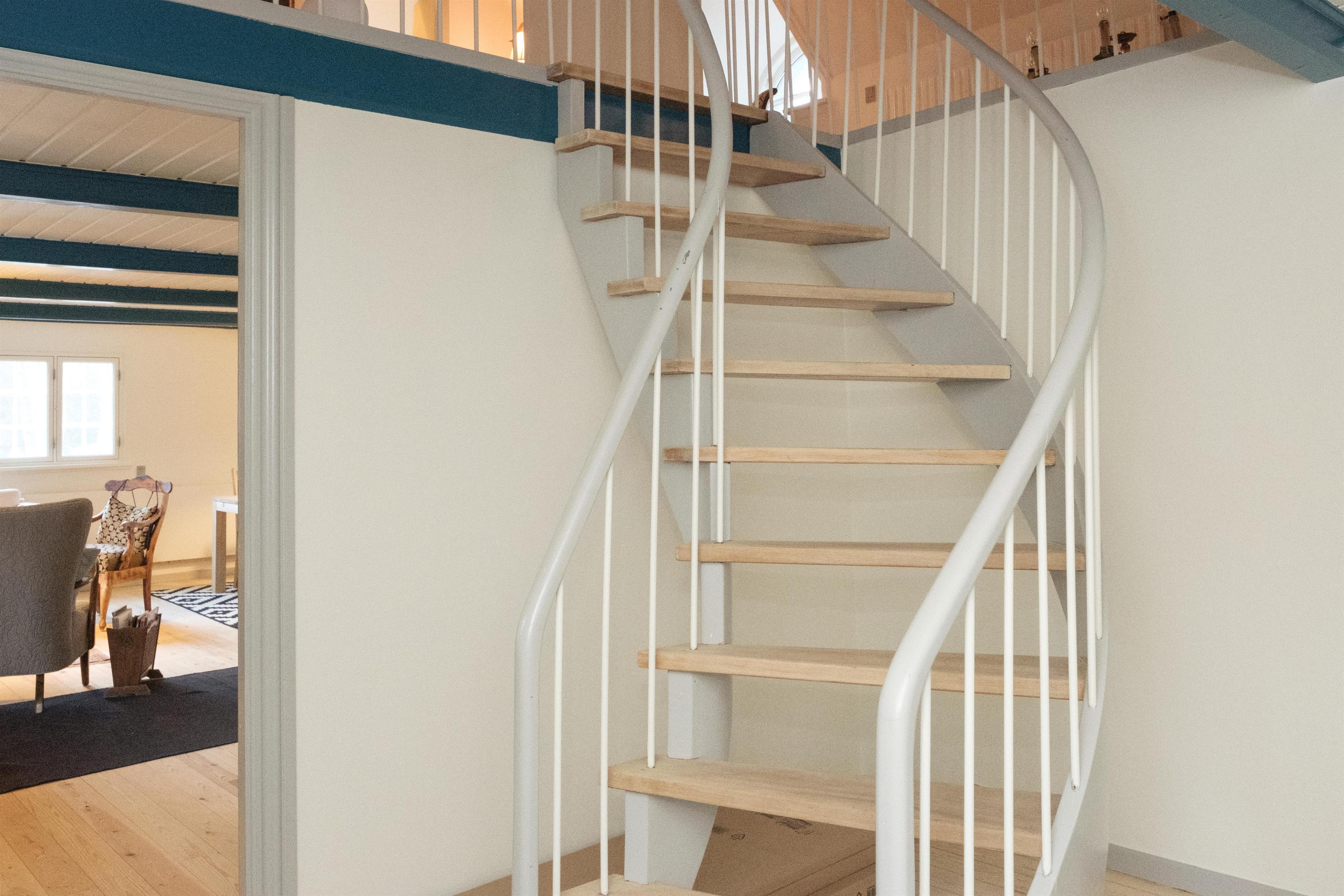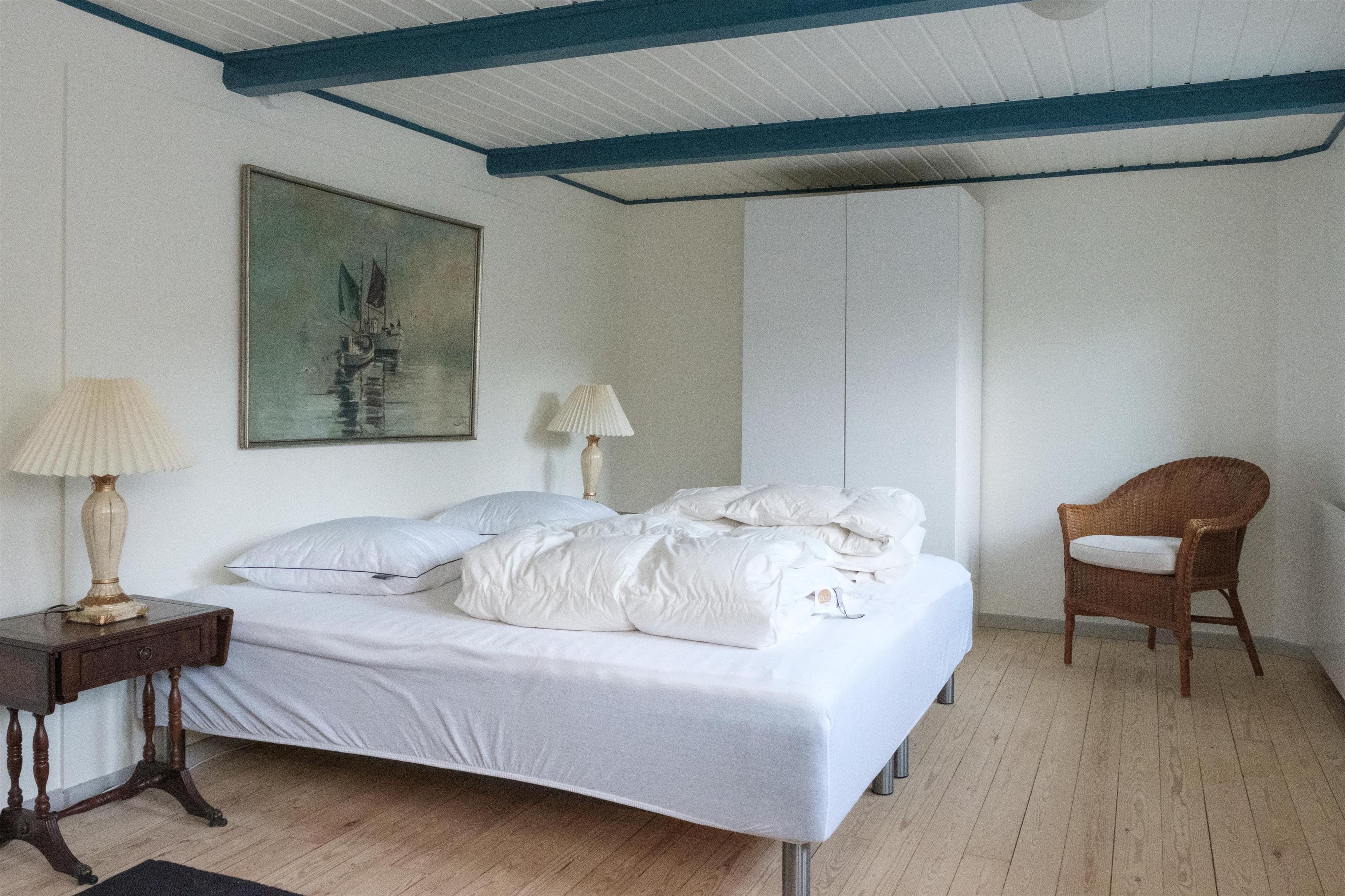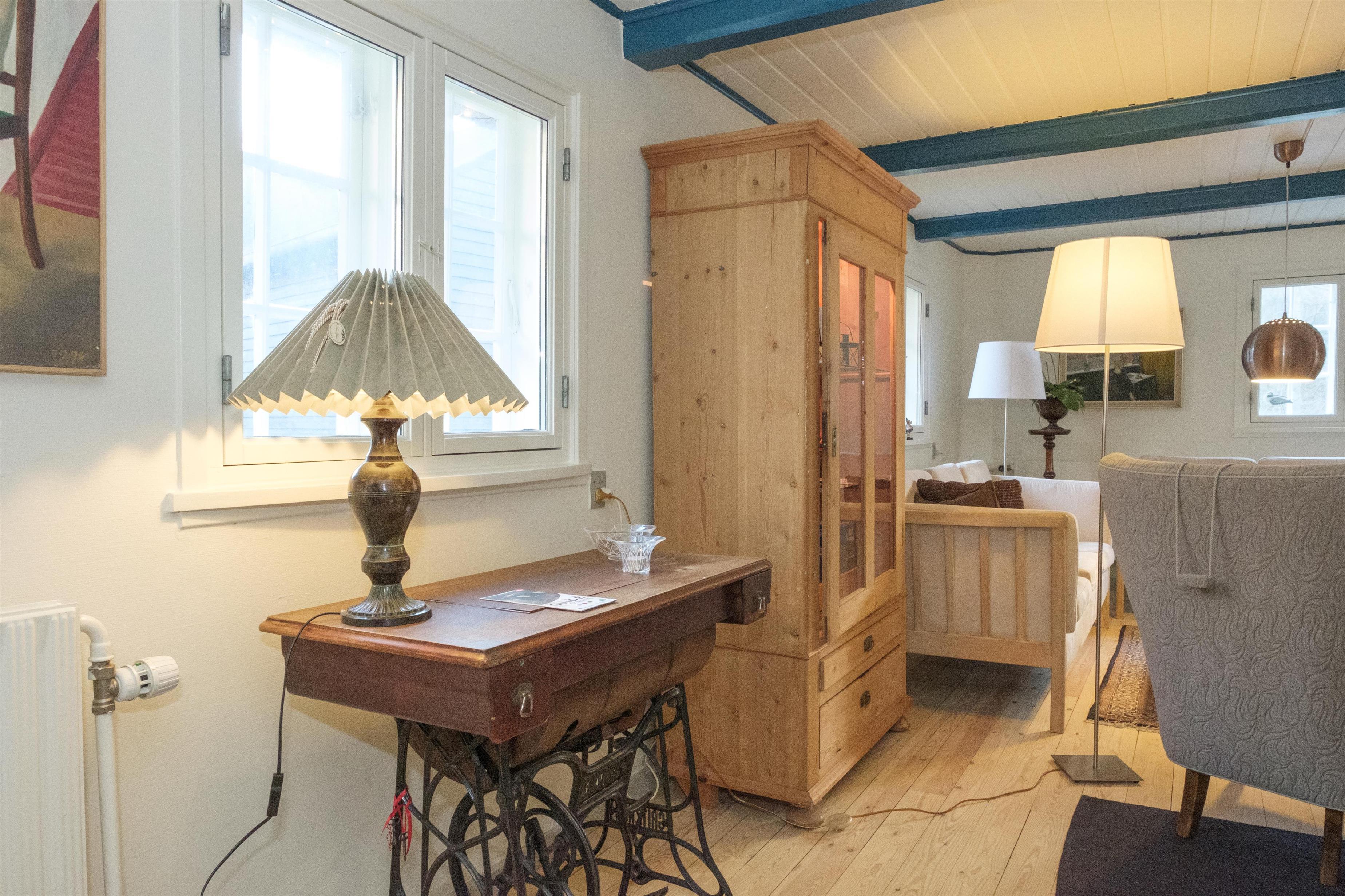 Hovedindgangen med den flotte dobbeltdør åbner til stor entré med trappe til 1. sal og indgang til den store, lyse stue, hvor samlingspunktet er den originale, murede kamin med brændeovnsindsats. Stuen er lige som resten af huset gennemført indrettet og møbleret med en smagfuld blanding af gammelt og nyt, og her er spiseplads til 10 personer, hyggeligt og bekvemt sofamøblement samt TV med danske (inkl. TV2) og tyske kanaler. Det store og praktiske køkken har keramisk komfur med ovn, køle-/fryseskab og opvaskemaskine. I stueplan er der 2 store, dejlige soveværelser med dobbeltseng, og på 1. sal ligeledes 2 soveværelser med dobbeltseng foruden opholdsstue med dobbelt sovesofa, i alt 10 sovepladser. Godt og rummeligt flisebadeværelse med brusekabine, vaskemaskine og puslebord; desuden et gæstetoilet, ligeledes i stueplan. Til de mindste gæster er der barneseng og højstol. Der er internetadgang.