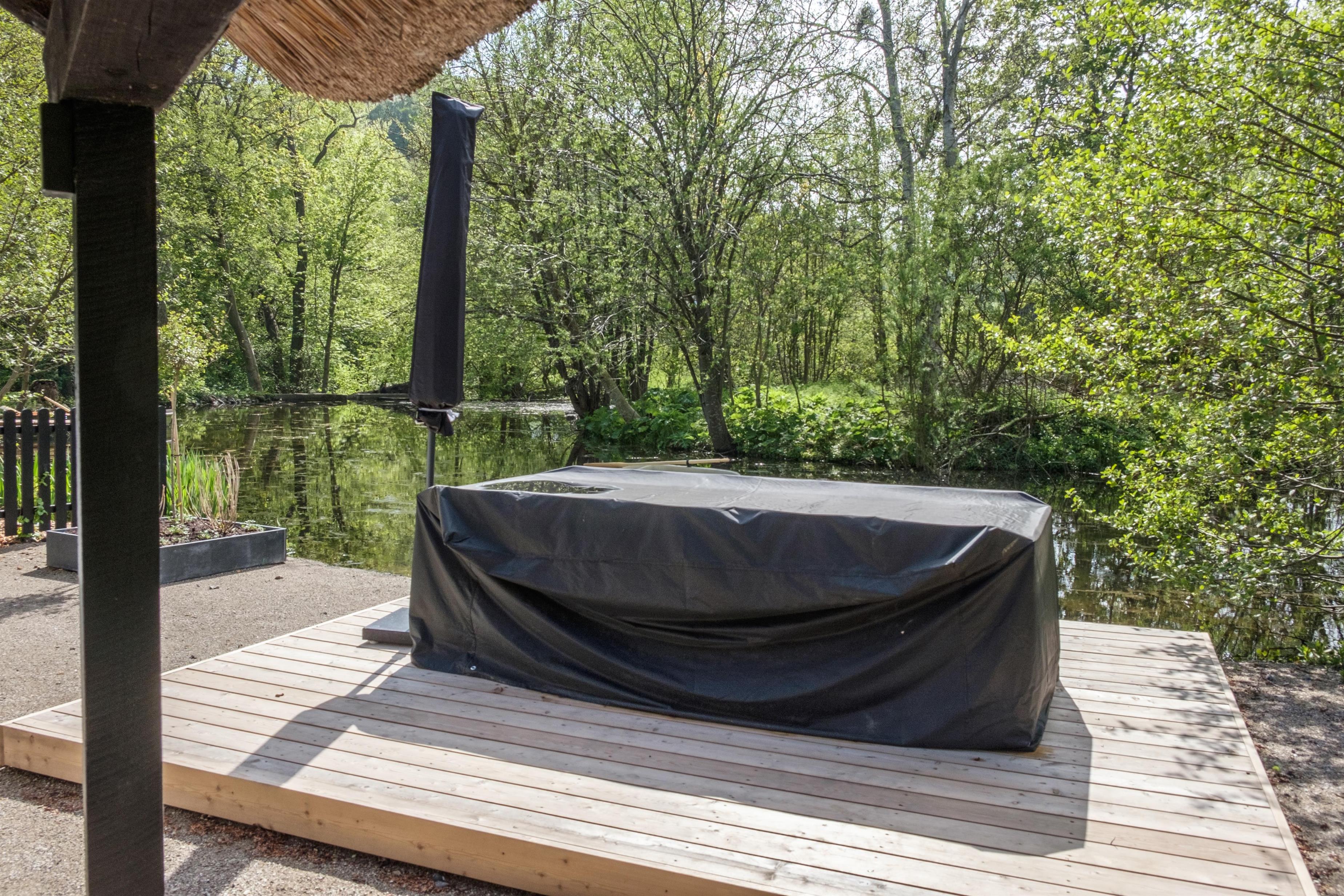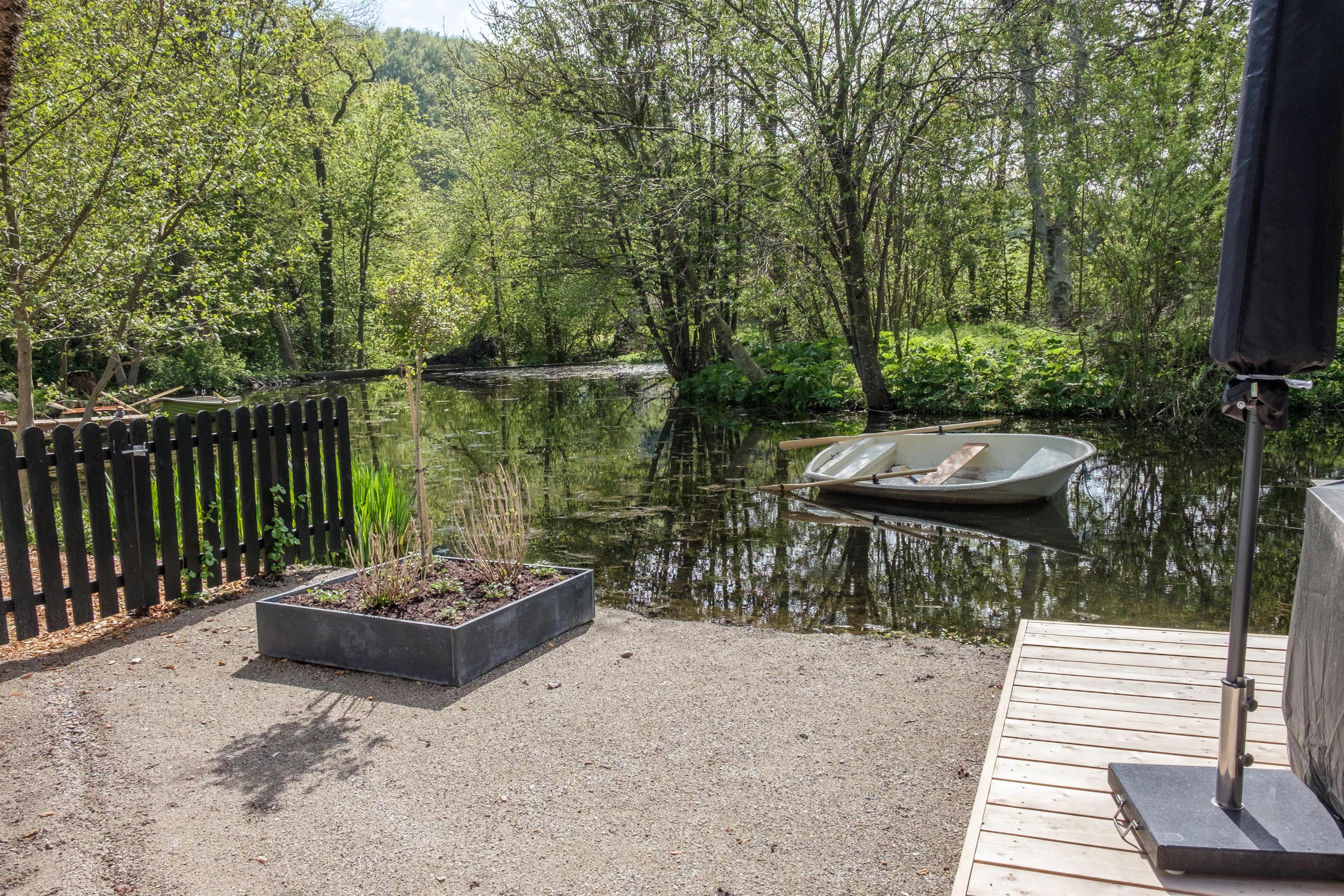 Skøn, afskærmet træterrasse med udsigt til søen, gode havemøbler, liggestole, parasol og grill. Til ejendommen hører også en robåd med redningsveste, som man på eget ansvar kan benytte på den 1,5 meter dybe møllesø. Robåden deles ligesom selve grundarealet med de to øvrige lejemål på matriklen.