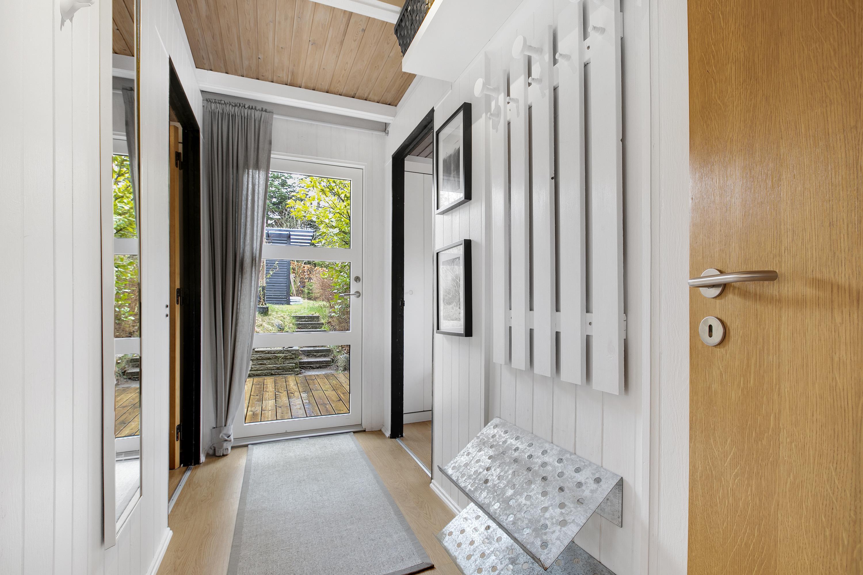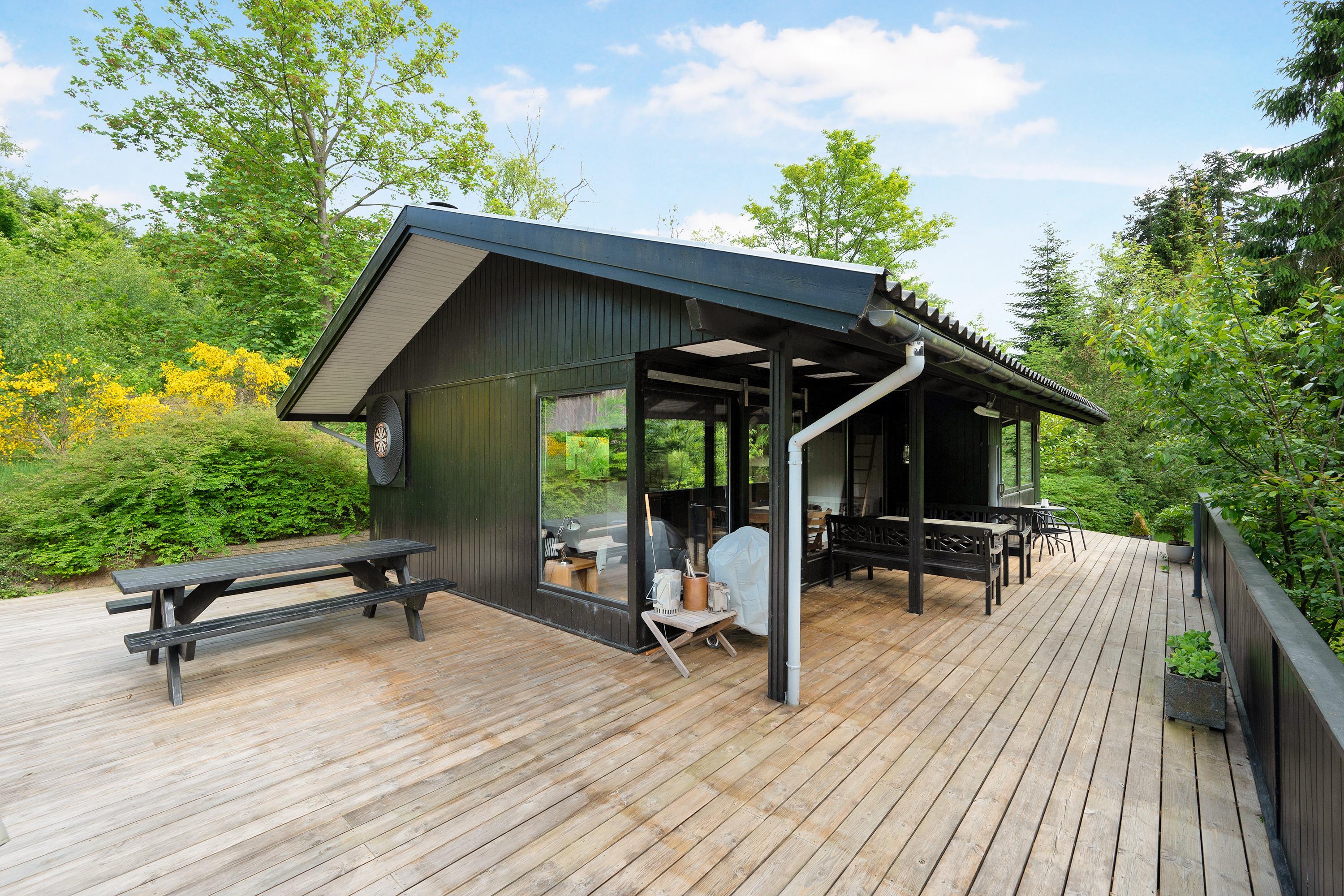 På stor naturgrund i det smukke, skovbevoksede landskab ved Femmøller ligger dette ældre, nyistandsatte og virkelig skønne hus omgivet af stor, delvist overdækket træterrasse med havemøbler, parasol og grill. Til børnene er der legeredskaber på grunden. En sand naturoase, hvor man både kan slappe af og dyrke udendørs aktiviteter.