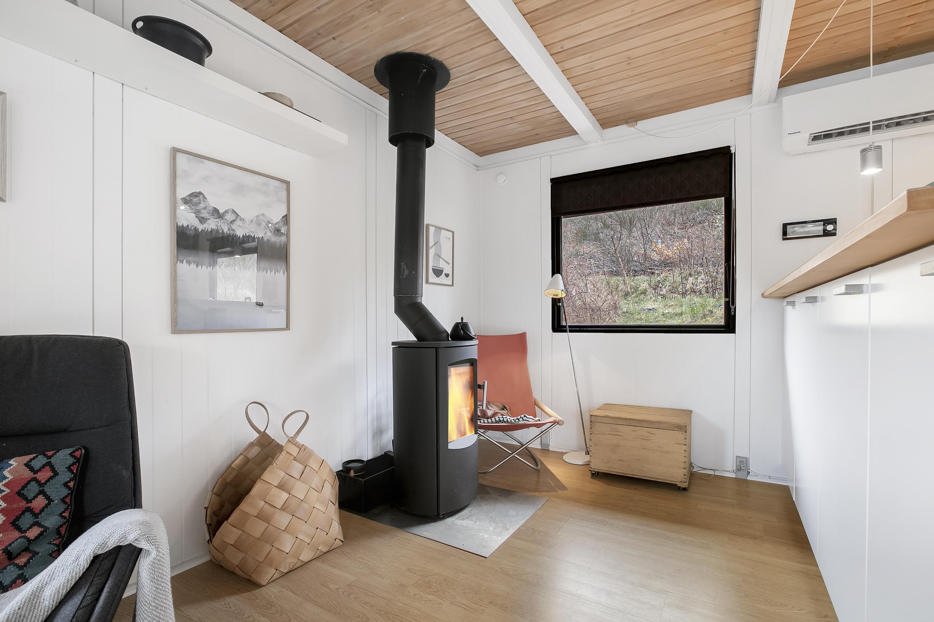 Huset fremstår overalt åbent og indbydende med masser af lysindfald. Den smukt og enkelt møblerede opholdsstue med udgang til terrasse ligger i åben forbindelse med køkken og har spiseafdeling til 5 personer - 3 voksne og 2 børn, brændeovn, samt fladskærms-TV med chromecast – bemærk, at der ingen kanaler er tilkoblet, alt indhold skal streames fra PC eller andet medie. Nyere lækkert køkken med keramiske kogeplader, ovn, køle-/fryseskab og opvaskemaskine. Husets 5 sovepladser fordeler sig på 1 værelse med dobbeltseng og 1 værelse med 2 enkeltsenge, beregnet til børn, samt en sovesofa i stuen. Pænt, oprindeligt badeværelse med bruseniche og vaskemaskine. Huset har varmepumpe med aircondition. Der er barnestol til de mindste. Internetadgang.
