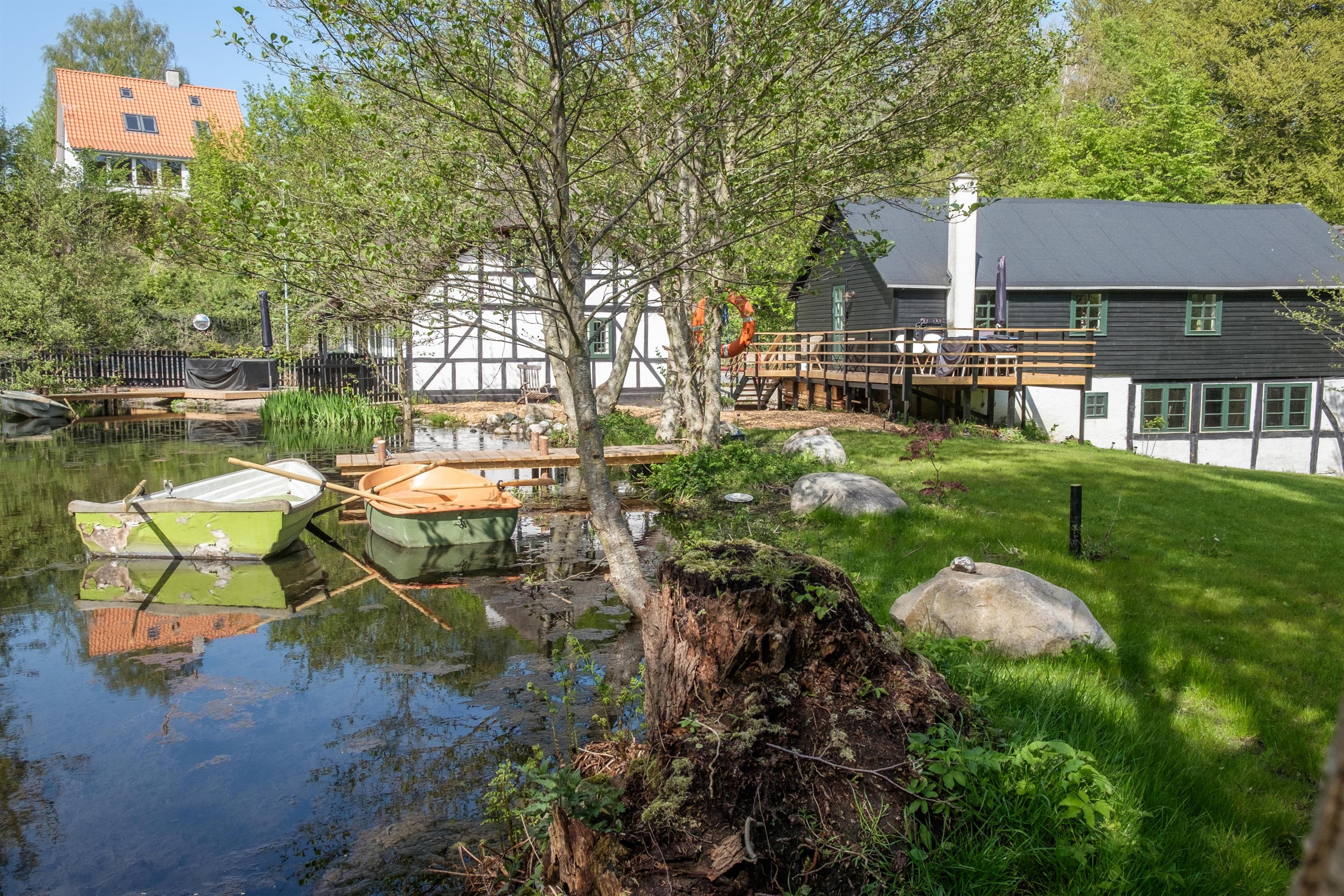 Til ejendommen hører desuden en robåd med redningsveste, som man på eget ansvar kan benytte på den 1,5 meter dybe møllesø. Robåden deles ligesom selve grundarealet med de to øvrige lejemål på matriklen.