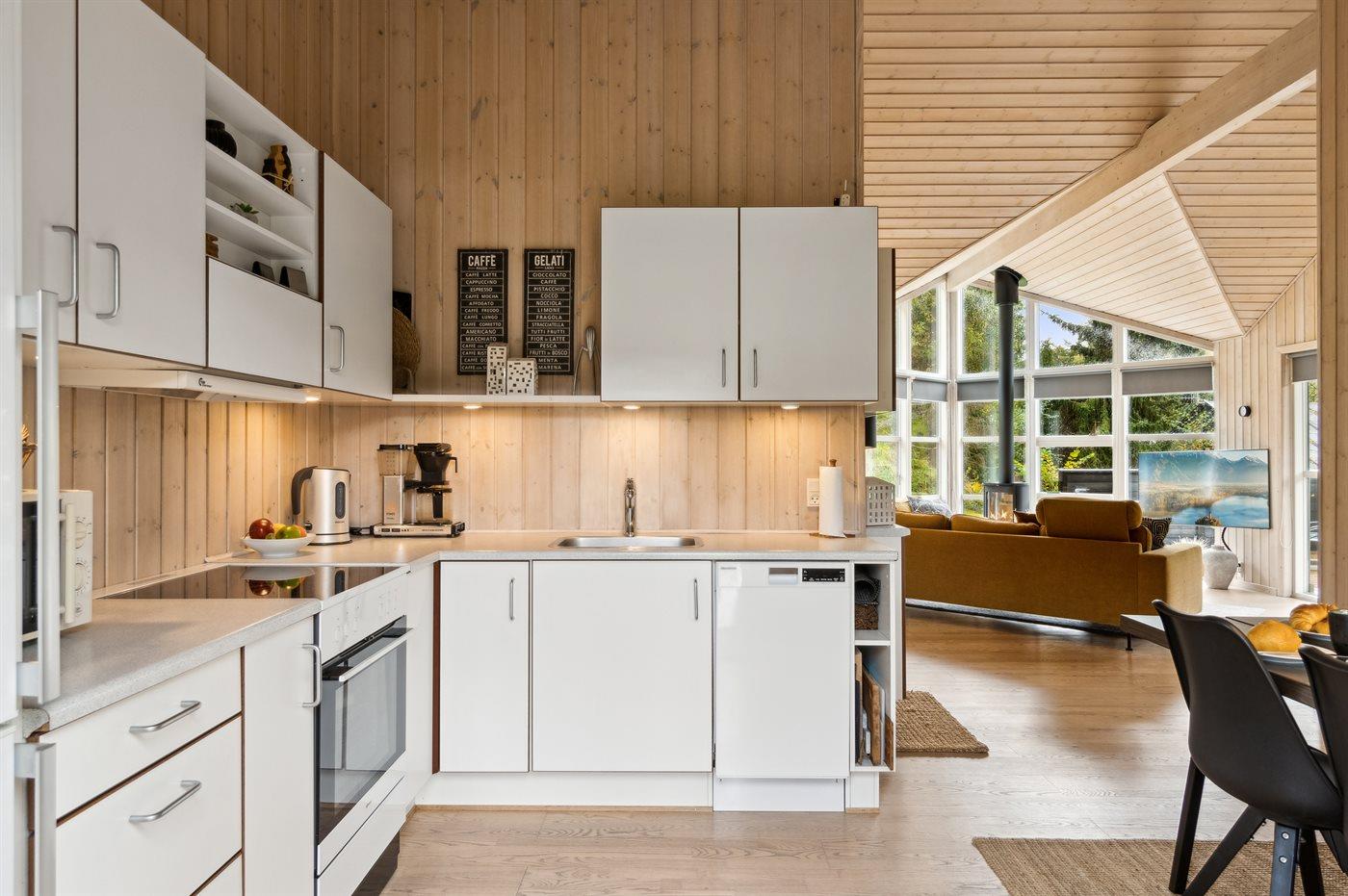 Køkkenet er udstyret med 1 køleskab. Der er 4 keramiske kogeplader, varmluftovn, mikrobølgeovn samt opvaskemaskine.