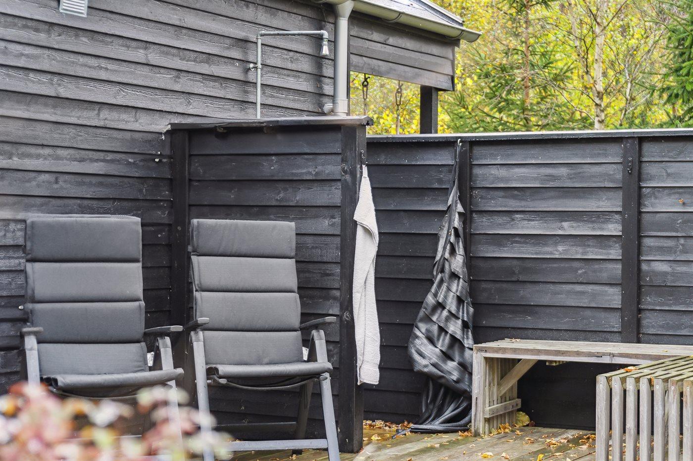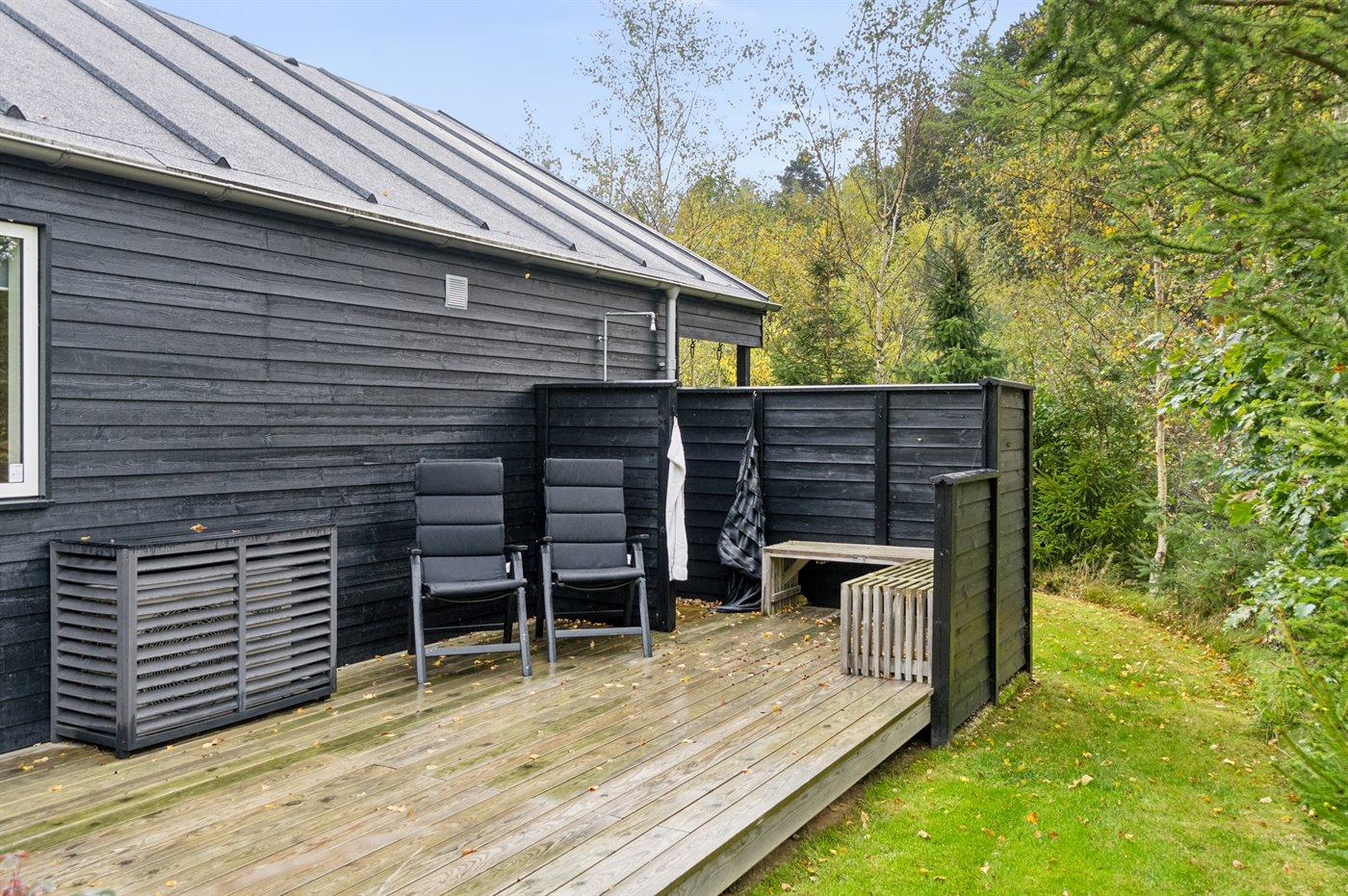 Ferieboligen er beliggende på en 1700 m² stor naturgrund. Der er 2100 m til havet. Nærmeste forretning er beliggende i en afstand af 3500 m. Til ferieboligen hører 35 m² terrasseareal. Desuden er der 15 m² overdækket terrasse. Der er redskabsrum. Gynge. Udendørs bruser. Grill til rådighed. Der er installeret stik til opladning af elbil. Type 2 stik. Med 11 kW ladeeffekt. Parkering ved ferieboligen.
