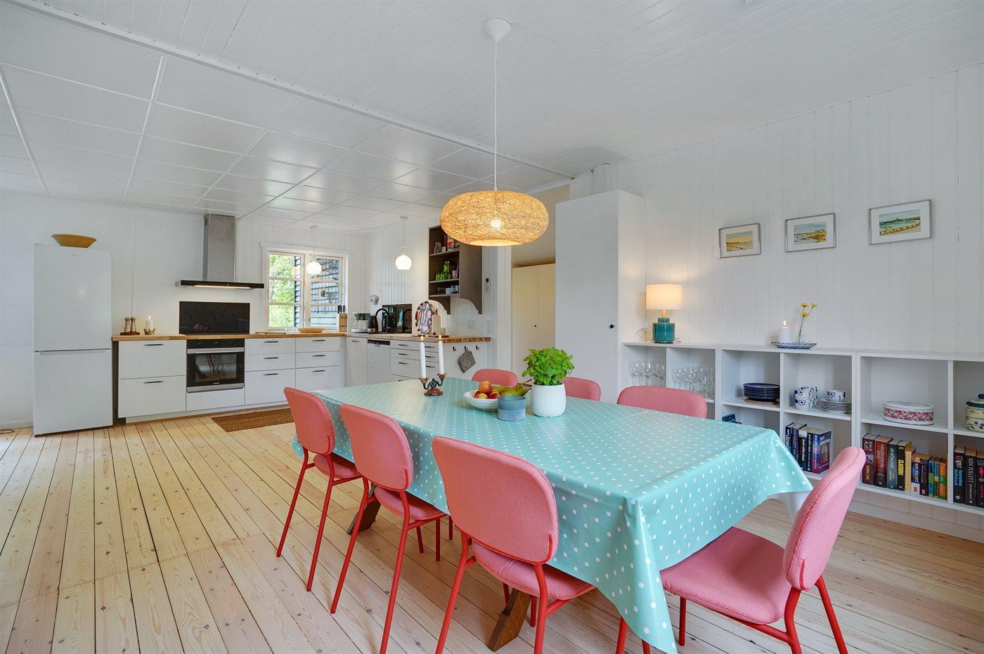 Køkkenet er udstyret med 1 køleskab. Der er 4 induktionskogeplader, varmluftovn, mikrobølgeovn samt opvaskemaskine.