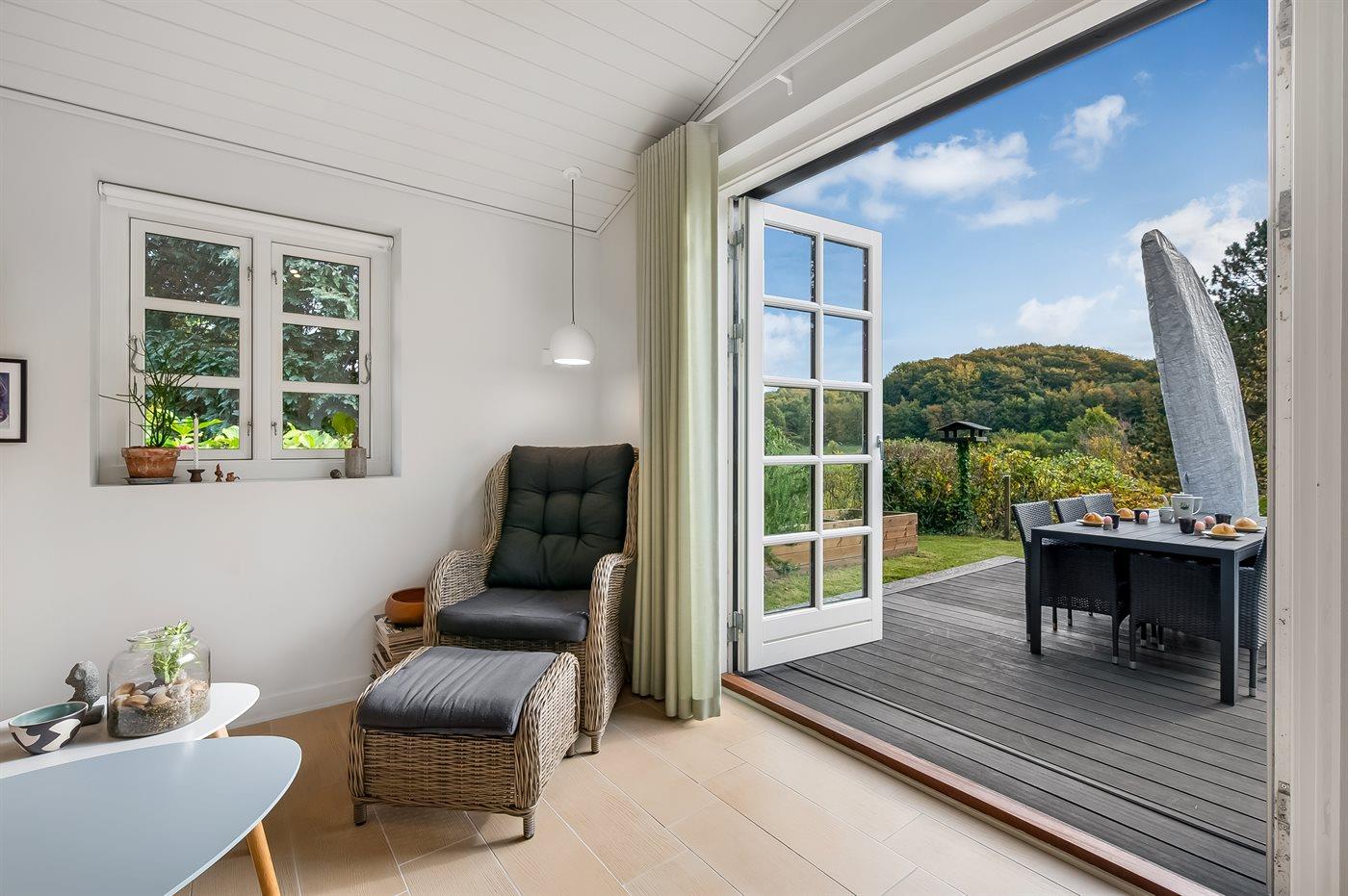 I det kuperede terræn midt i Femmøllers smukke omgivelser finder du et sommerhus, der er perfekt til fire personer. Dette usædvanlige feriehus er omgivet af skove, landskaber og møllemiljøer, der skaber en unik atmosfære. Huset fremstår lyst, moderne og velholdt, og det har alt, hvad man skal bruge til en skøn ferie.