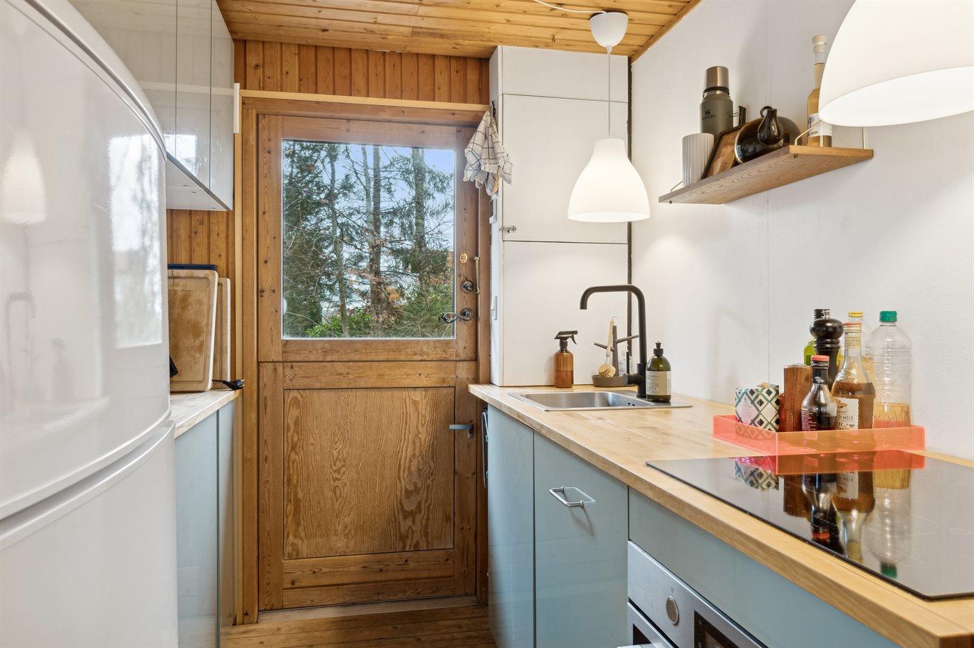 Køkkenet er udstyret med 1 køleskab. Der er 4 induktionskogeplader, varmluftovn samt opvaskemaskine.