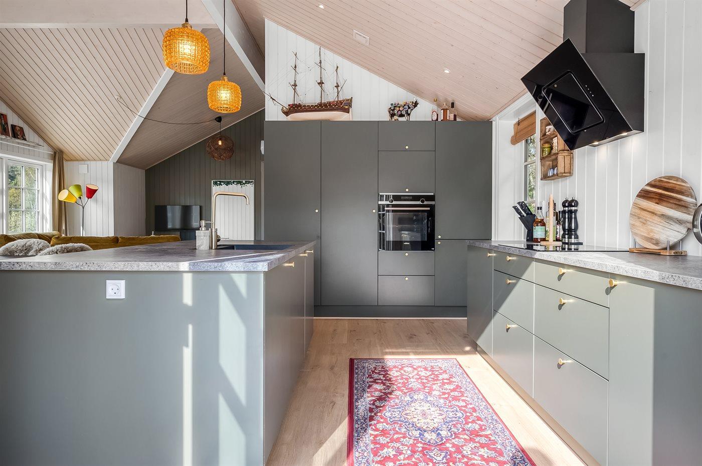 Køkkenet er udstyret med 1 køleskab. Der er 4 induktionskogeplader, varmluftovn, mikrobølgeovn samt opvaskemaskine.