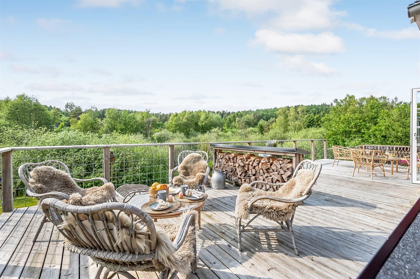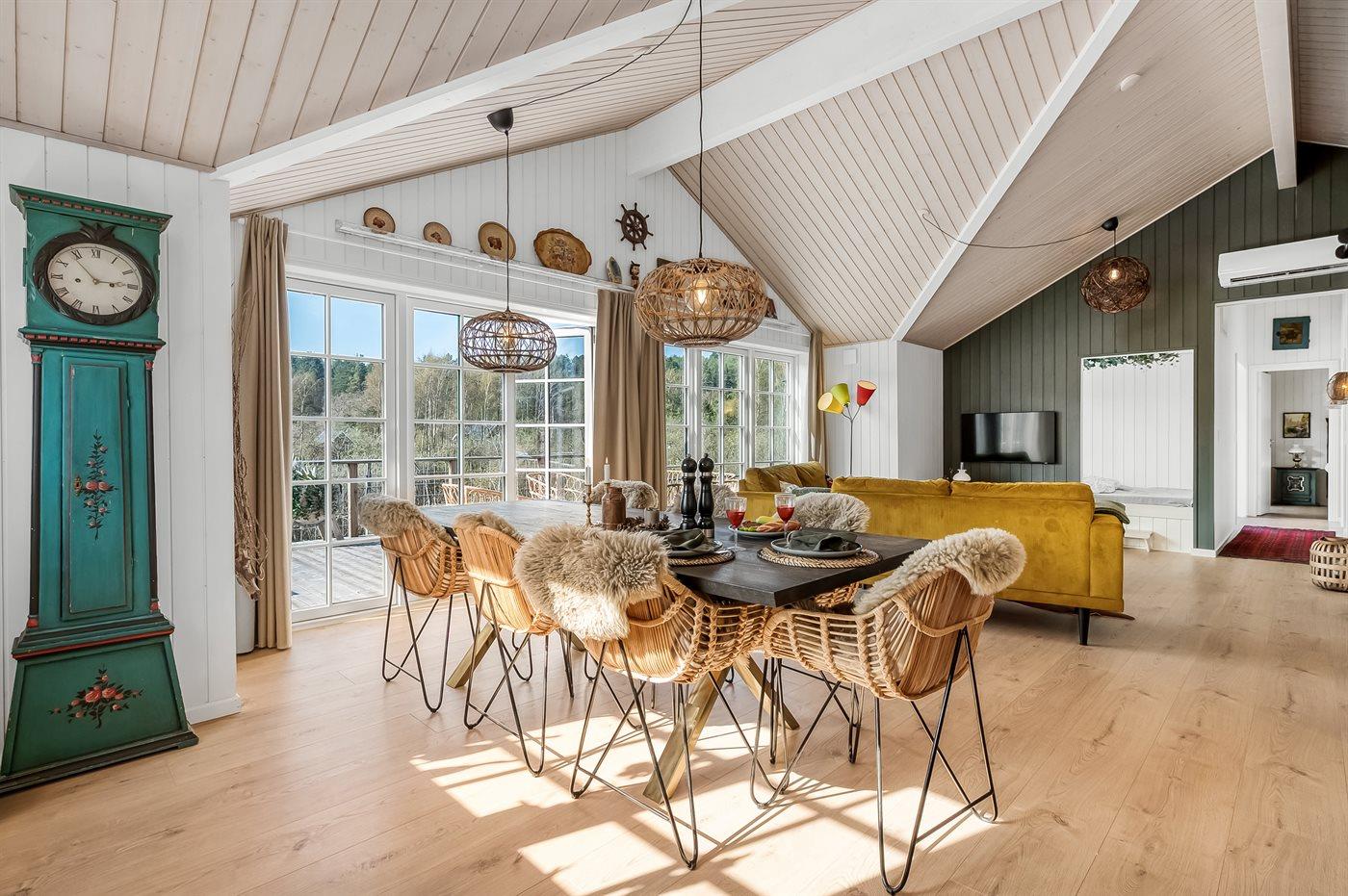 Køkken- alrummet og stuen ligger i åben forbindelse og med direkte udgang til den store terrasse. Her er der rekreative områder og et dejligt spabad og på grunden nedenfor bakken er der en åben græsplæne med god plads til boldspil og leg samt et bålsted med plads til hygge.