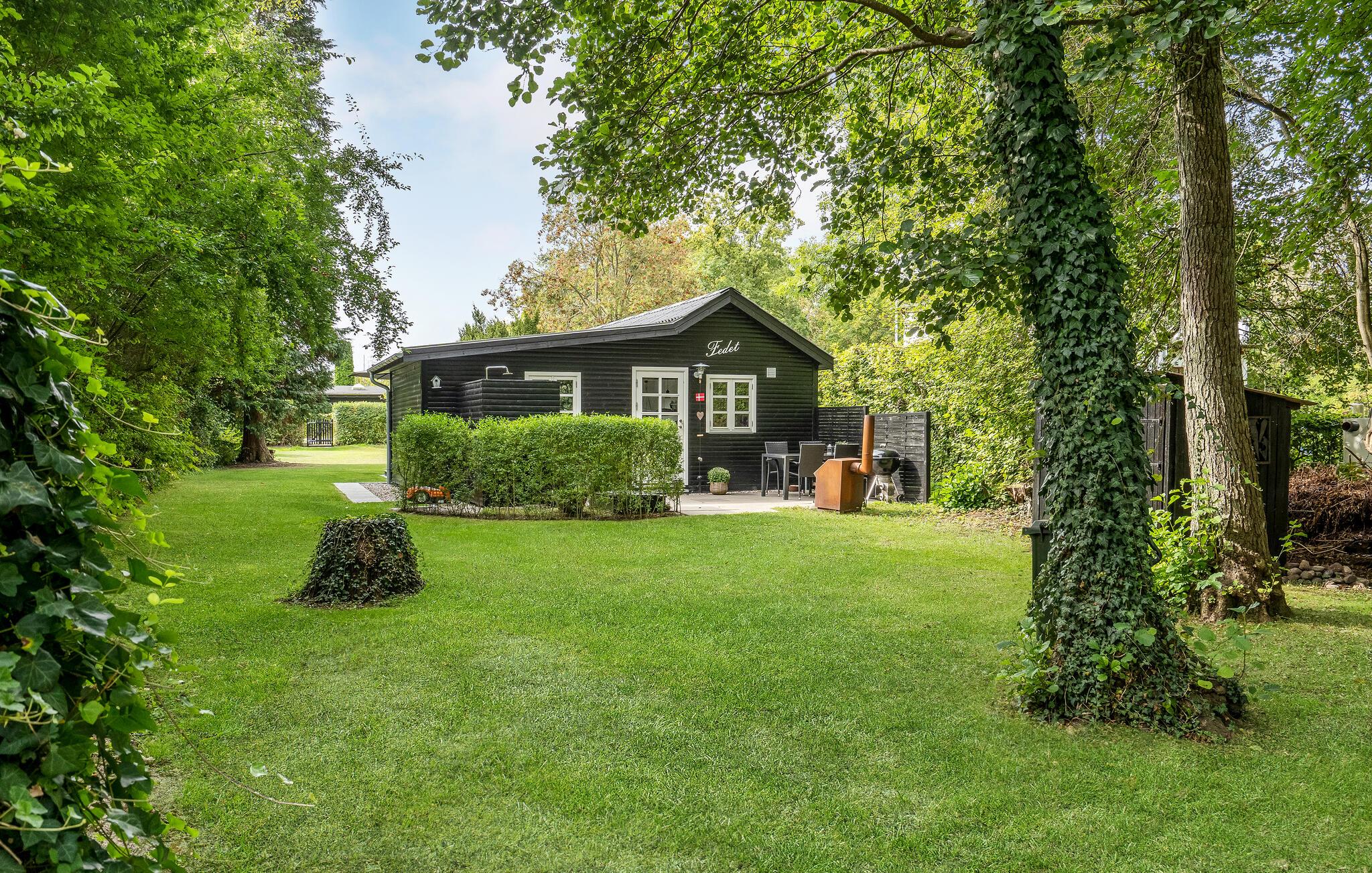 Hyggeligt træhus nær Femmøller Strand med terrasse og udendørs bruser, perfekt til afslapning og naturoplevelser.