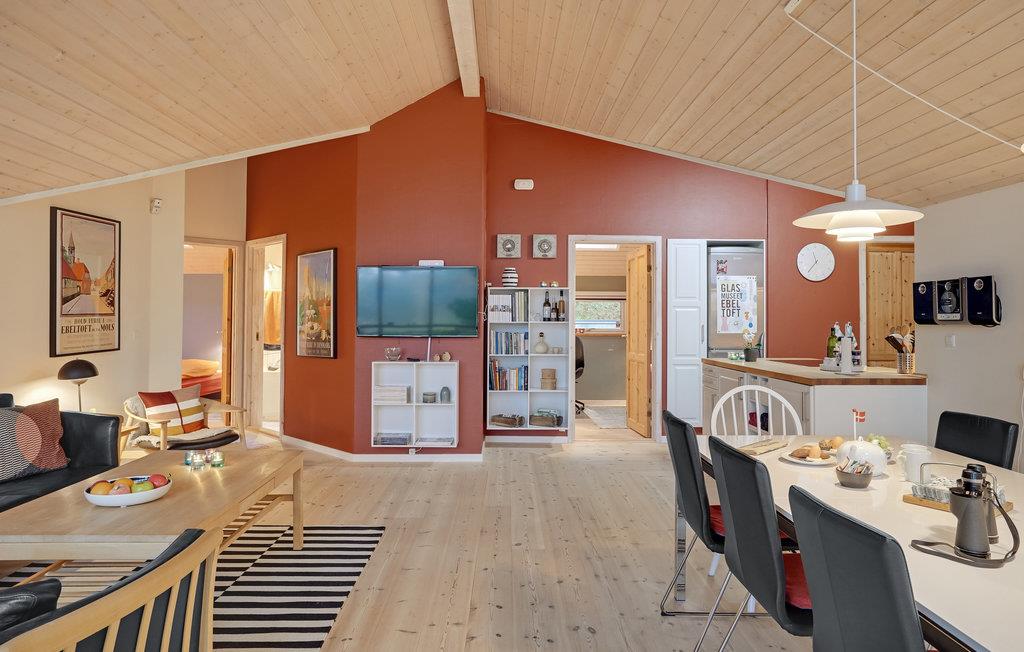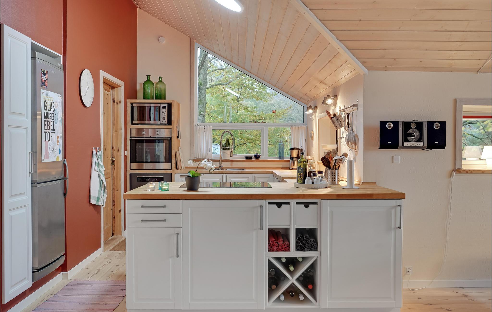 I den flotte, kuperede natur, som kendetegner Djursland finder I dette hyggelige feriehus. Opholdsstuen har åbent til kip, så der er masser af lys og luft i boligen, som er varmt og personligt indrettet og har dejlige, moderne faciliteter. Fra opholdsstuen har I udsigt til eng og skov, så det kan I nyde året rundt, uanset om terrassedøren står åben, eller I nyder aftenstemningen med ild i brændovnen.