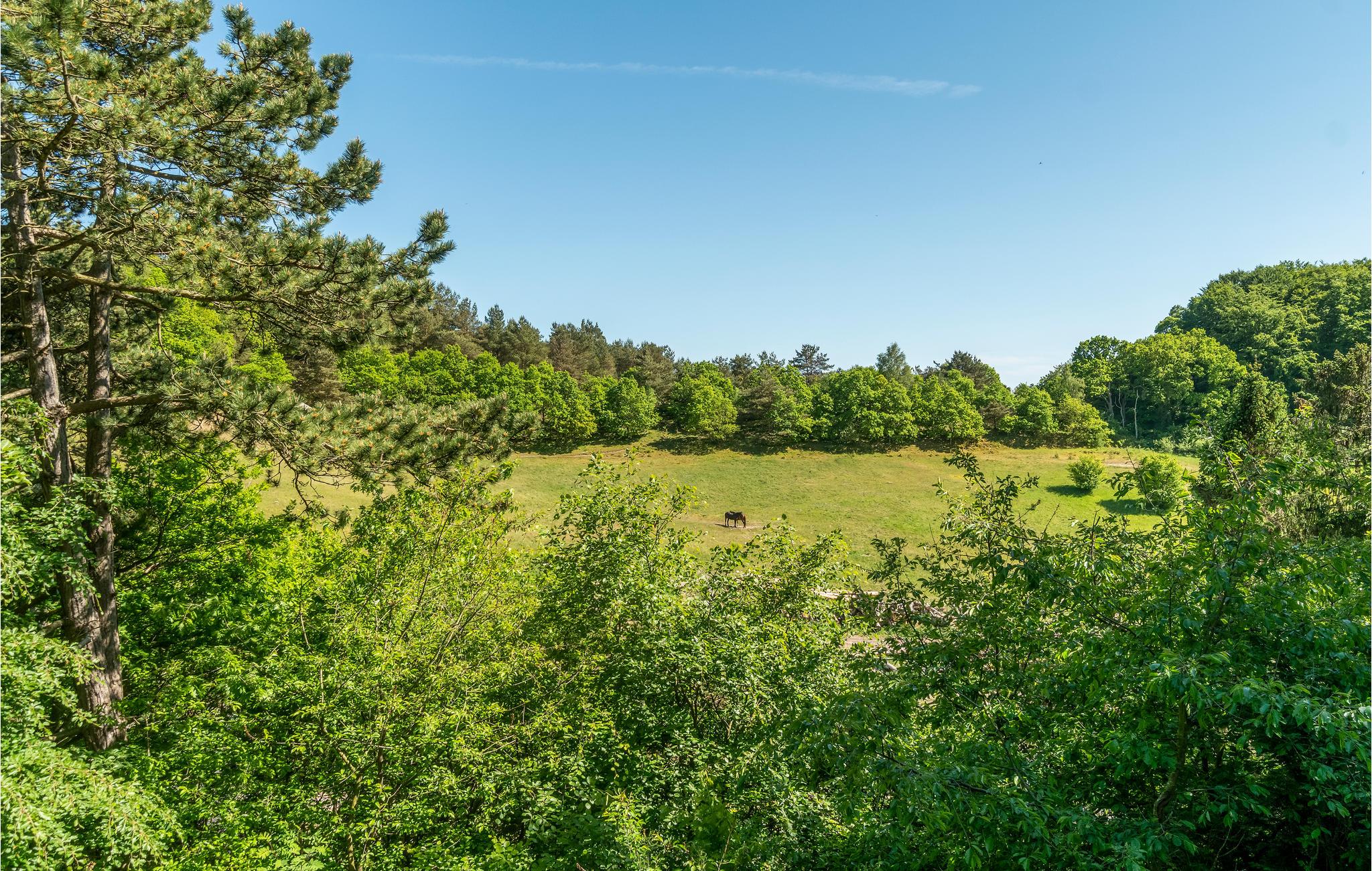 Hyggeligt feriehus i naturskønne Femmøller Bakker med udsigt til eng og skov.