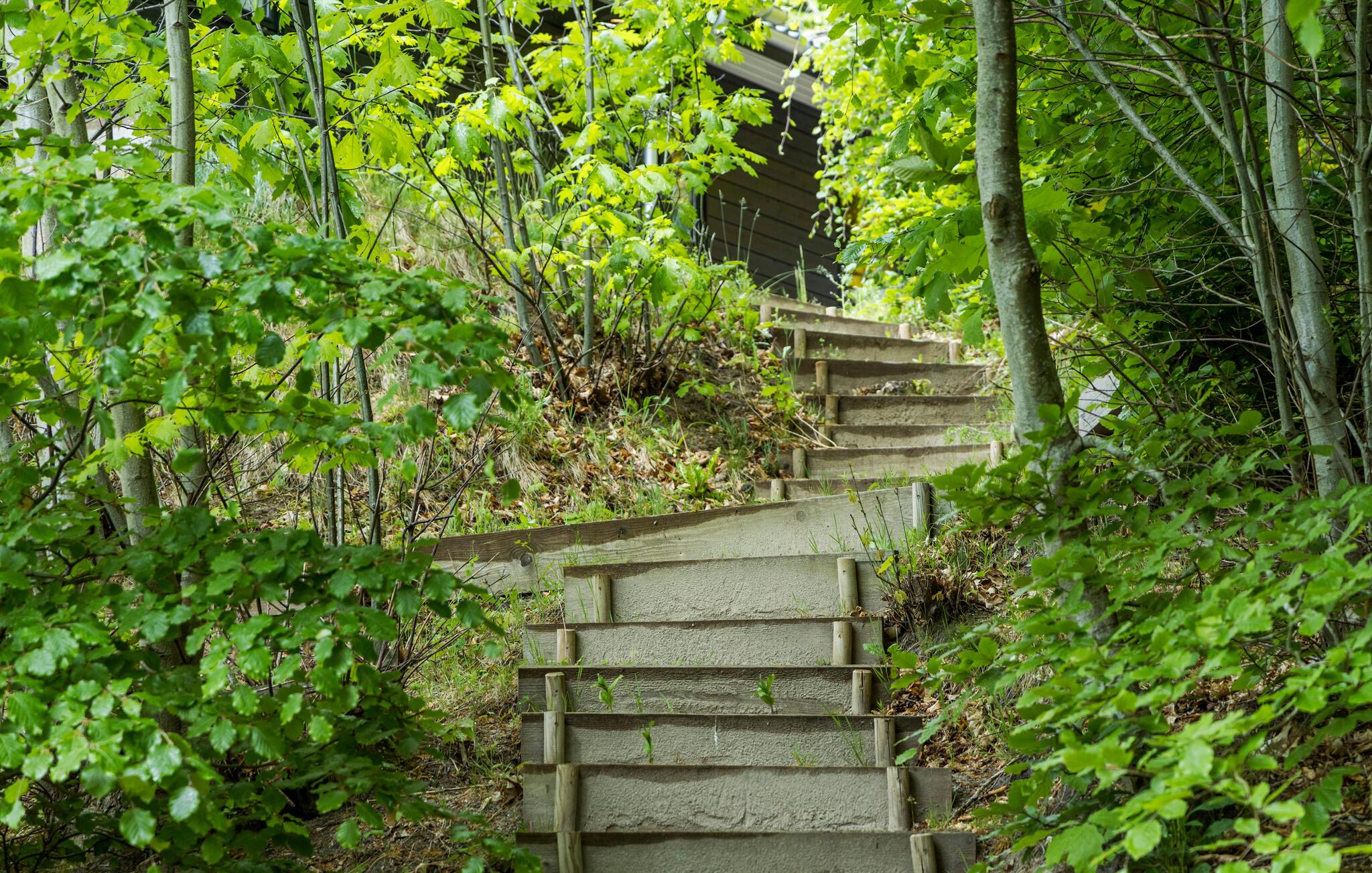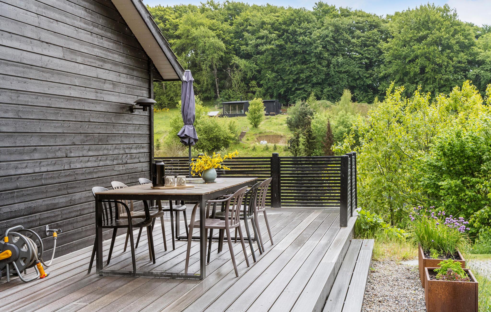 Huset er spændende indrettet, og der er kræset for detaljerne. Fra stue og spiseplads er der udgang til overdækkede og åbne terrasser, som giver mulighed for at kunne sidde ude og nyde måltiderne. Med udsigt over området fra det brændefyrede vildmarksbad eller en tur i den udendørs sauna er udelivet her meget attraktivt. Området er et flot naturområde med blandet skov og ligger tæt ved Nationalparken Mols Bjerge.