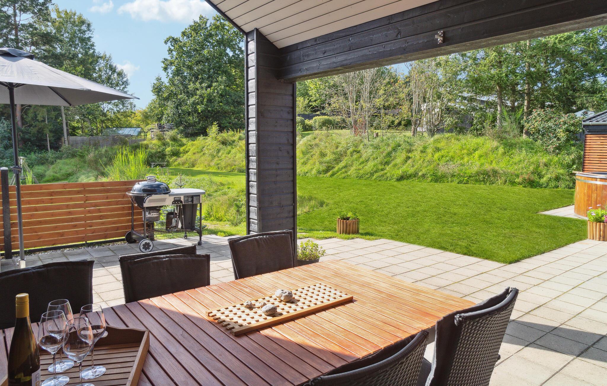 Udendørs er der flere gode terrasser, såvel åbne som overdækkede, og de fleste måltider vil kunne nydes udendørs, der er bl.a. elstråle varme ved den overdækkede terrasse. Glæd jer også til en afslappende tur i vildmarksbadet, som er det ideelle sted til at nyde et glas kølig hvidvin på de lune sommeraftener.
