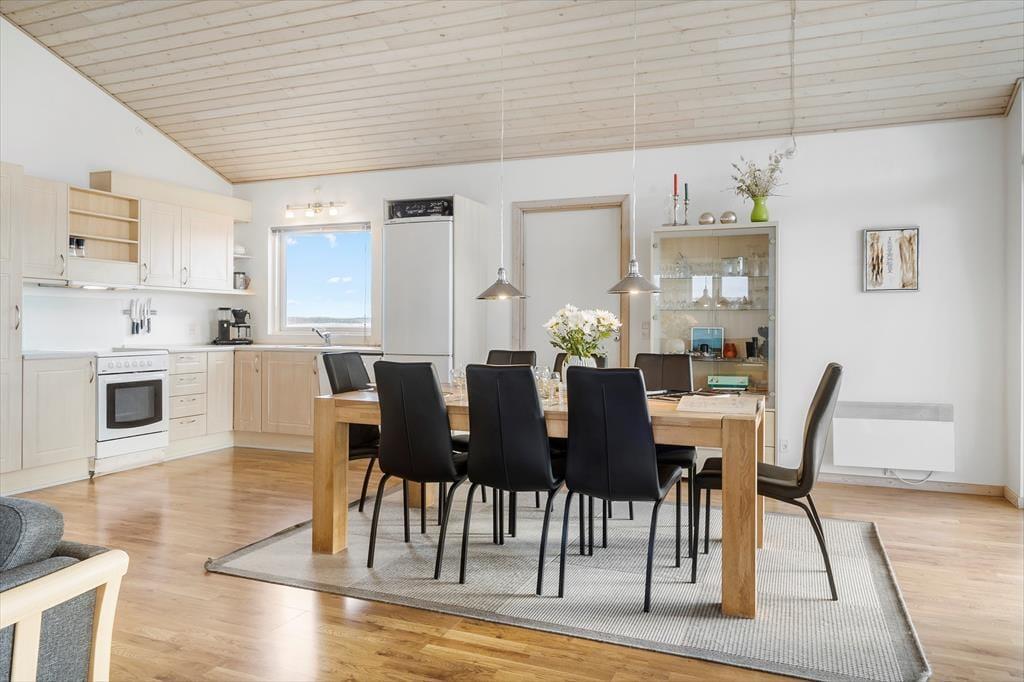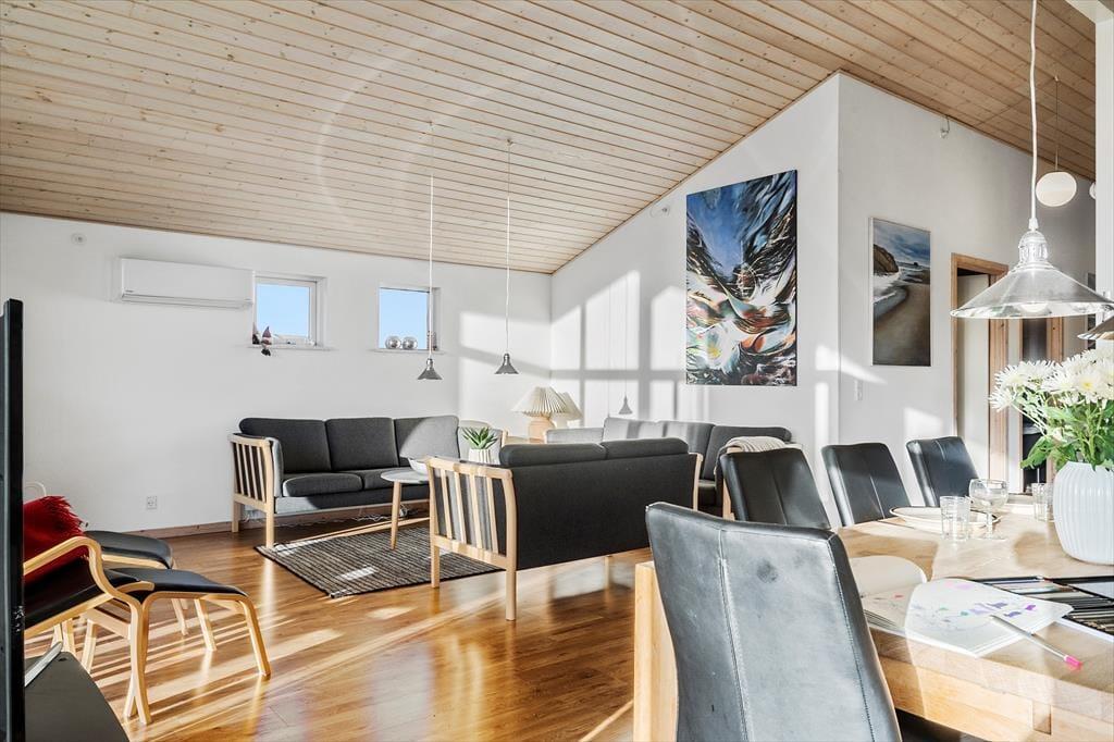 Når du træder ind i sommerhuset, bliver du mødt af en venlig og lys atmosfære, der straks inviterer til afslapning. Indretningen er moderne og rummelig, og det store opholdsrum fungerer som det naturlige samlingspunkt – her er der plads til både madlavning, fælles måltider og hyggelige stunder i sofahjørnet. De store vinduer lukker lyset ind og forbinder inde og ude på fineste vis, og på kølige dage kan I trække jer tilbage i spaen eller nyde varmen i saunaen. Med god plads til flere personer, bliver huset en komfortabel base for både afslapning og samvær – uanset årstid og vejr.