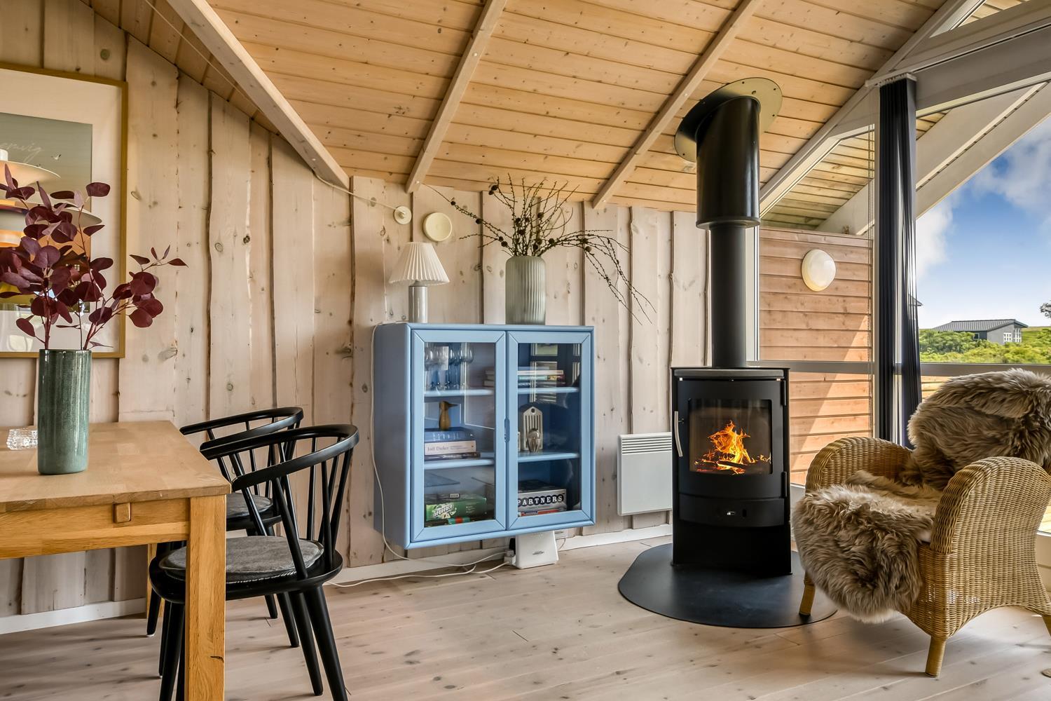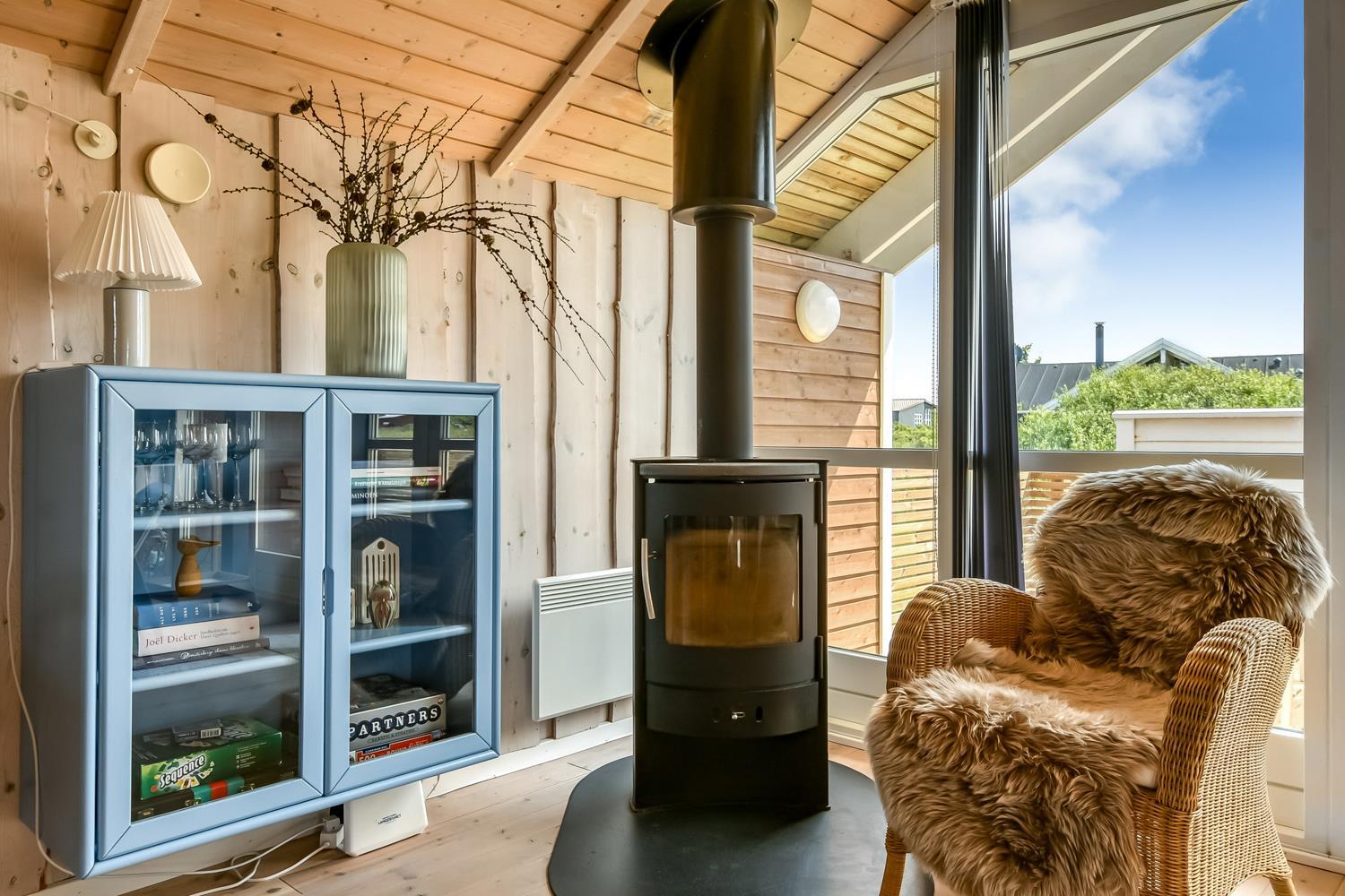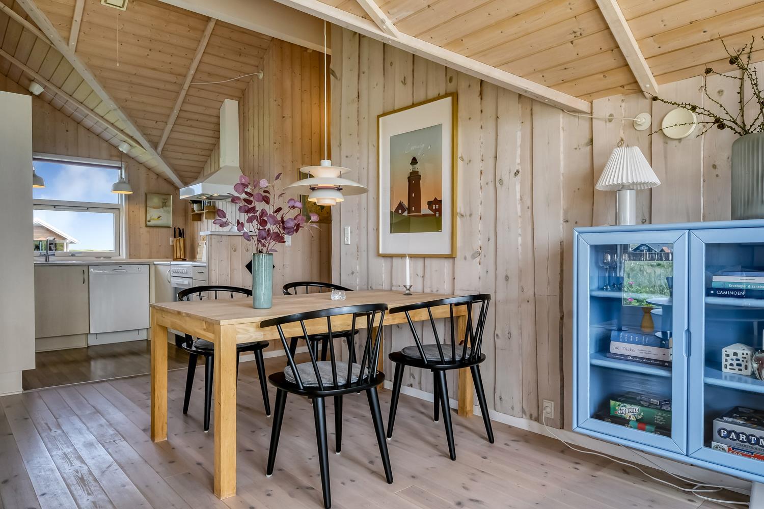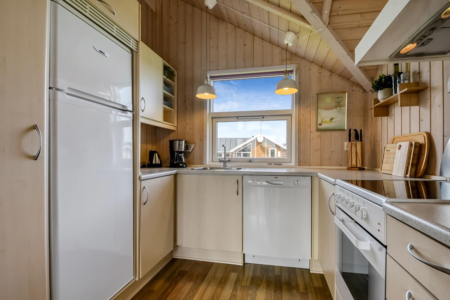 Så snart man har hentet nøglen til huset kan ferien begynde. Man bliver mødt af et hyggeligt indrettet hus på 70 m2 som er bygget 2005. En lille entré byder velkommen til et lyst og indbydende opholdsrum. Opholdsrummet består af en stor og godt udnyttet stue med loft til kip og et køkkenhjørne. I stuen er der et stort vinduesparti der giver et godt lysindfald og blik på den nye terrasse. Desuden er der hyggelige polstermøbler og fjernsyn med danske og tyske kanaler. Brændeovnen bidrager til god opvarmning og ekstra hygge på køligere dage, og lænestolen lige ved siden af indbyder til afslapning ved f.eks. at læse en bog. Køkkenhjørnet er veludstyret med blandt andet glaskeramisk komfur, emhætte, køle-/fryseskab, opvaskemaskine og mikroovn. I huset er der et fint lyst badeværelse med toilet, håndvask og bruser og der er også en vaskemaskine. Badeværelse opvarmes med gulvvarme. Til sidst er der tre hyggelige soveværelser. Et værelse er med dobbeltseng, det andet værelse er med to enkeltsenge og det sidste værelse er med en køjeseng.
