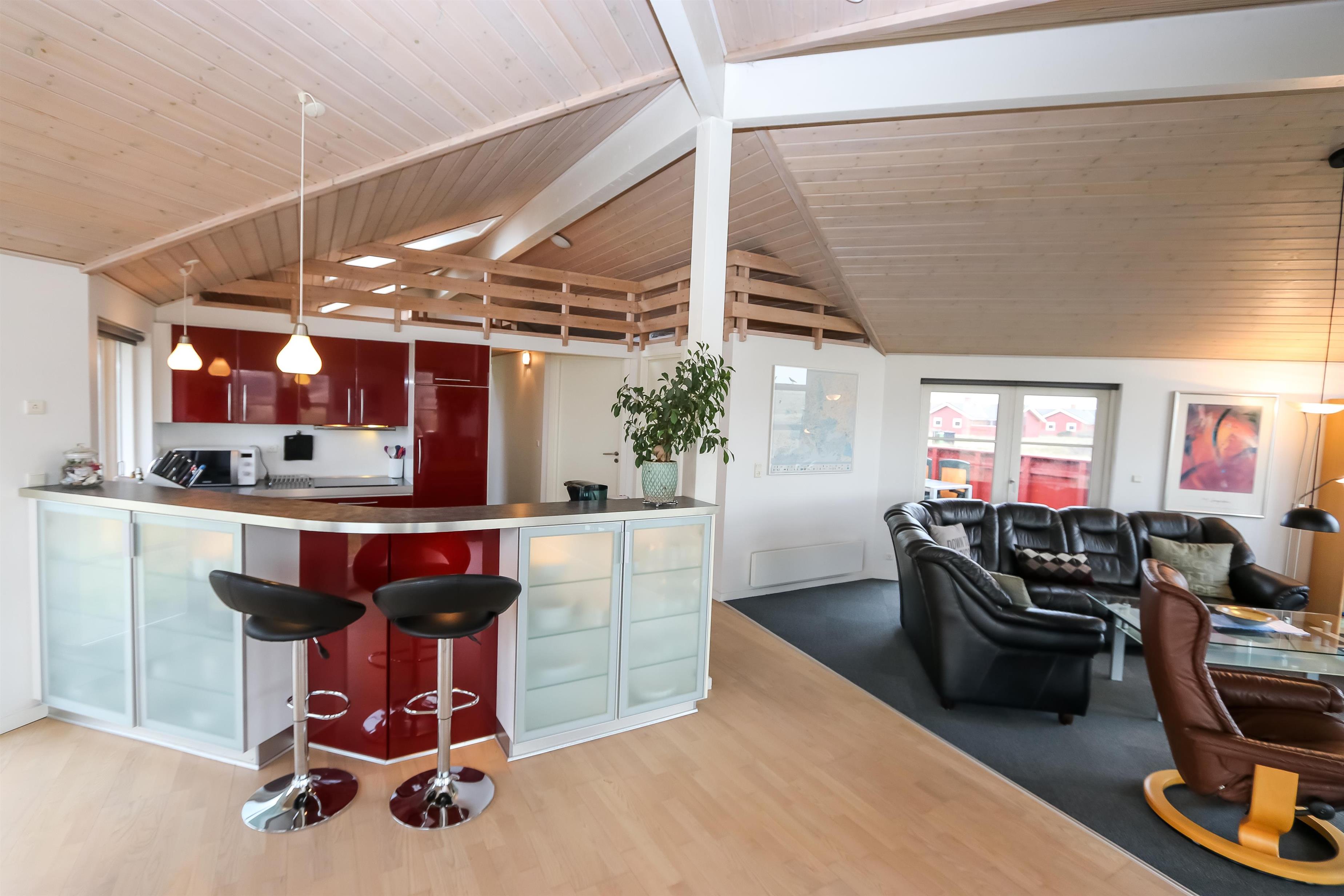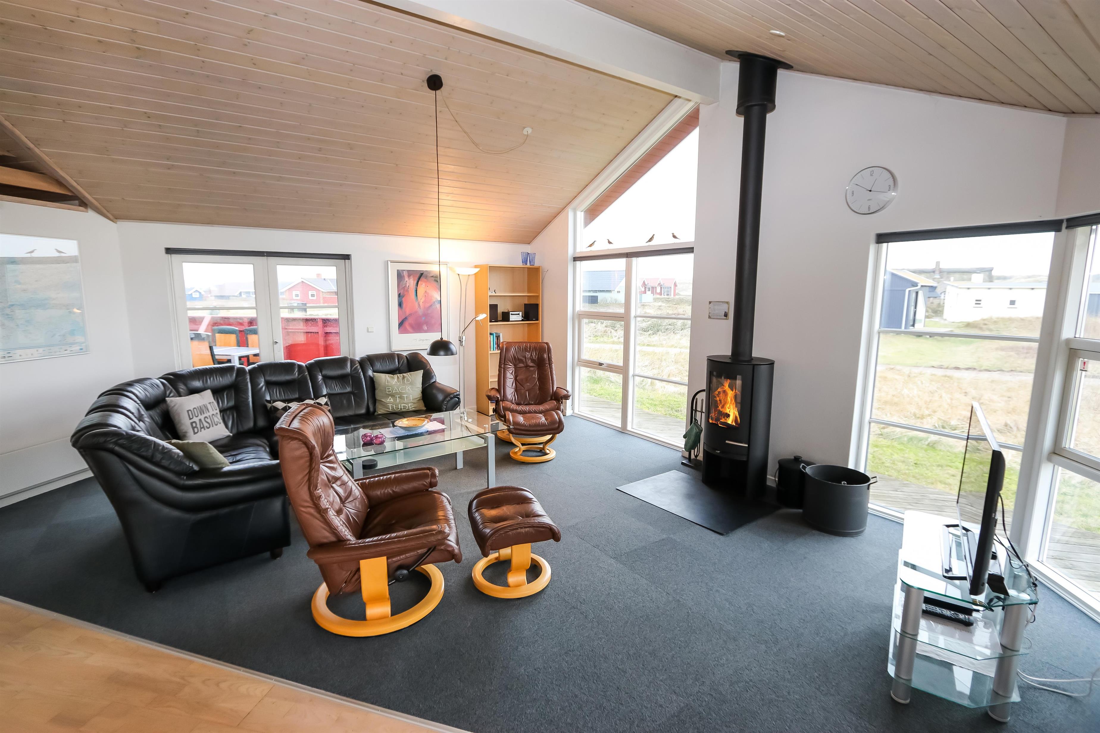 I dette hus er der en dejlig, stor stue som er med komfortable møbler, brændeovn, varmepumpe, fladskærms-TV med DR1 samt en parabol til de tyske kanaler. Der er vinduer og døre, som går fra gulv til loft, hvilket giver et fantastisk lysindfald i rummet og er med til give en rar og hyggelig atmosfære. Stor, lys spise og opholdsstue med loft til kip, flotte trægulve og hvid malede vægge, der er 3 udgange til terrasserne.