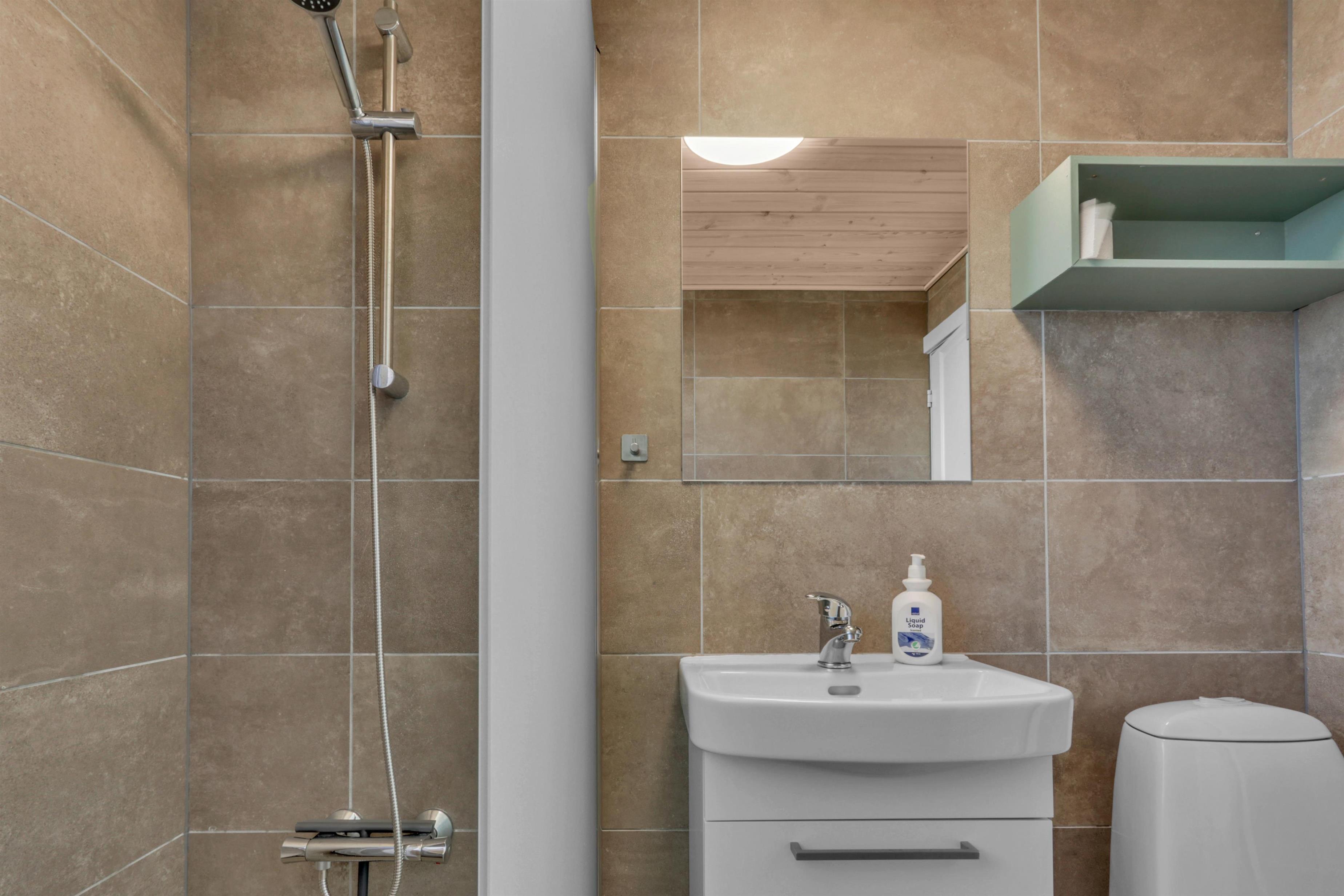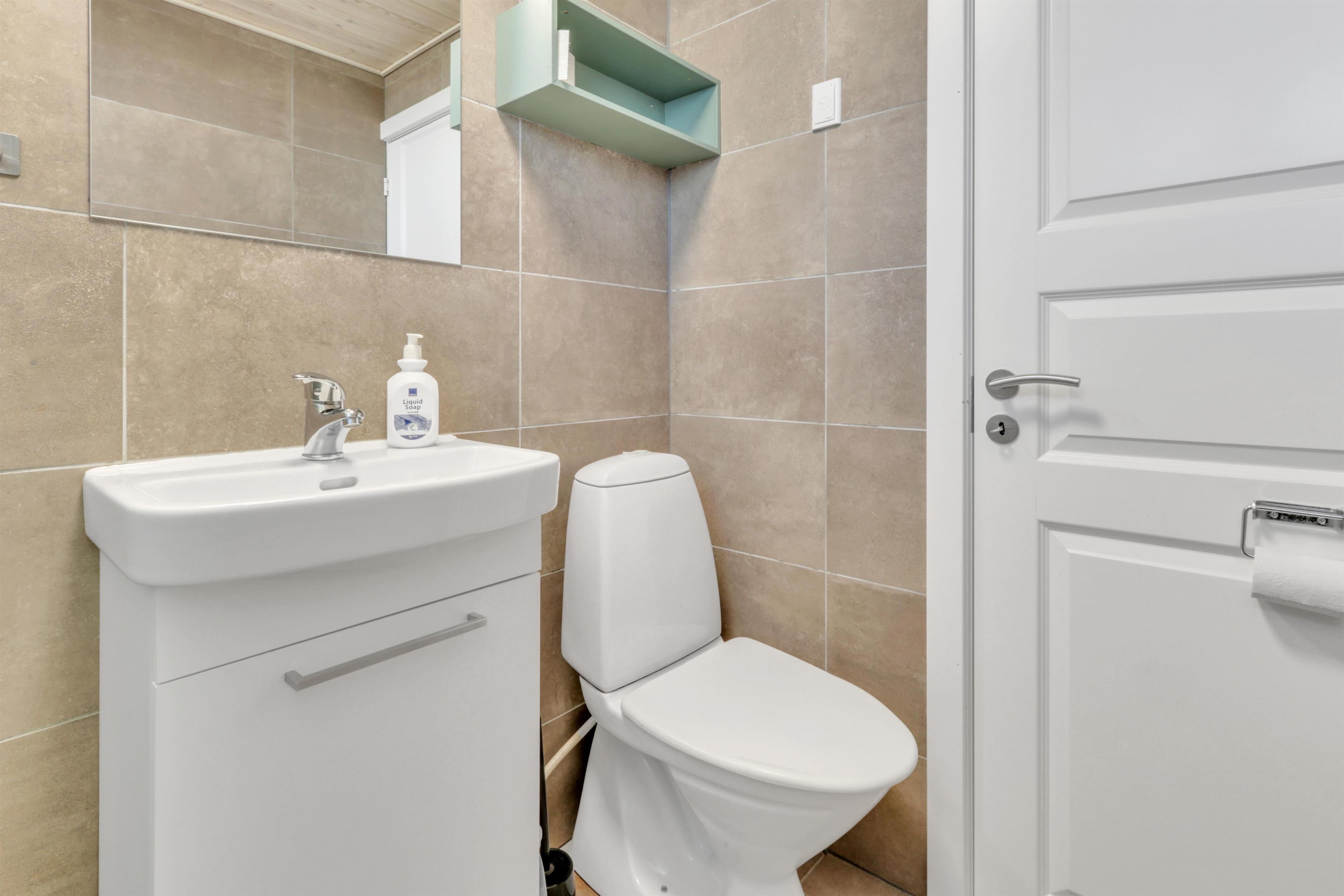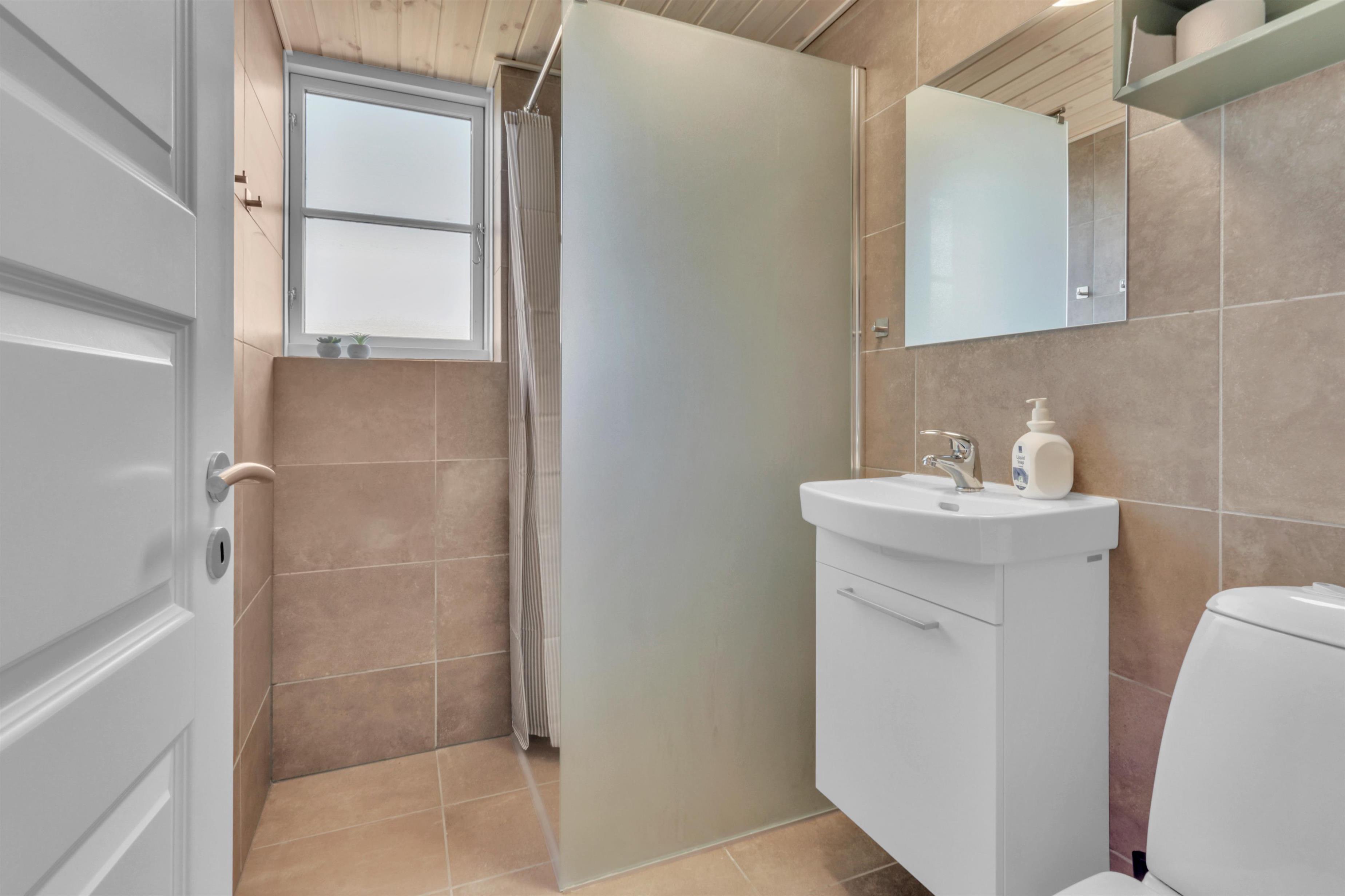 Der er et badeværelse i huset, som er helt nyrenoveret med moderne inventar og gulvvarme. Her er der toilet, håndvask og bruser.