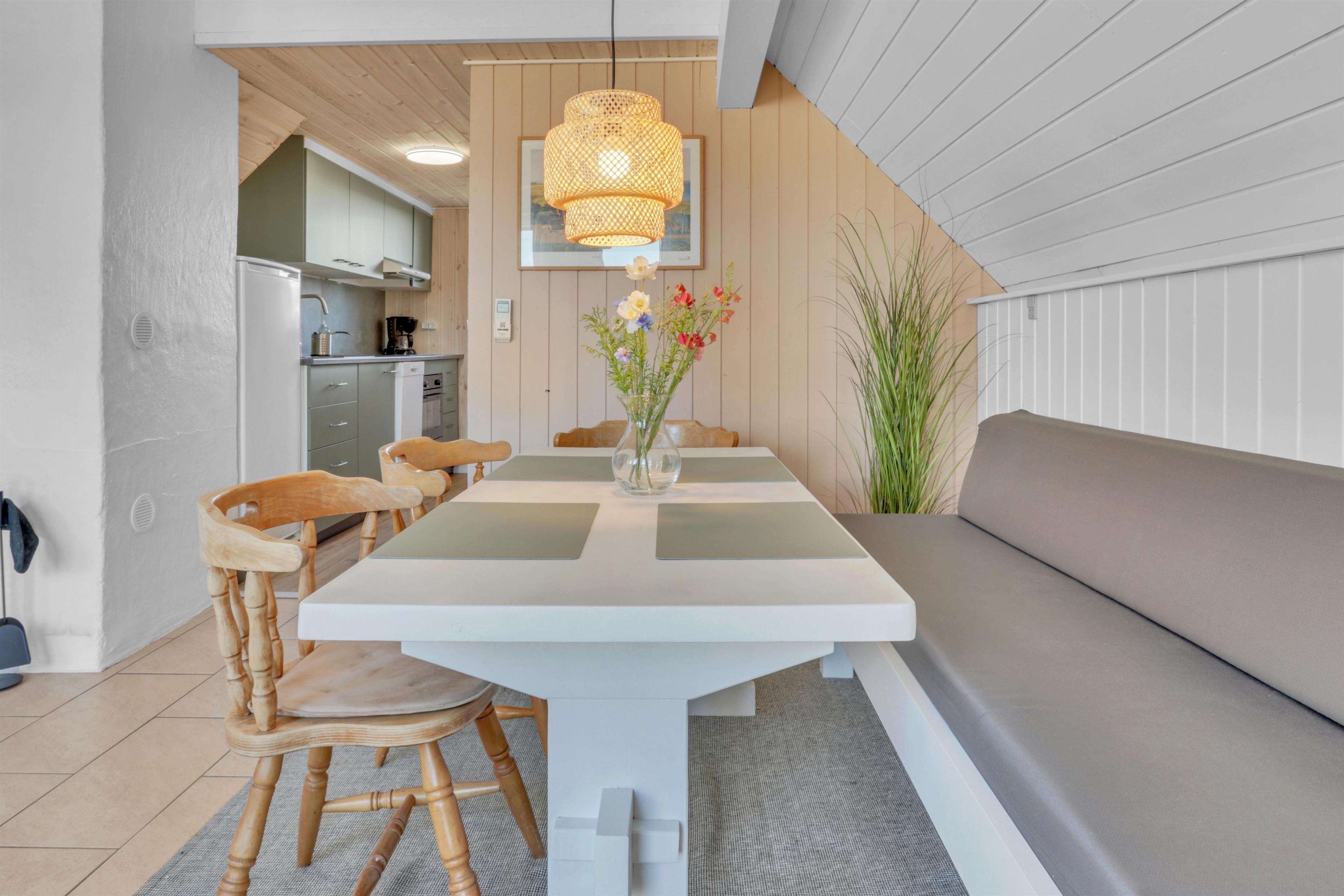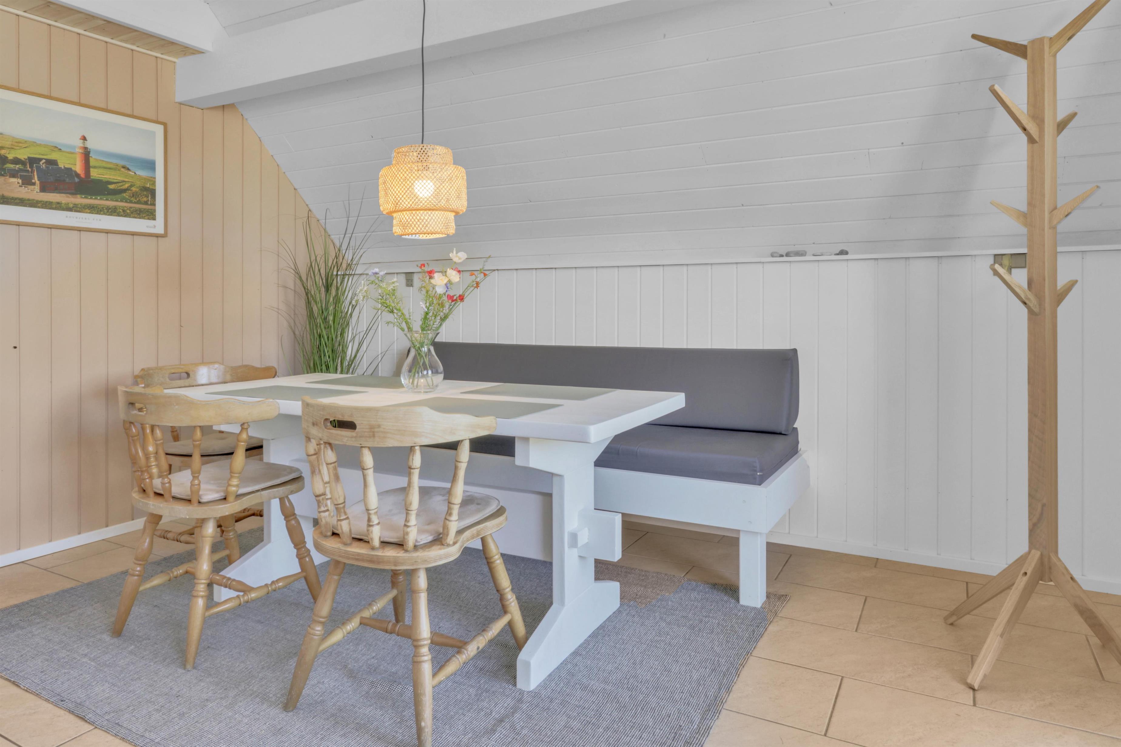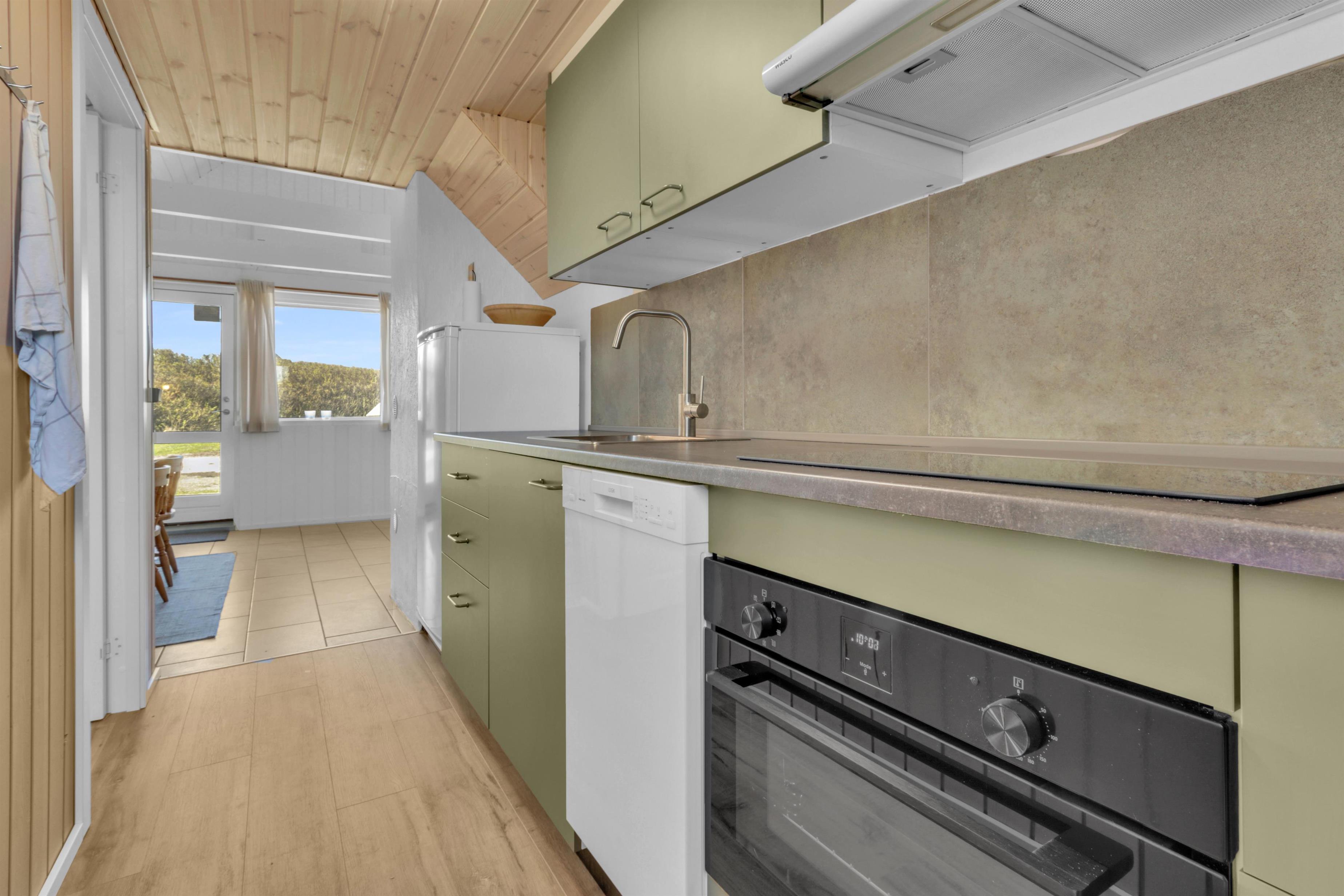 Det flotte, nye køkken er et af husets højdepunkter. Det har en stilfuld mint-grøn farve og er fuldt udstyret med el-keramiske kogeplader, indbygningsovn, emhætte, køle-/fryseskab og opvaskemaskine. Her er alt, hvad du behøver for at tilberede lækre måltider og nyde en ubekymret ferie ved Vesterhavet.