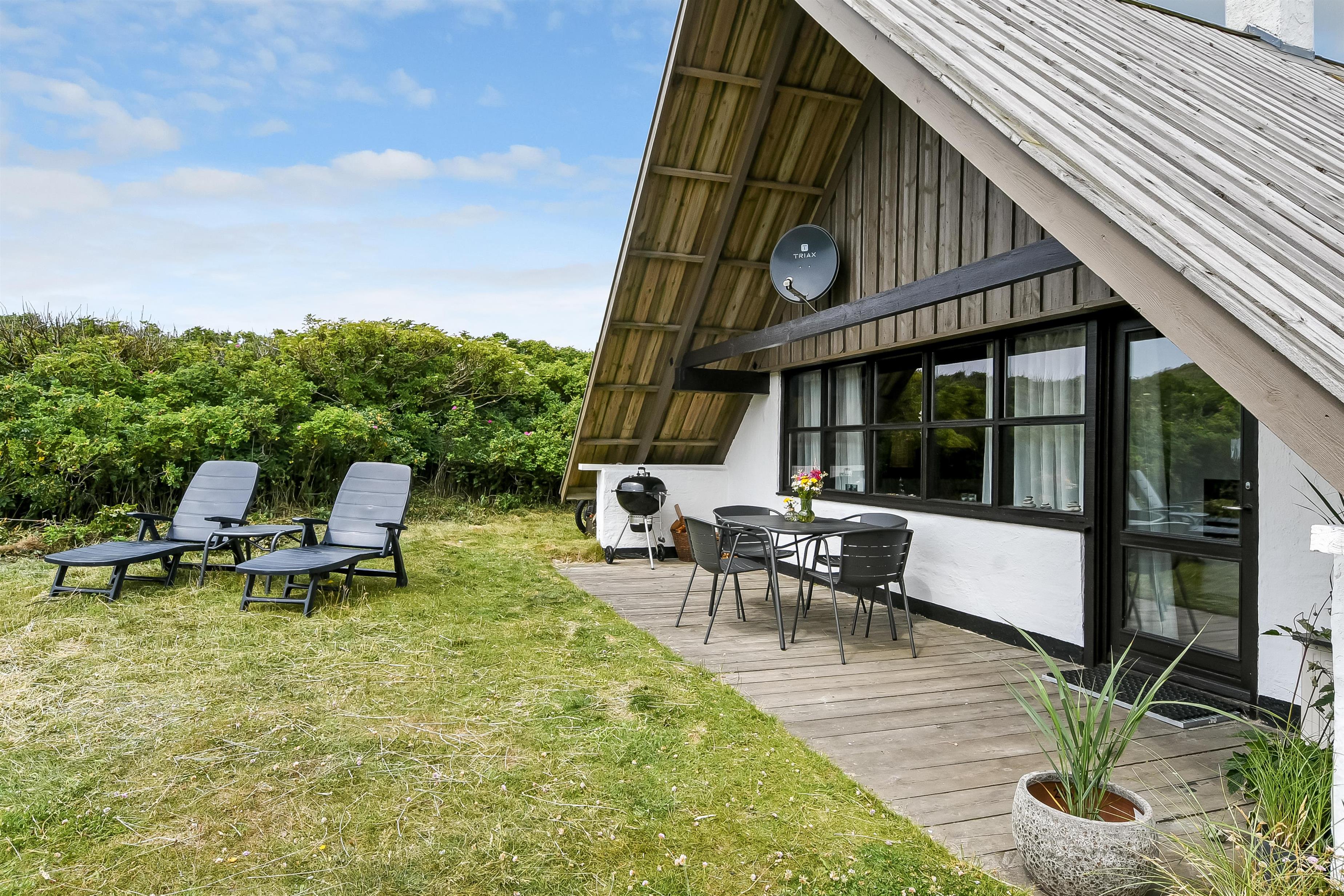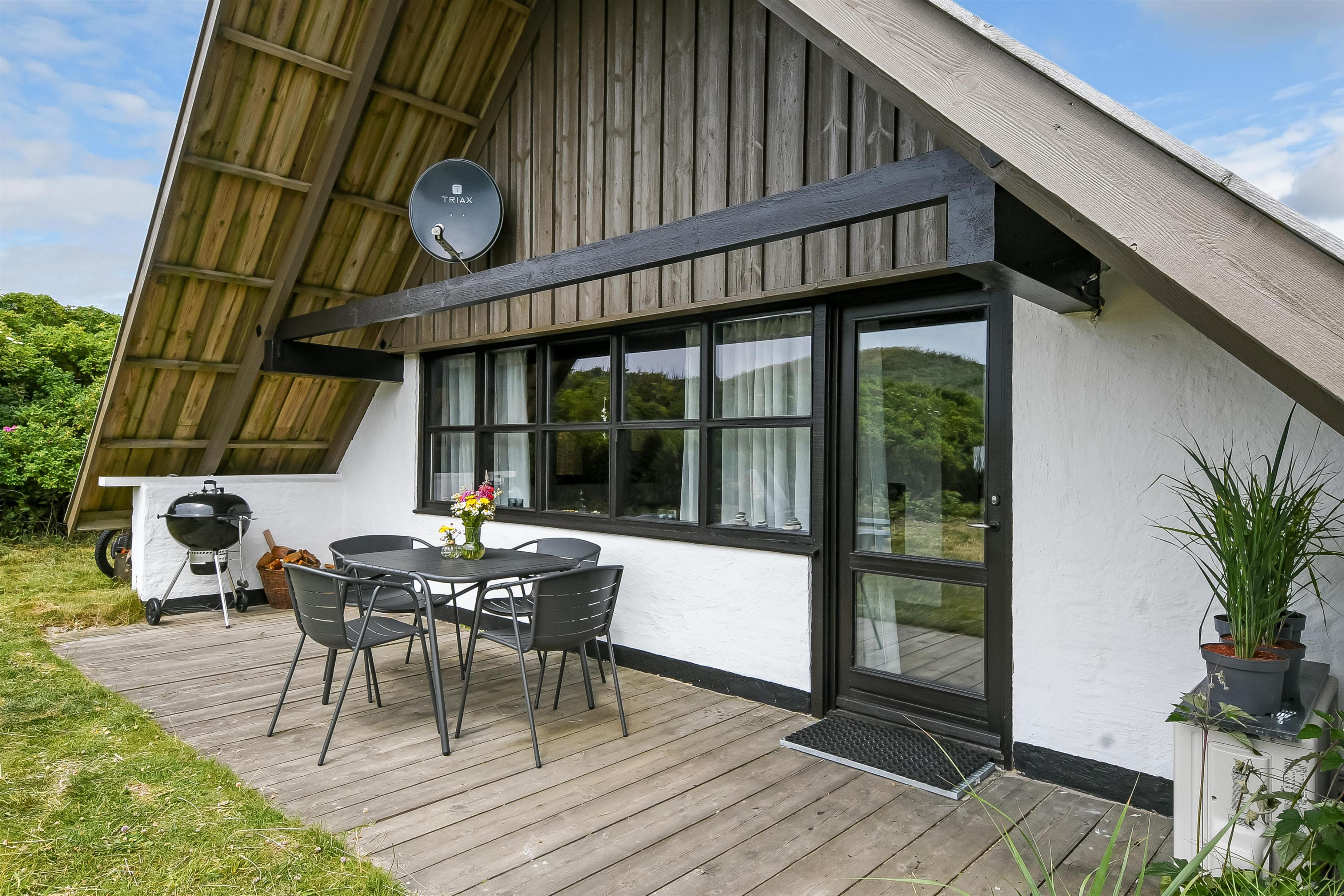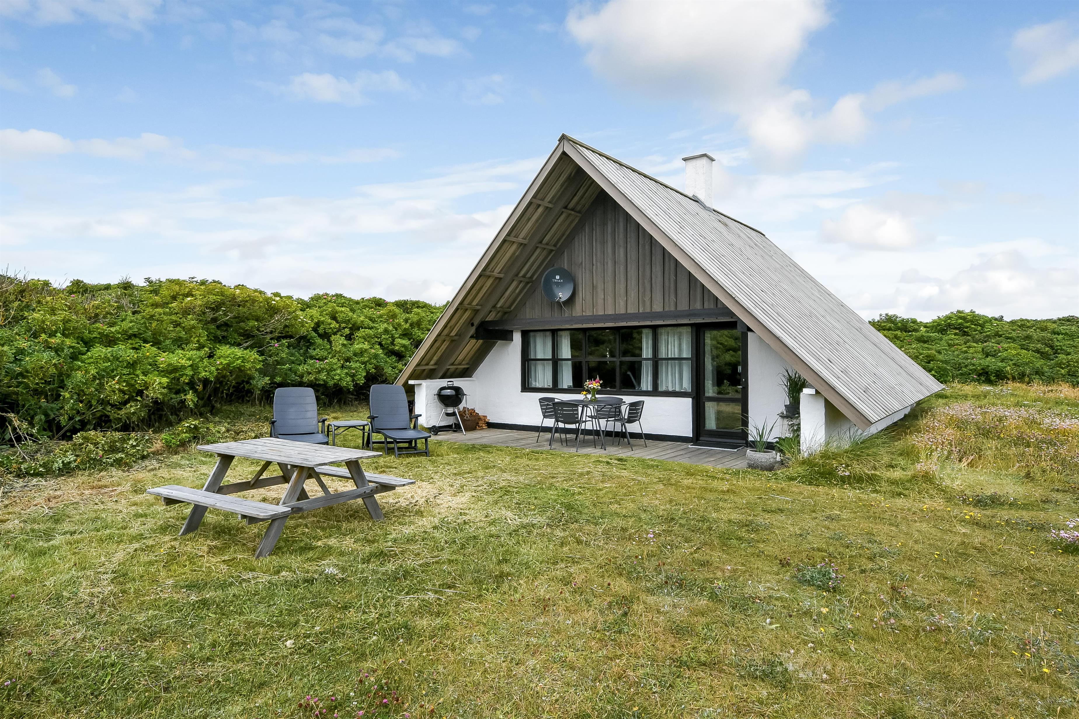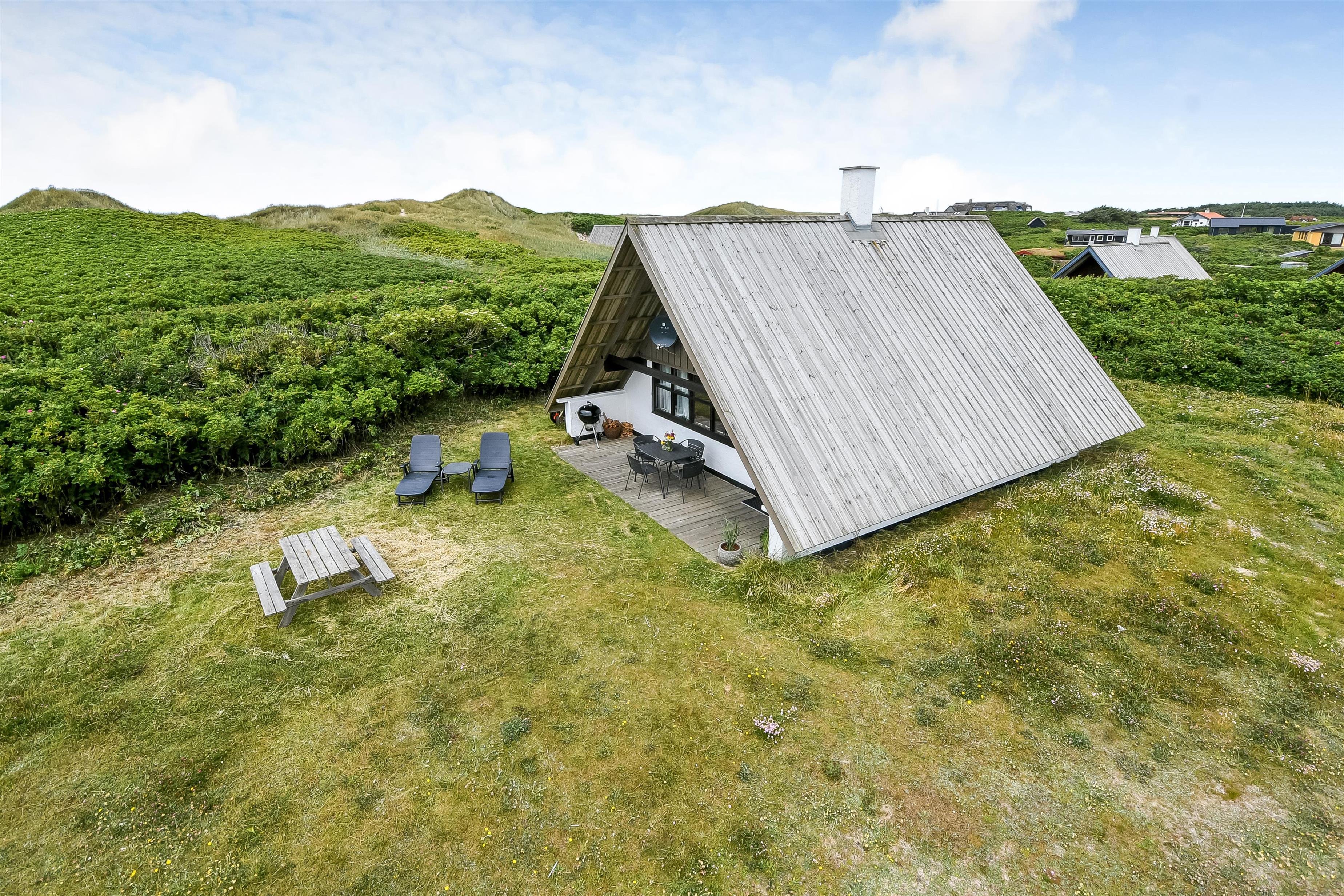 Fra opholdsstuen er der udgang til en lille, overdækket terrasse med havemøbler, 2 solvogne og Weber kulgrill. Huset er en del af Fjaltring Ferieby som består af 25 næsten identiske A-huse fordelt i 5 cirkler. Hele Feriebyen ligge i en dejlig ”gryde” i det fredede klitlandskab kun ca. 200m fra Vesterhavet. Ved fælleshuset er der el-bil-oplader til rådighed. Nyd en økonomisk ferie i et enkelt feriehus med en helt unik beliggenhed. Parker bilen og nyd at I resten af ferien kan gå til stranden på under 5 minutter. Oplev det brusende Vesterhav som hverdag byder på nye oplevelser. Gå en tur eller dyrk den daglige motion langs med havet, i det smukke landskab eller udforsk områdets mange andre muligheder.