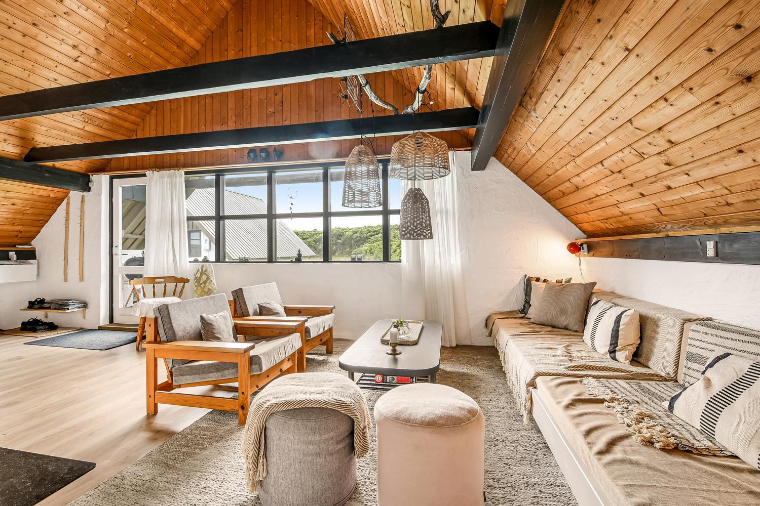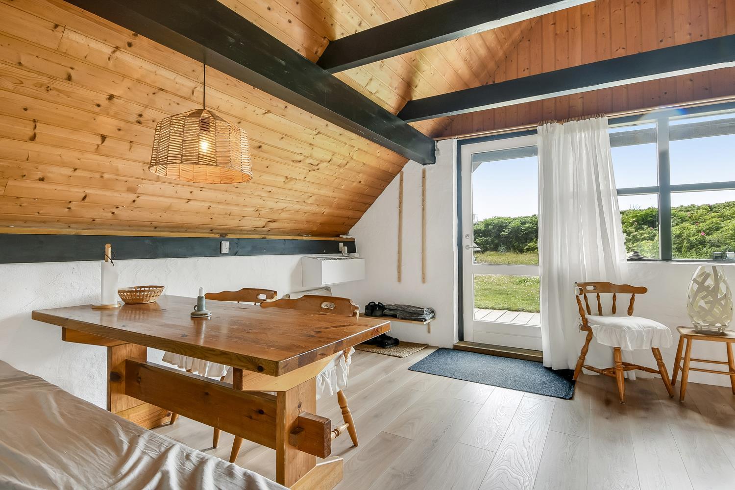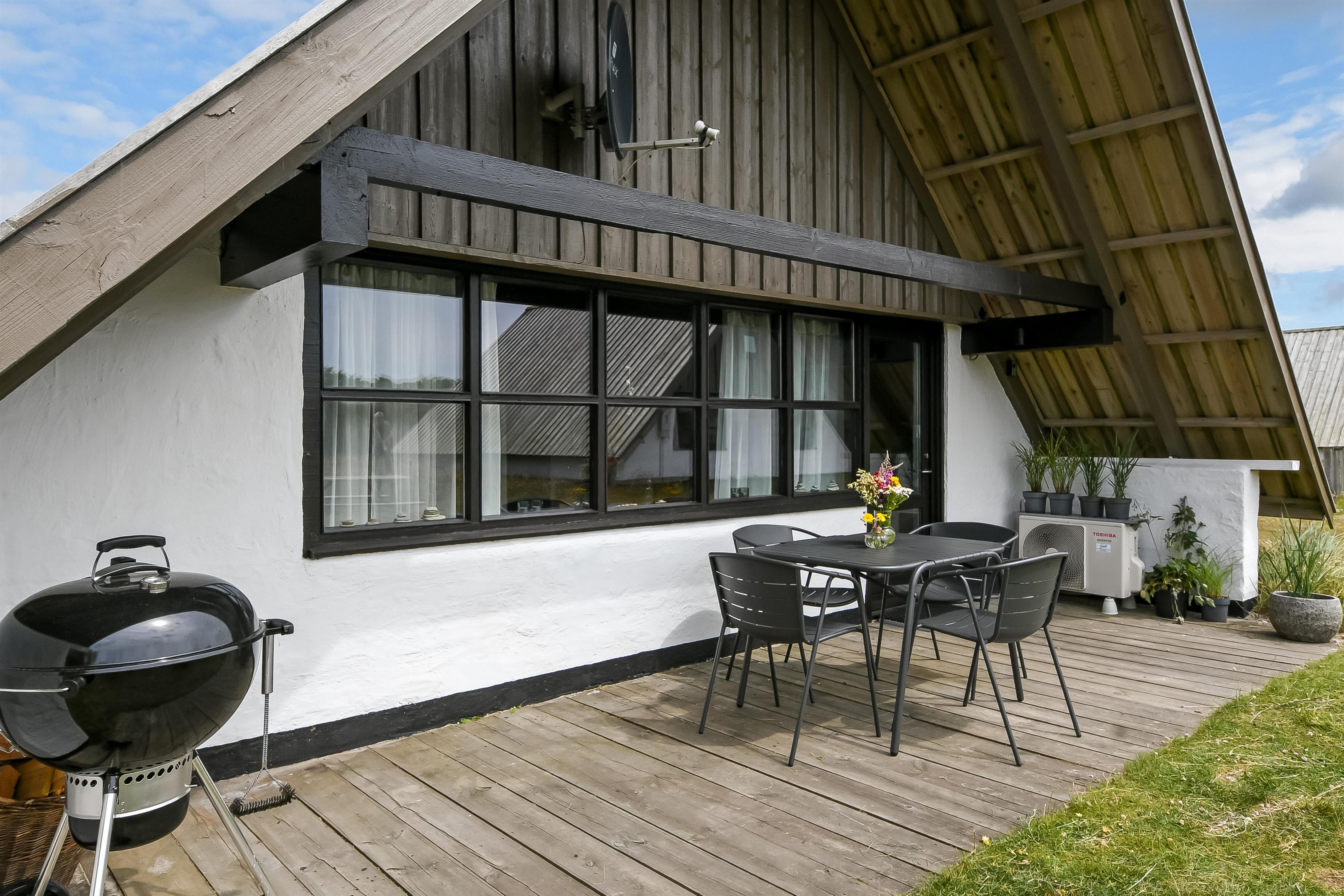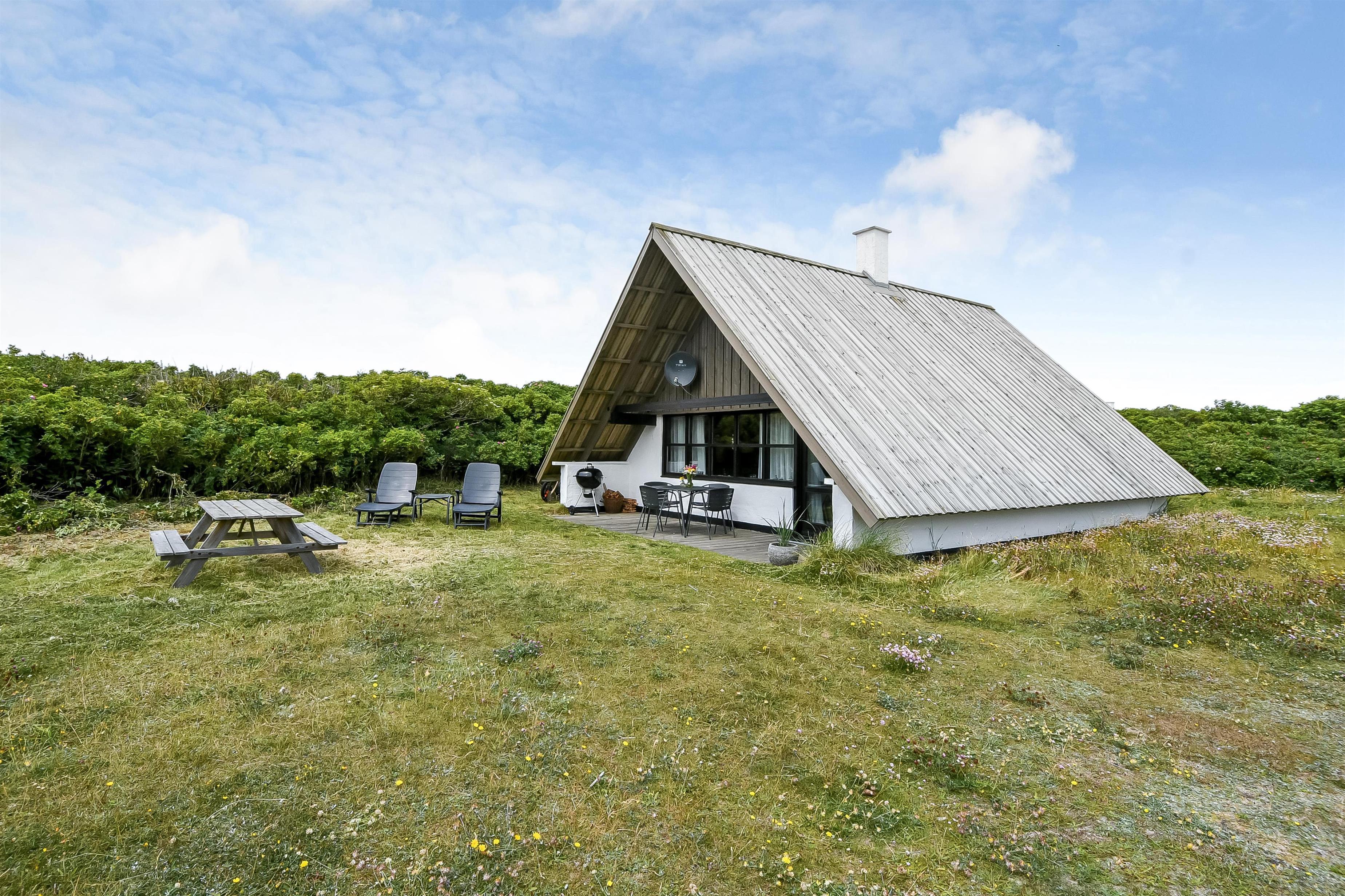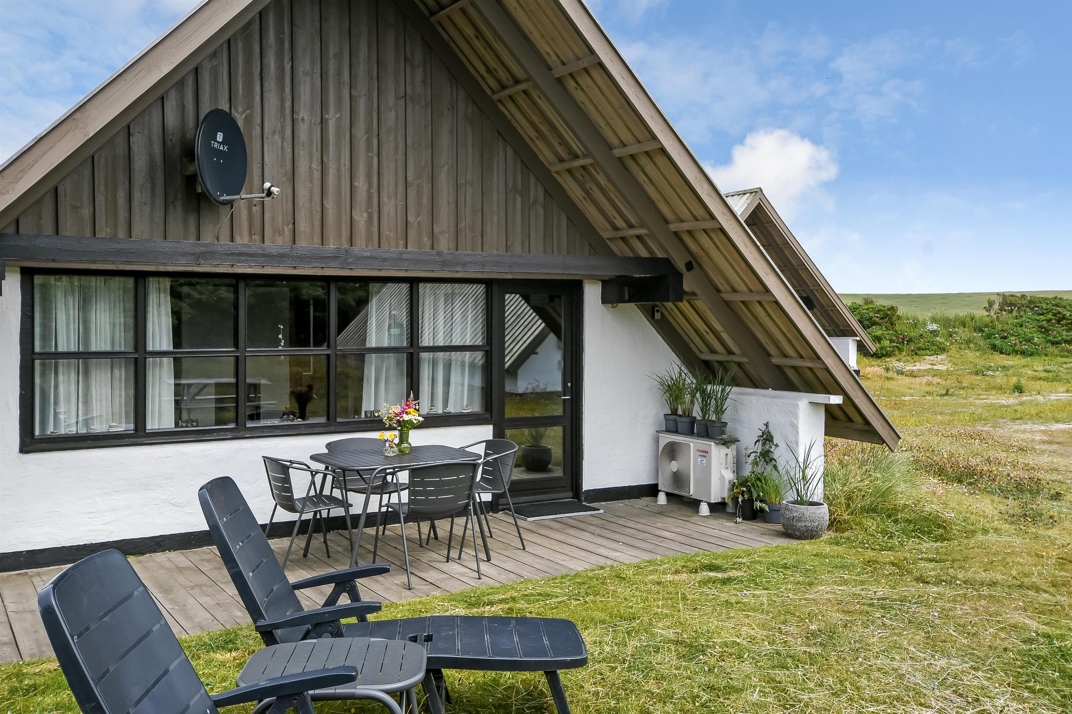 Fra opholdsstuen er der udgang til en lille, overdækket terrasse med havemøbler, 2 solvogne og Weber kulgrill. Huset er en del af Fjaltring Ferieby som består af 25 næsten identiske A-huse fordelt i 5 cirkler. Hele Feriebyen ligge i en dejlig ”gryde” i det fredede klitlandskab kun ca. 200m fra Vesterhavet. Ved fælleshuset er der el-bil-oplader til rådighed. Nyd en økonomisk ferie i et enkelt feriehus med en helt unik beliggenhed. Parker bilen og nyd at I resten af ferien kan gå til stranden på under 5 minutter. Oplev det brusende Vesterhav som hverdag byder på nye oplevelser. Gå en tur eller dyrk den daglige motion langs med havet, i det smukke landskab eller udforsk områdets mange andre muligheder.
