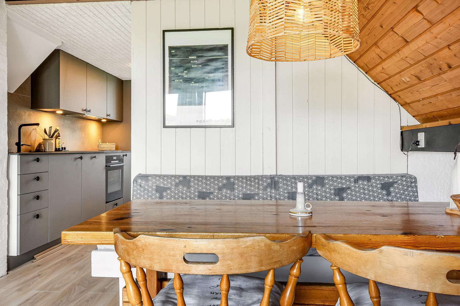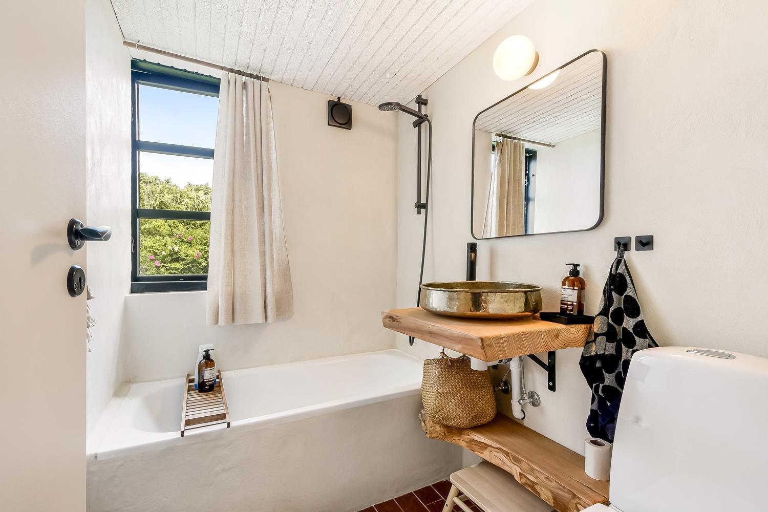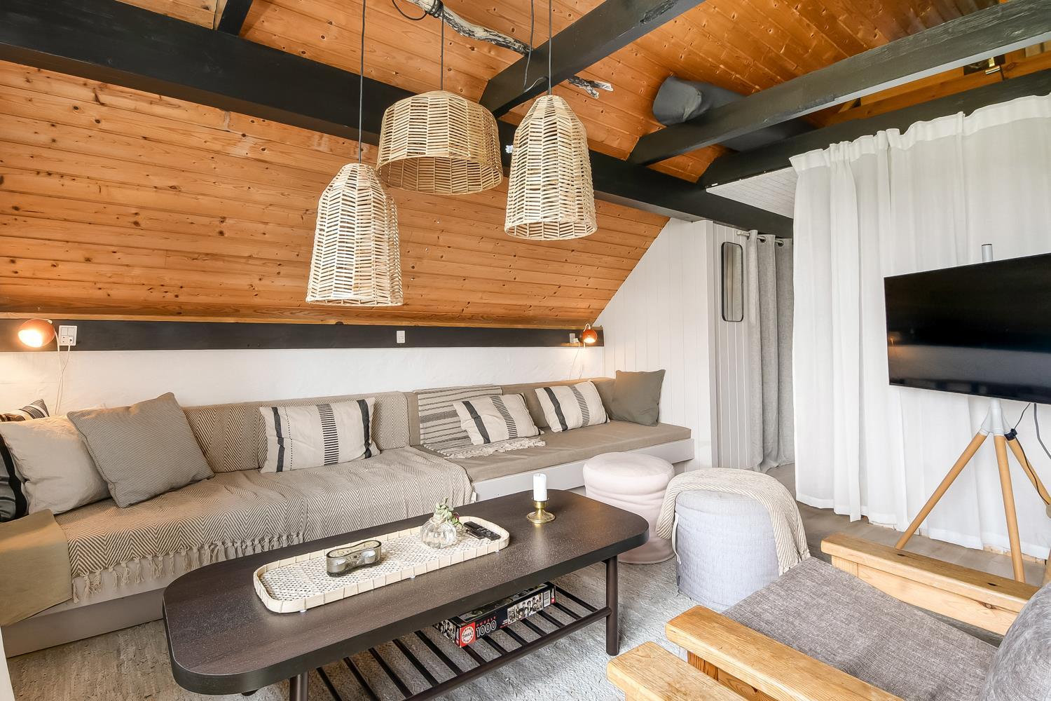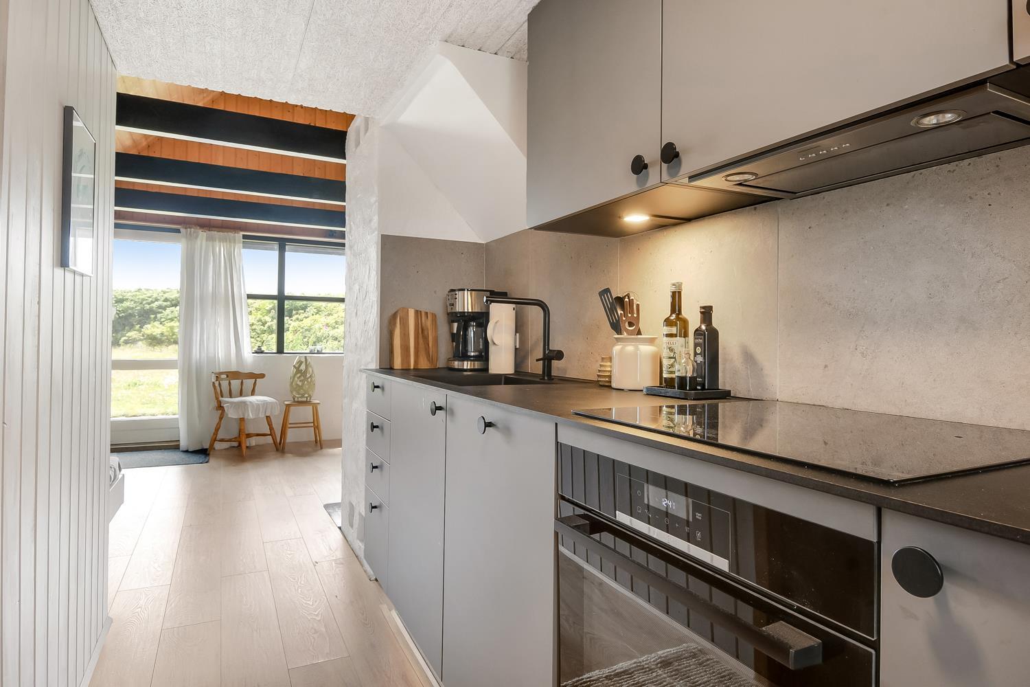 Fra opholdsstuen er der udgang til en lille, overdækket terrasse med havemøbler, 2 solvogne og Weber kulgrill. Huset er en del af Fjaltring Ferieby som består af 25 næsten identiske A-huse fordelt i 5 cirkler. Hele Feriebyen ligge i en dejlig ”gryde” i det fredede klitlandskab kun ca. 200m fra Vesterhavet. Ved fælleshuset er der el-bil-oplader til rådighed. Nyd en økonomisk ferie i et enkelt feriehus med en helt unik beliggenhed. Parker bilen og nyd at I resten af ferien kan gå til stranden på under 5 minutter. Oplev det brusende Vesterhav som hverdag byder på nye oplevelser. Gå en tur eller dyrk den daglige motion langs med havet, i det smukke landskab eller udforsk områdets mange andre muligheder.