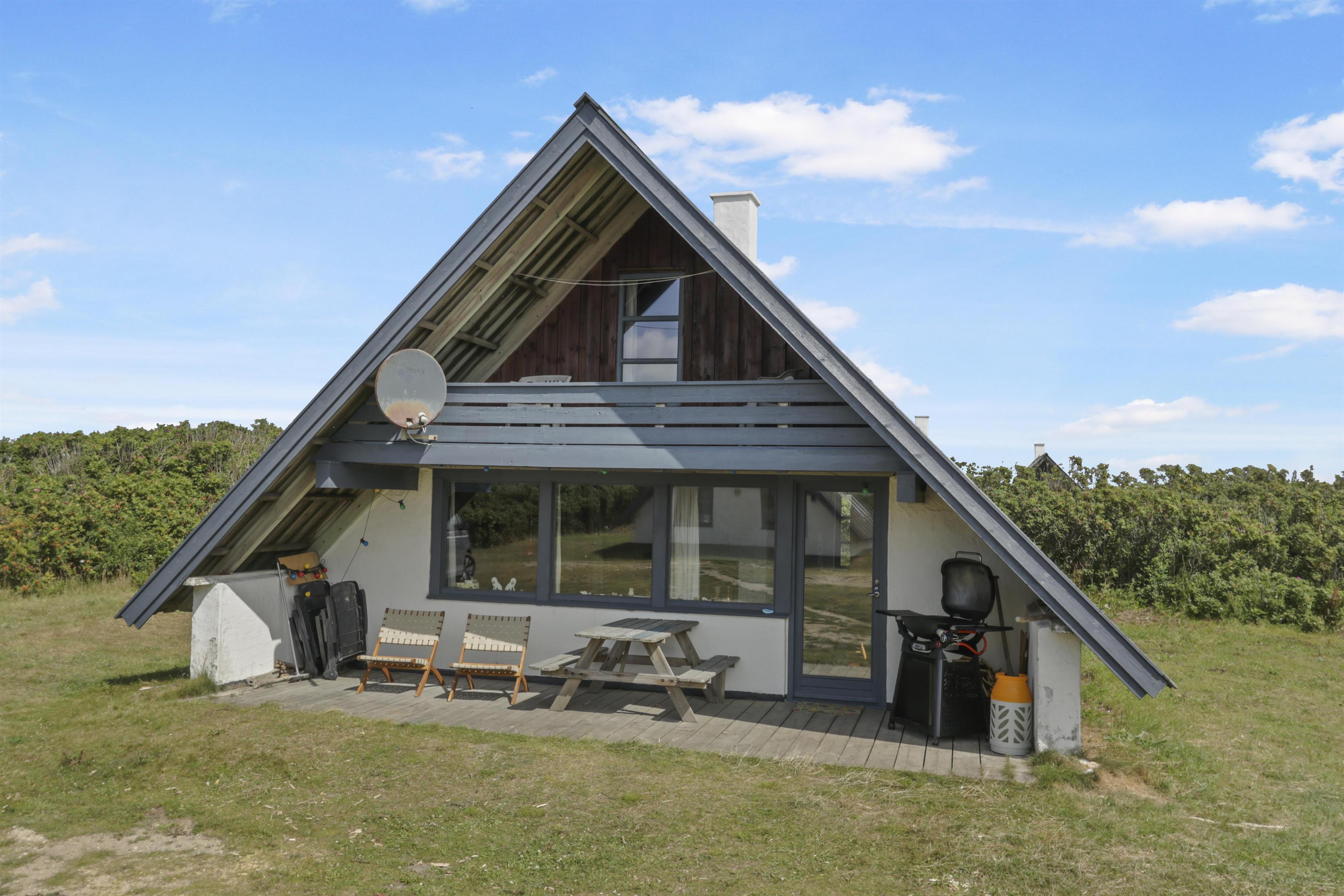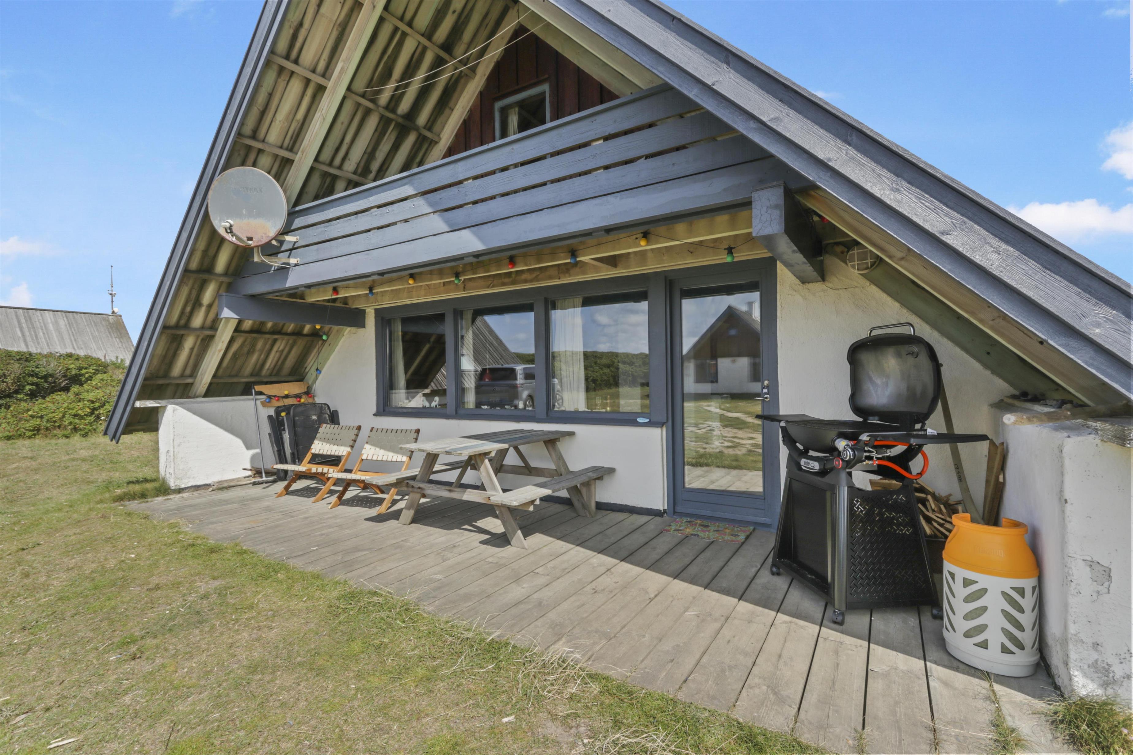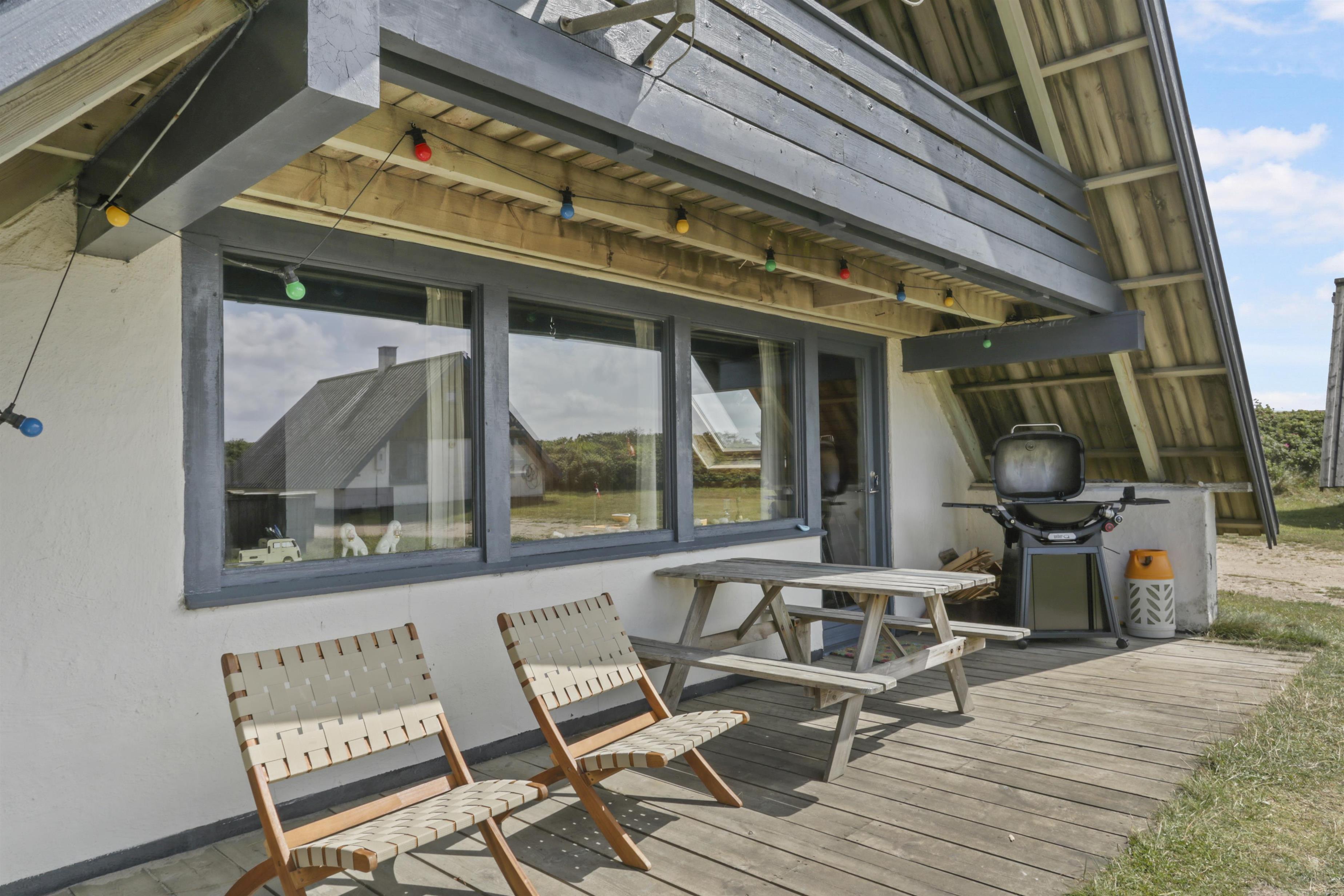 Fra stuen er der adgang til en hyggelig, overdækket terrasse med havemøbler, liggestole og grill – perfekt til lange sommeraftener. På husets balkon får I en skøn udsigt over klitterne og kan ane havets bølger i horisonten.