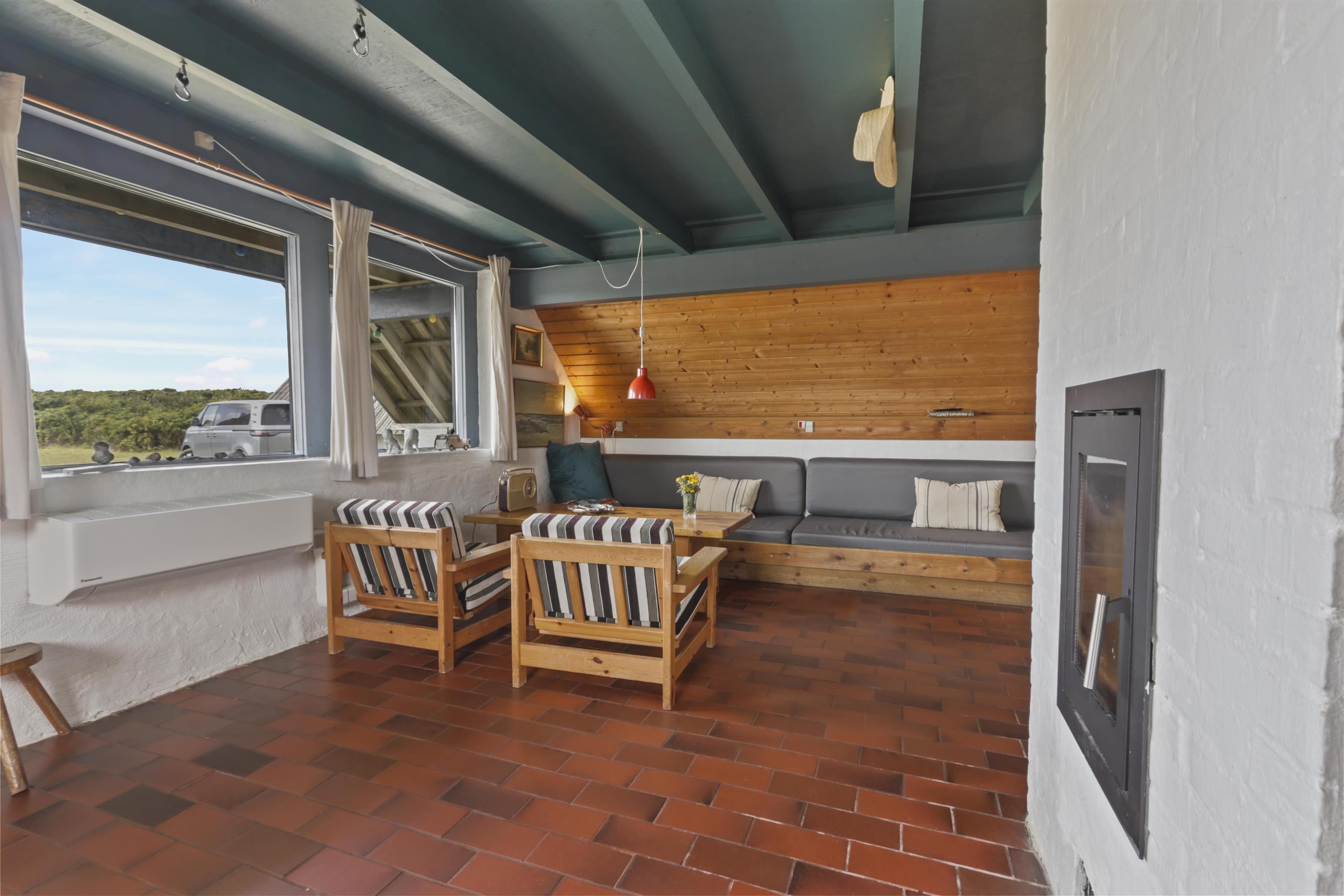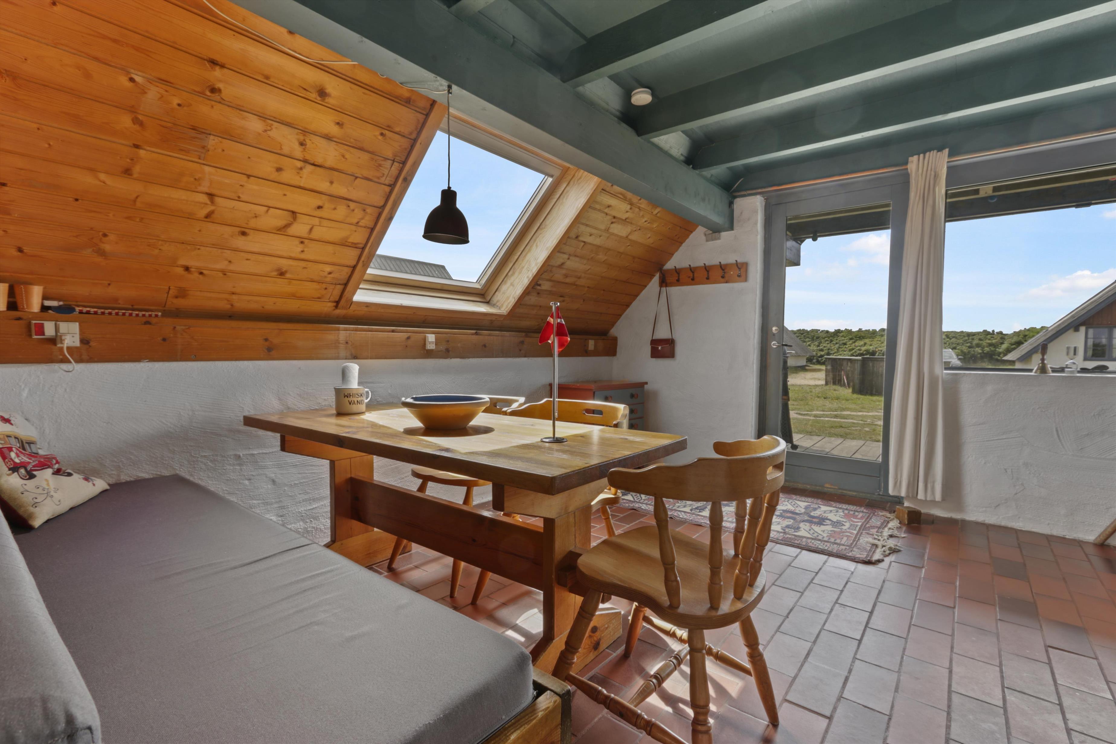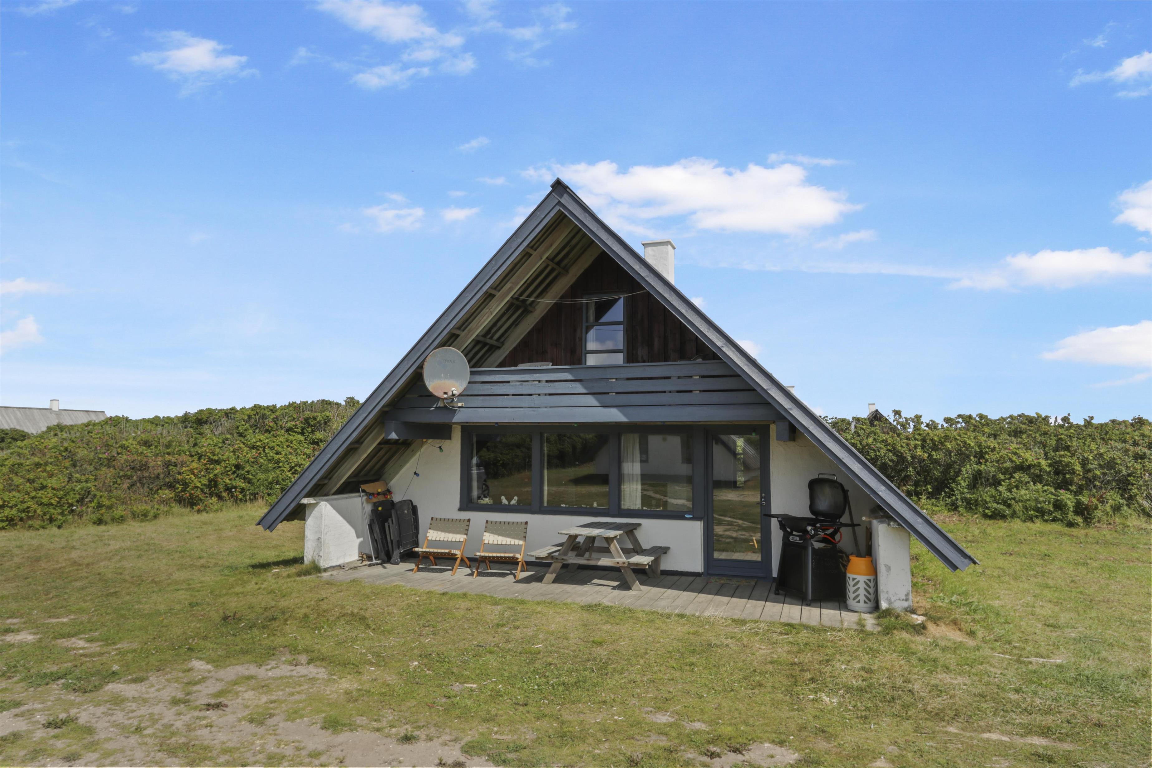 Fra stuen er der adgang til en hyggelig, overdækket terrasse med havemøbler, liggestole og grill – perfekt til lange sommeraftener. På husets balkon får I en skøn udsigt over klitterne og kan ane havets bølger i horisonten.