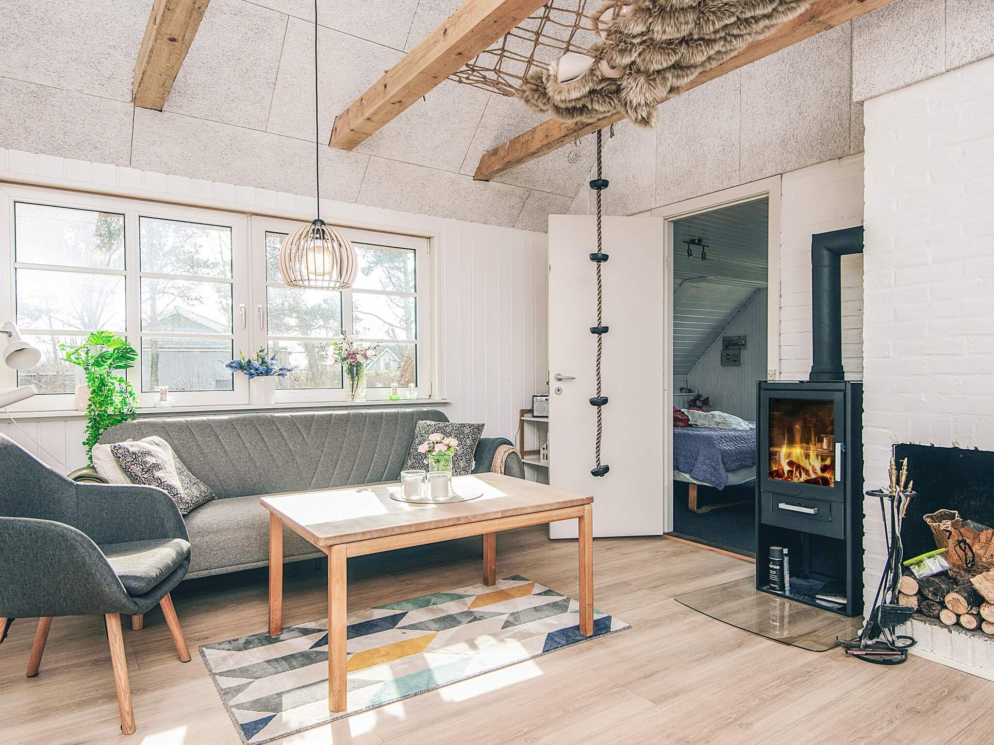 Dette lille sommerhus oser af charme udenfor såvel som indenfor og er skønt og fredeligt beliggende i Fjand. Indenfor hersker en personlig og hyggelig indretning med masser af små detaljer. Det veludstyrede køkken ligger i åben forbindelse med den kombinerede opholds- og spisestue, hvor det også er muligt at lune sig ved brændeovnens sagte ild på en kold sommeraften. Foruden tv og trådløst internet er sommerhuset tilmed udstyret med en energivenlig luft/luft varmepumpe, som kan varme hele huset op. Fra entreen er der adgang til husets badeværelse, som har gulvvarme, vaskemaskine og tørretumbler. Og fra stuen er der adgang til husets to soveværelser, hvoraf det ene har dobbeltseng, mens det andet har to enkeltsenge. Sommerhusets terrasse er delvist indhegnet, som giver et læfyldt sted at sidde ude og nyde solens stråler. Huset er omgivet af en græsplæne, der indbyder til boldspil og leg.