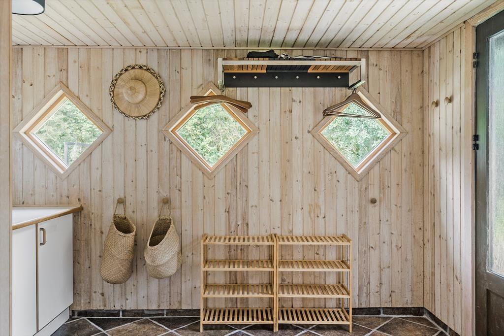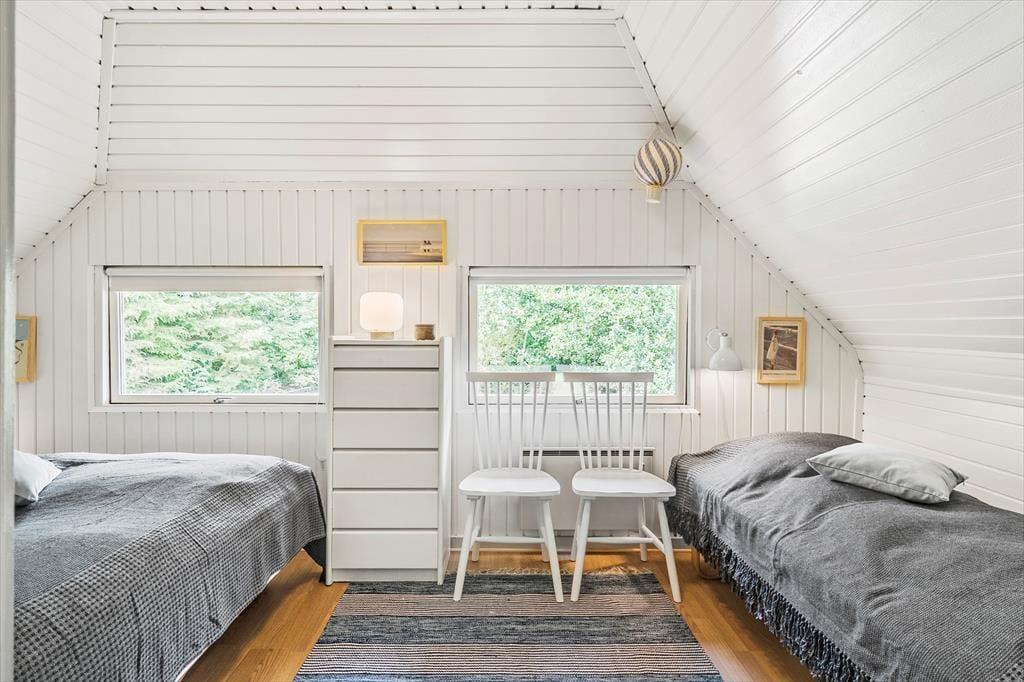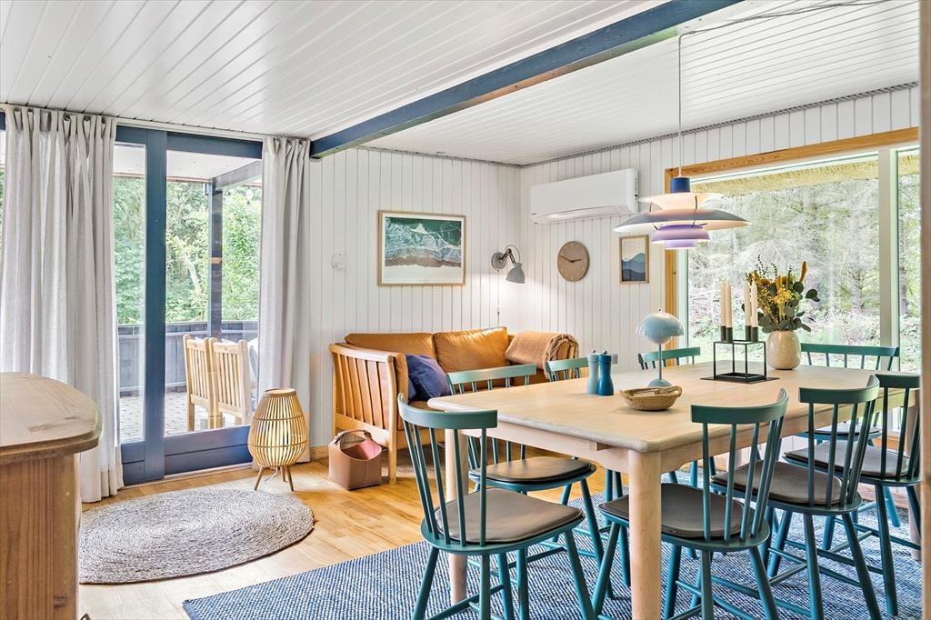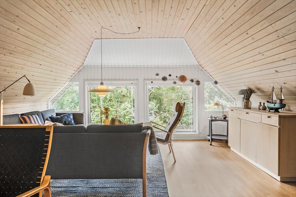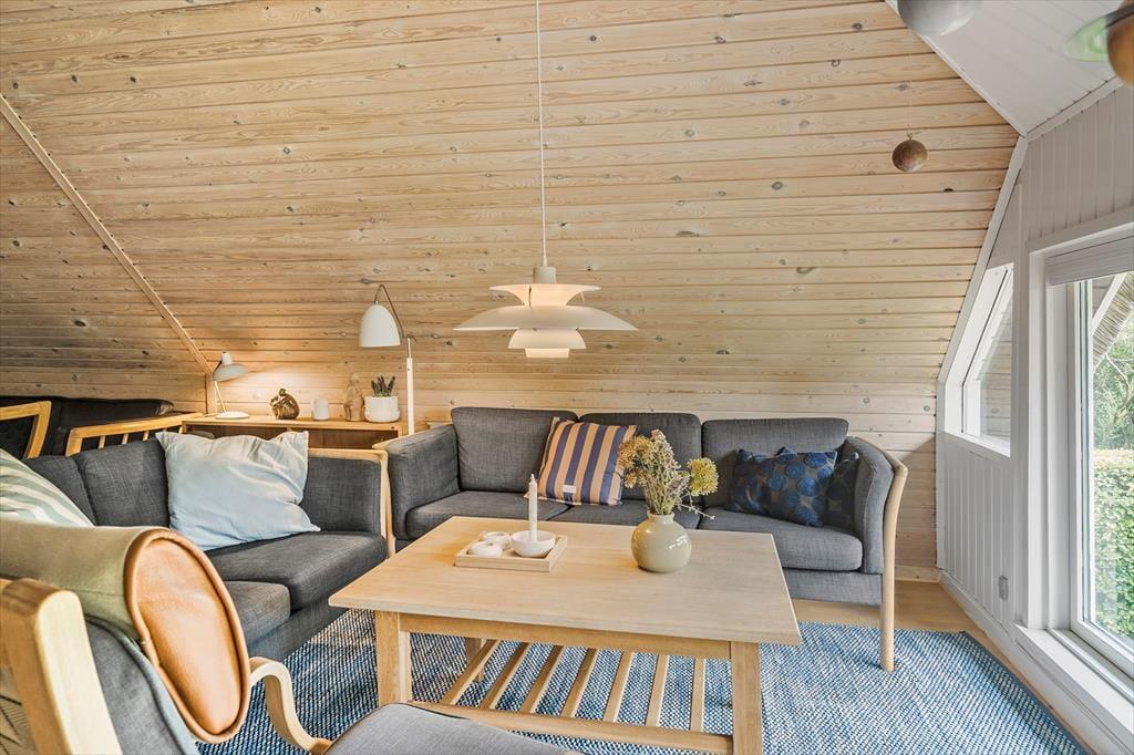 Træd ind i et charmerende træhus med stråtag, der emmer af klassisk sommerhusstemning. Her mærker I straks roen og hyggen brede sig. Indretningen er varm og indbydende med gode møbler og små detaljer, der får jer til at føle jer hjemme. I stueetagen finder I en lys opholdsstue og spiseplads i åben forbindelse med køkkenet – det perfekte sted til kortspil, hyggesnak eller en aften foran brændeovnen. I 2025 er der kommet et helt nyt køkken, som giver jer endnu bedre rammer for madlavning og samvær – moderne, funktionelt og i tråd med husets stil. Her er både brændeovn og varmepumpe, trægulve med løse tæpper og direkte udgang til en sydvestvendt terrasse, hvor solen ofte titter frem. På første sal fører en fin vindeltrappe op til en rummelig opholdsstue og et ekstra soveværelse – perfekt til afslapning, leg eller bare et stille øjeblik med en god bog.