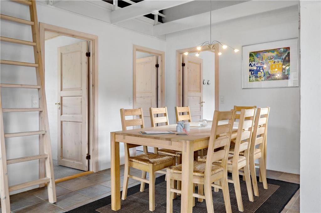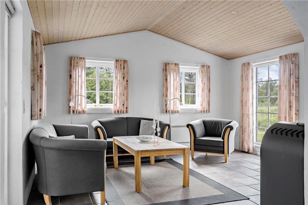 Velkommen til dette fantastiske feriehus, hvor naturen virkelig kan nydes ud af vinduerne! Stue og køkken/alrum er i åben forbindelse, hvilket giver et lyst og rummeligt miljø med lofter til kip. Fra de store vinduer i stuen har I en helt uforstyrret udsigt over den smukke naturgrund, omkranset af majestætiske træer. Her kan I ofte spotte et væld af fugle, og måske endda en hare eller et rådyr, der kigger forbi.