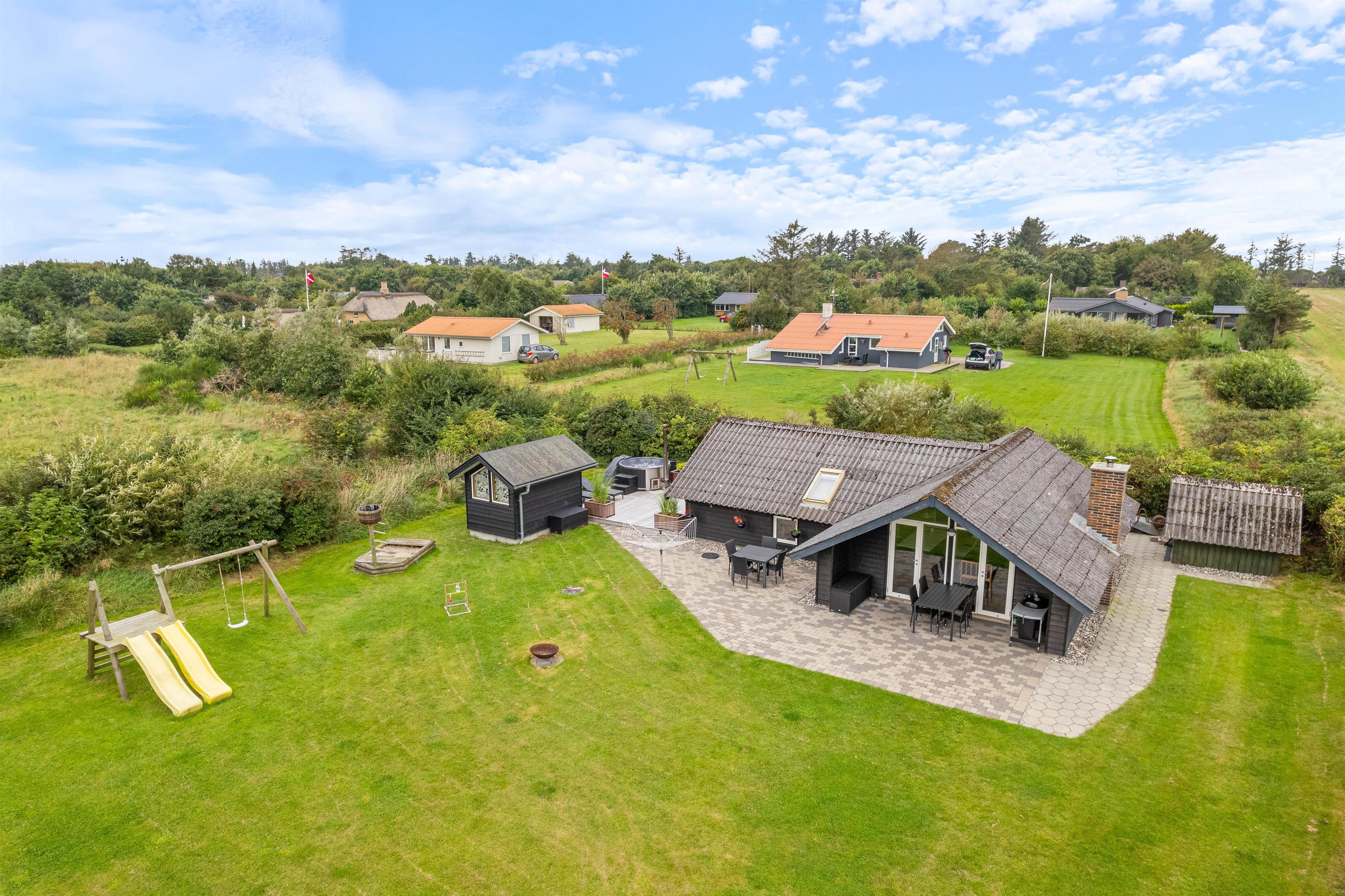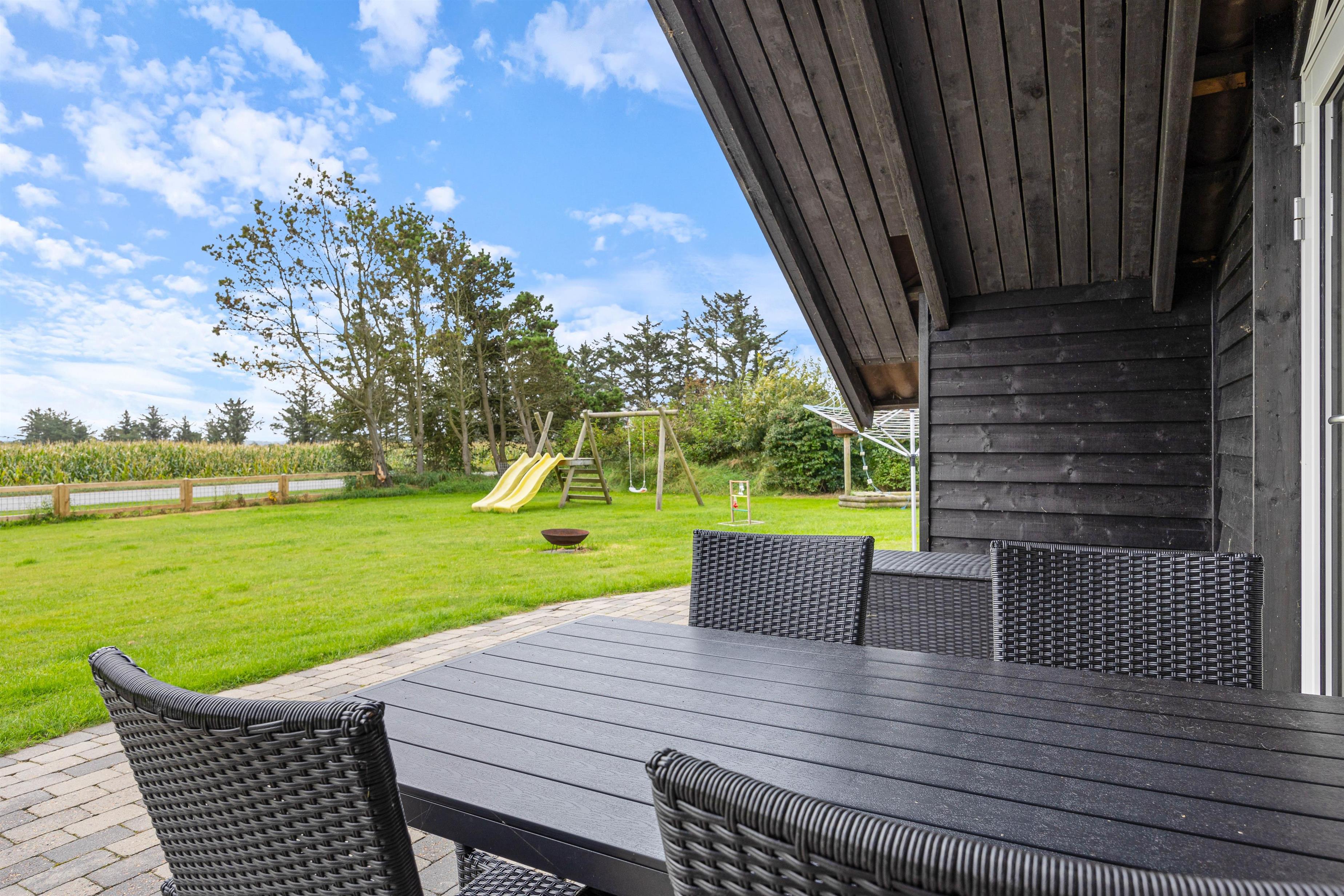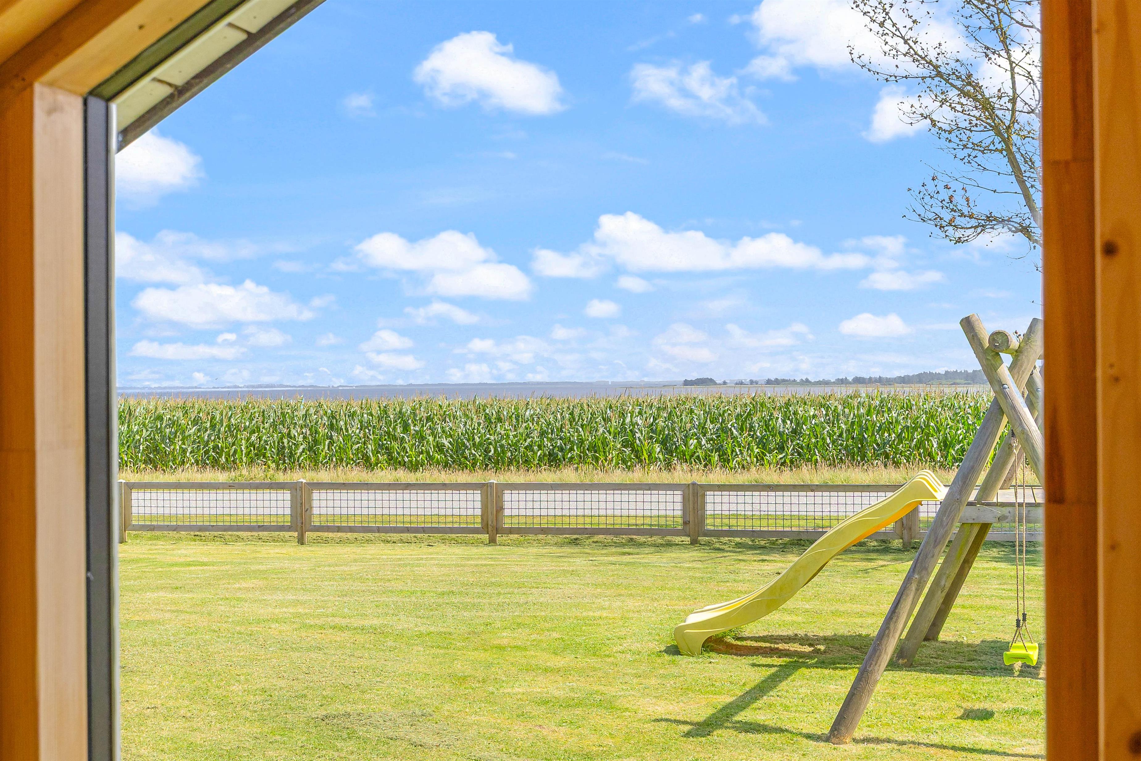 Udendørsområdet imponerer med sin overdækkede terrasse, så I kan nyde den friske Vesterhavsluft uanset vejret. Her kan I se børnene lege på legetårnet, hvor de kan klatre, rutsje og gynge. Her kan de virkelig slå sig løs. Jeres 2 hunde vil også nyde den store have. Fra feriehuset har I en fantastisk panoramaudsigt over landskabet med Nissum Fjord i baggrunden.