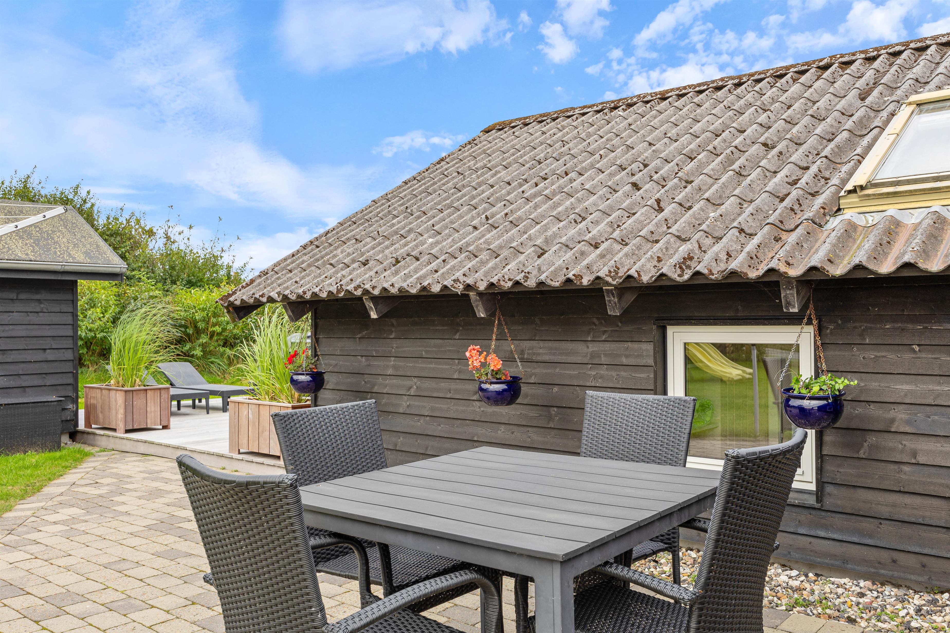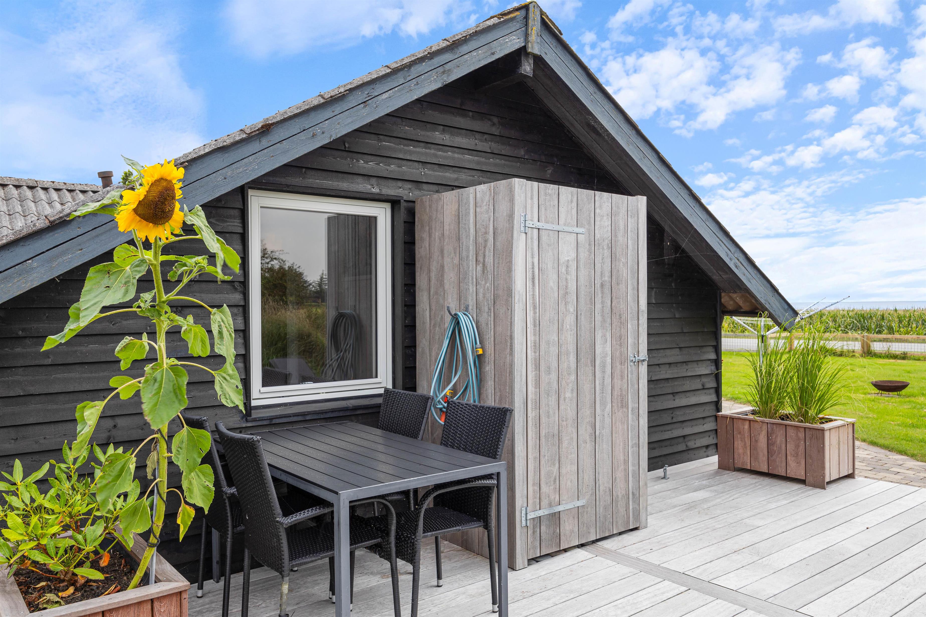 Når I kommer tilbage til feriehuset efter en tur på stranden, kan I benytte udendørsbruseren til at vaske sandet væk. Udebruseren kan benyttes fra april til november. Om aftenen kan I tænde op i grillen og slappe af i havemøblerne. Et af feriehusets højdepunkter er vildmarksbadet og udesaunaen, hvor I rigtig kan blive varmet igennem, efter en god feriedag. Her kan I nyde stjernehimlen om aftenen, mens I lytter til lyden af Vesterhavet i baggrunden.