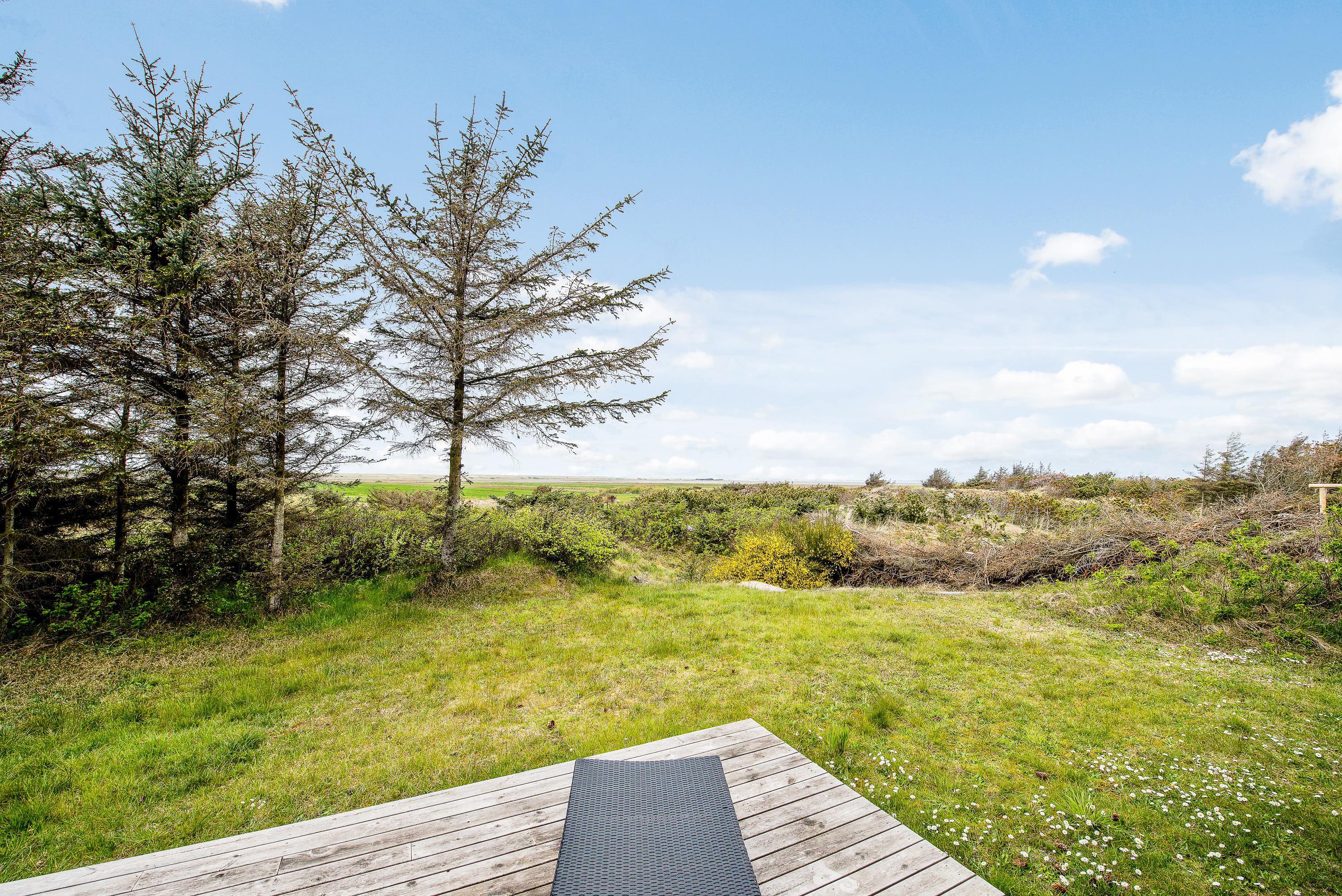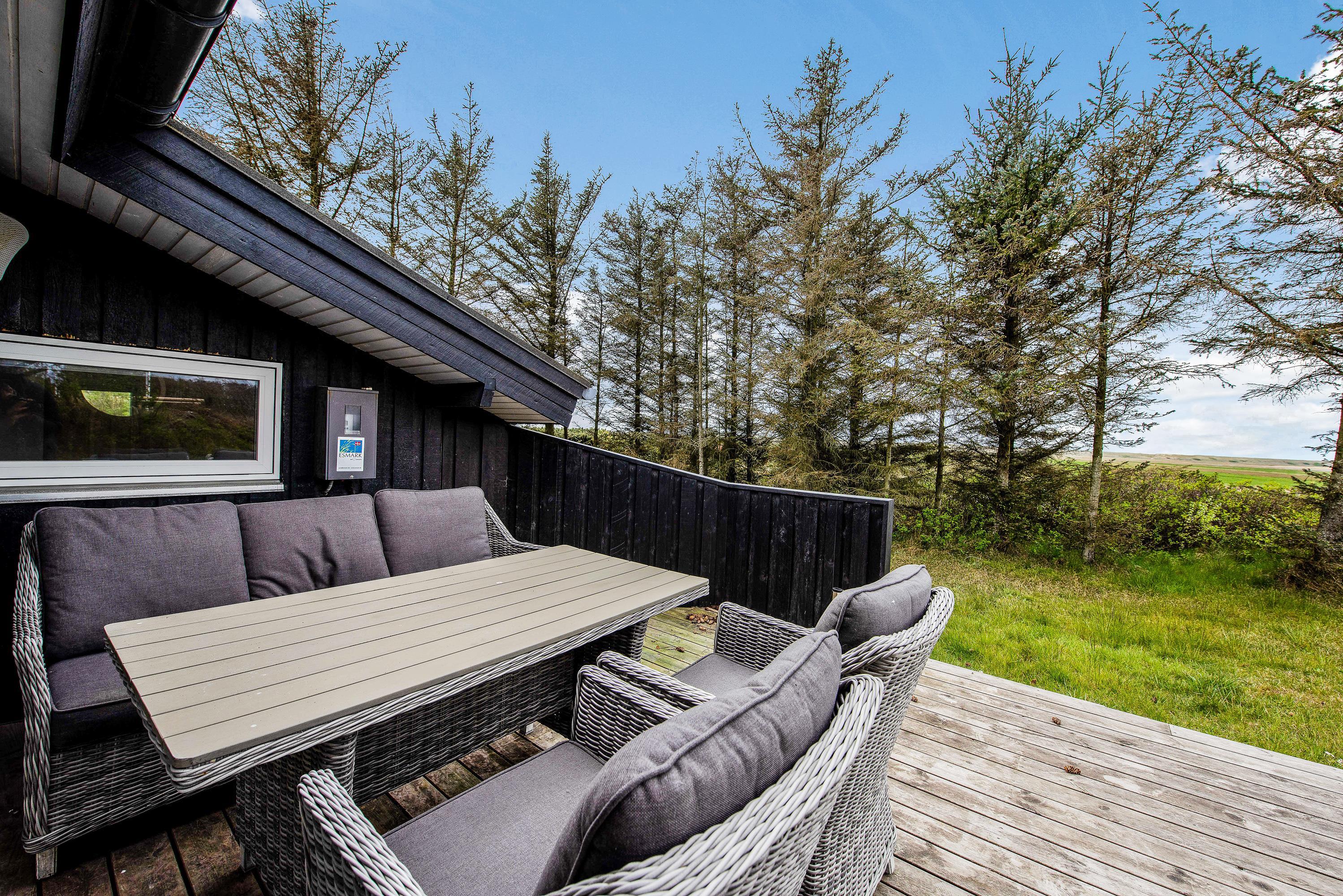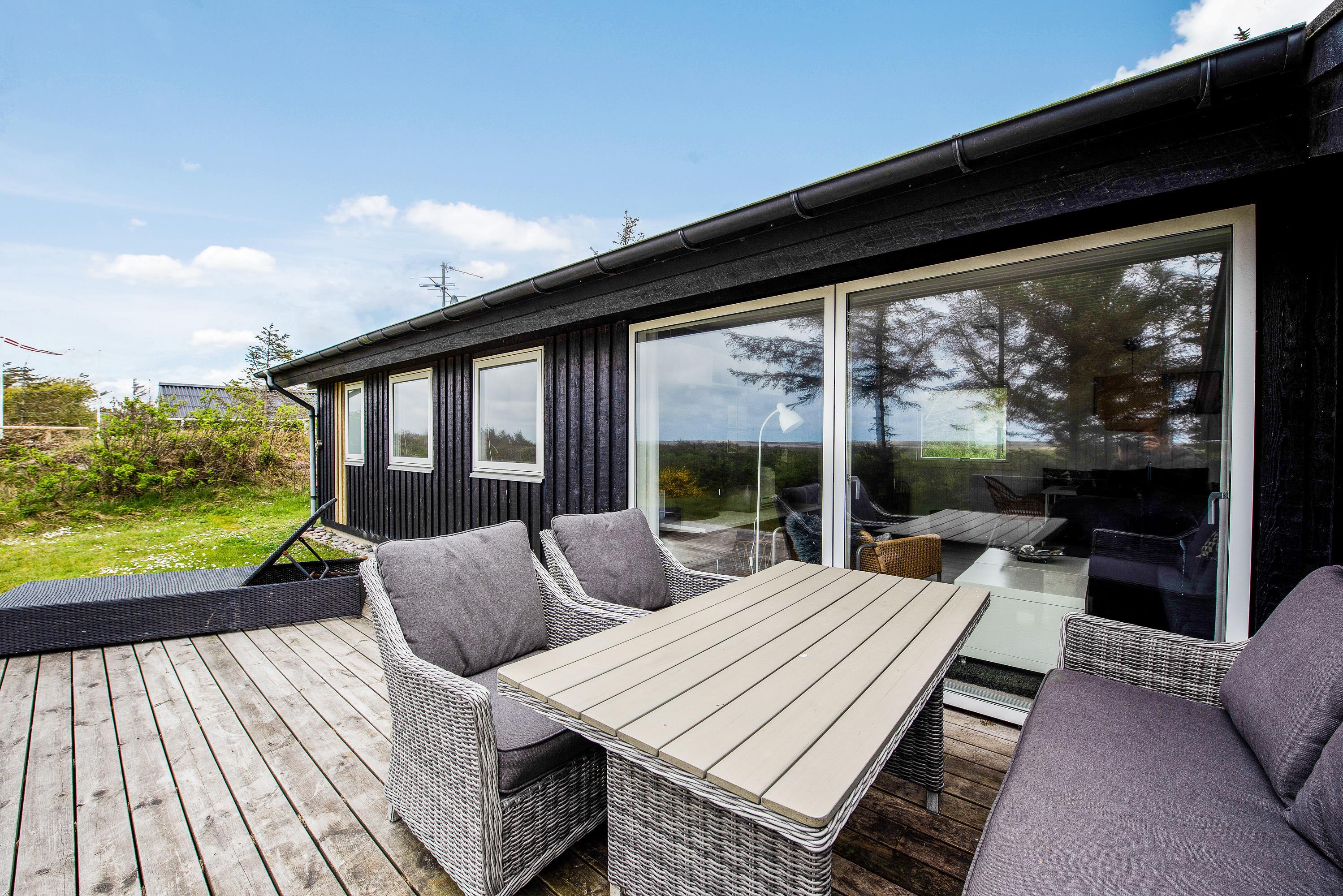 Huset har terrasse både mod syd, øst og vest. Terrassen mod syd og øst hænger sammen og er lukket hele vejen rundt med rækværk og låger. Her er der god plads til, at hundene kan komme ud, uden at I skal bekymre jer om, hvorvidt de mon selv tager på tur. Fra stuen kommer I ud på den vestvendte terrasse, hvorfra I har en helt fantastisk udsigt til de åbne marker og Nissum Fjord. På den østvendte terrasse kan I tage morgenkaffen med udenfor og få dagens første solstråler med, mens fuglene synger og vestkysten stille vågner op. Den overdækkede og delvist afskærmede terrasse mod syd giver jer tilmed mulighed for at sidde ude og nyde en dejlig grillaften i læ.