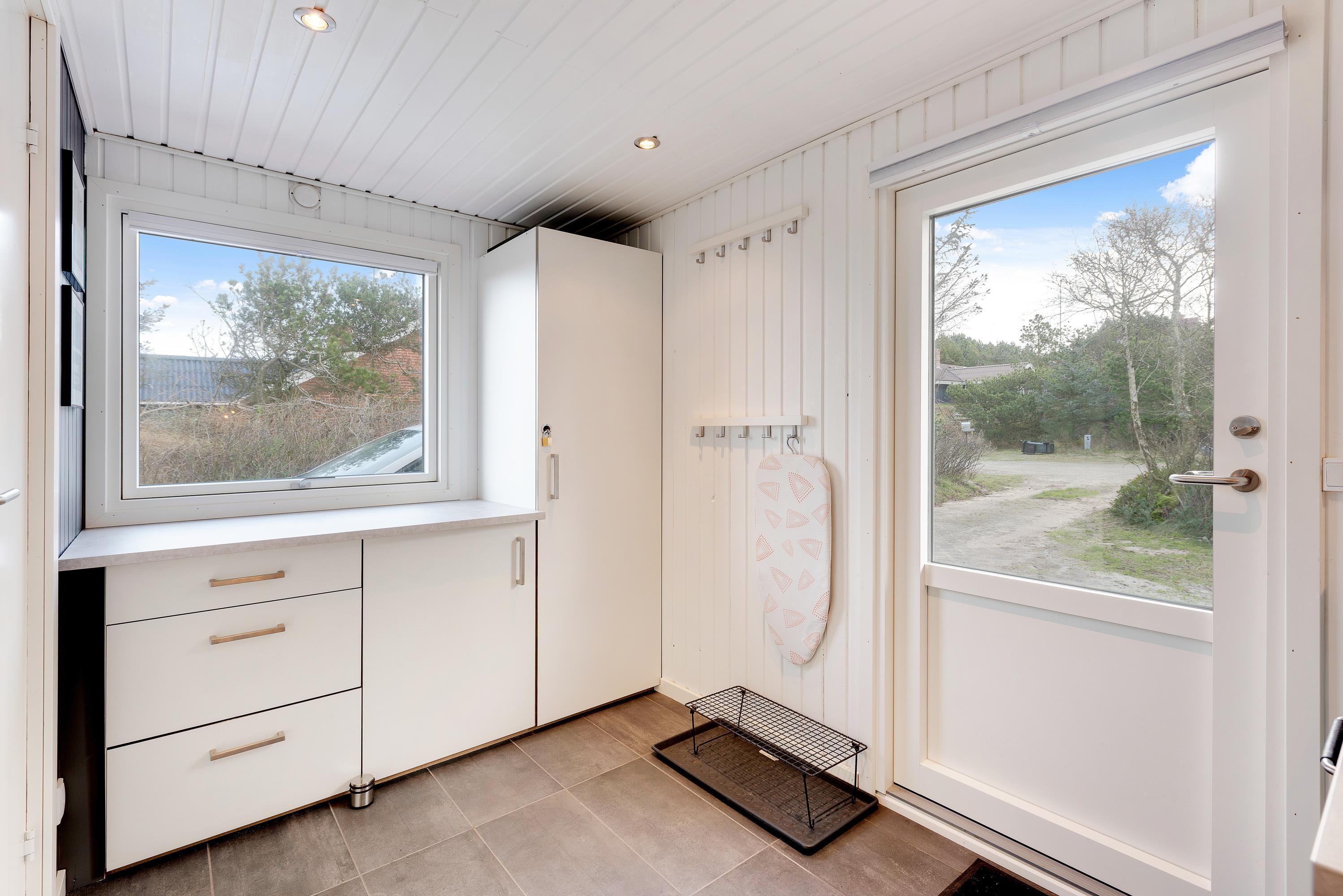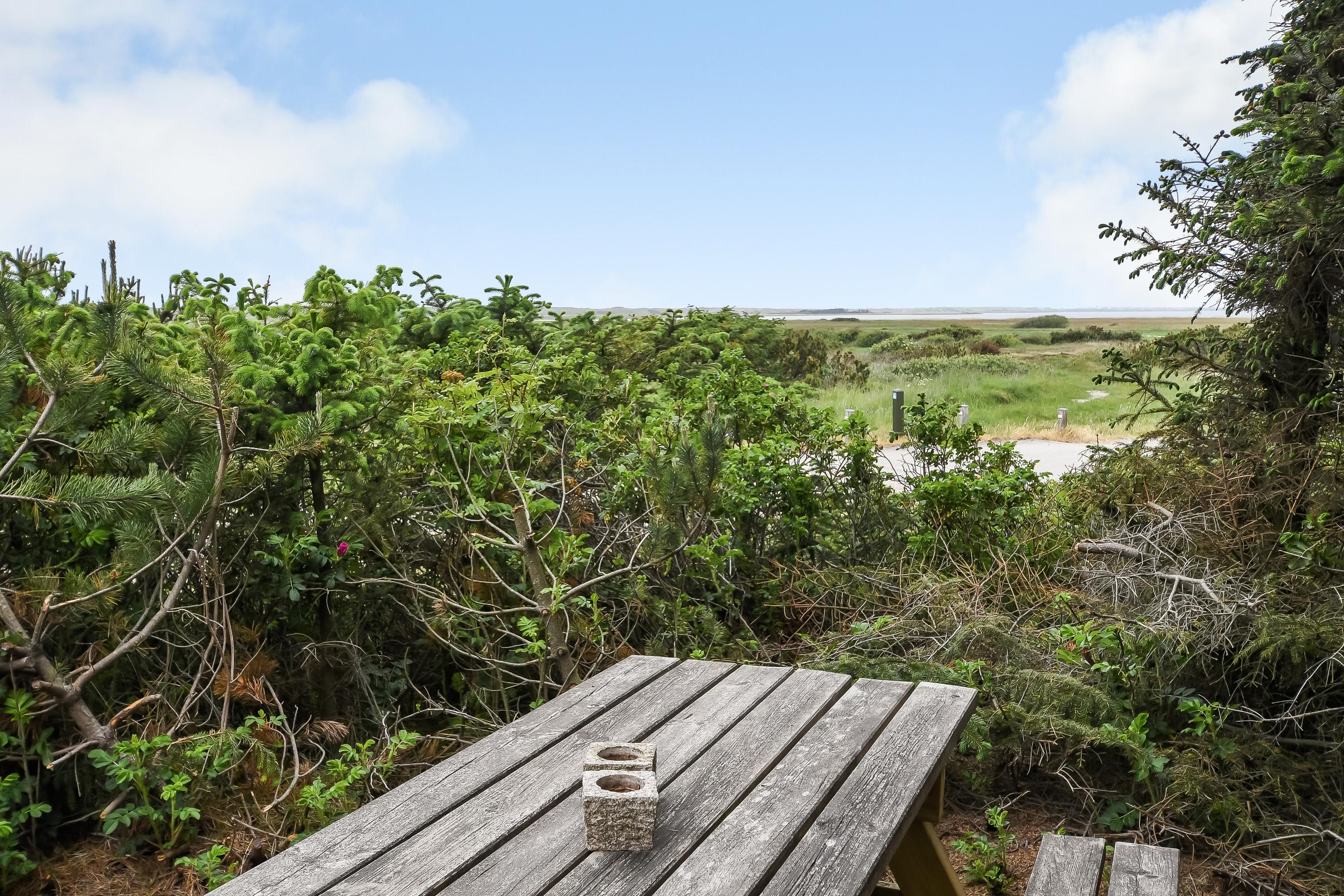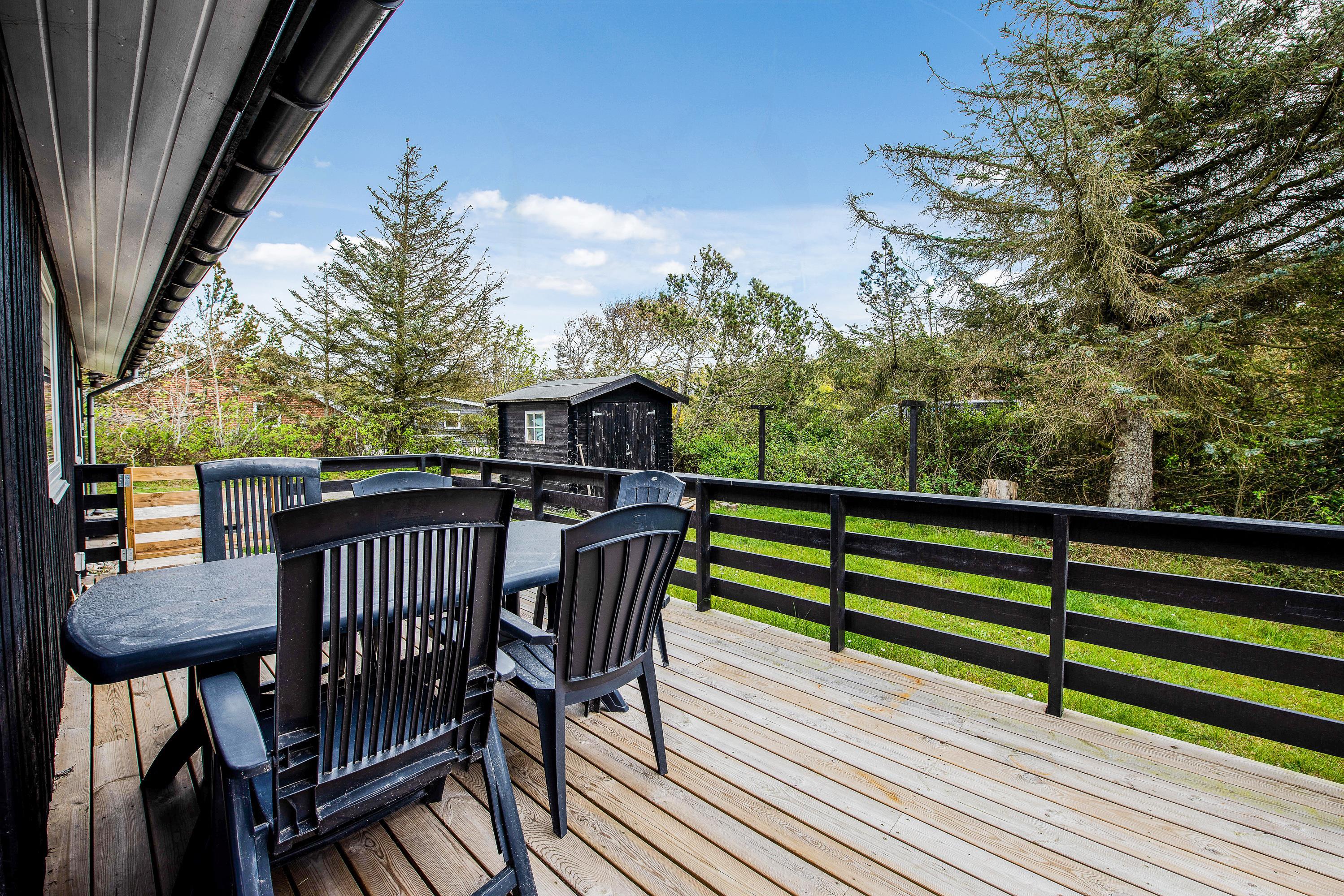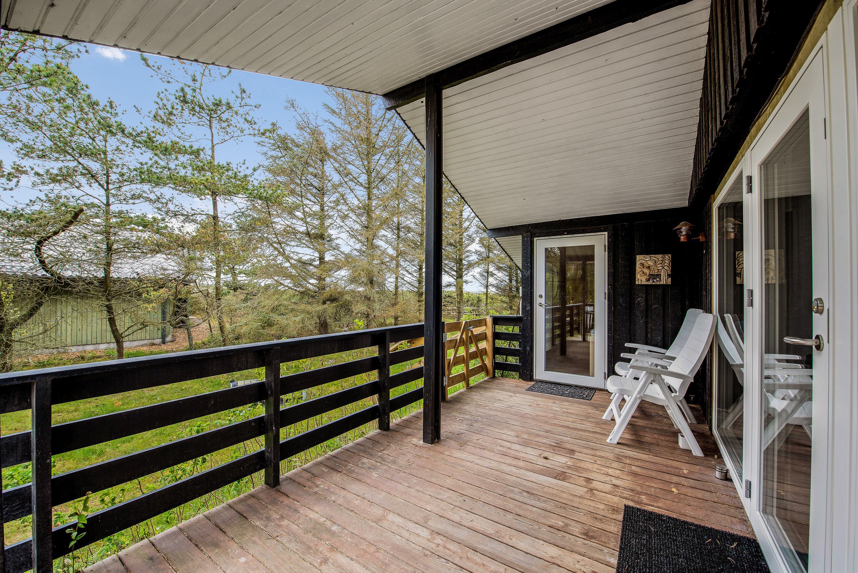 Huset har terrasse både mod syd, øst og vest. Terrassen mod syd og øst hænger sammen og er lukket hele vejen rundt med rækværk og låger. Her er der god plads til, at hundene kan komme ud, uden at I skal bekymre jer om, hvorvidt de mon selv tager på tur. Fra stuen kommer I ud på den vestvendte terrasse, hvorfra I har en helt fantastisk udsigt til de åbne marker og Nissum Fjord. På den østvendte terrasse kan I tage morgenkaffen med udenfor og få dagens første solstråler med, mens fuglene synger og vestkysten stille vågner op. Den overdækkede og delvist afskærmede terrasse mod syd giver jer tilmed mulighed for at sidde ude og nyde en dejlig grillaften i læ.