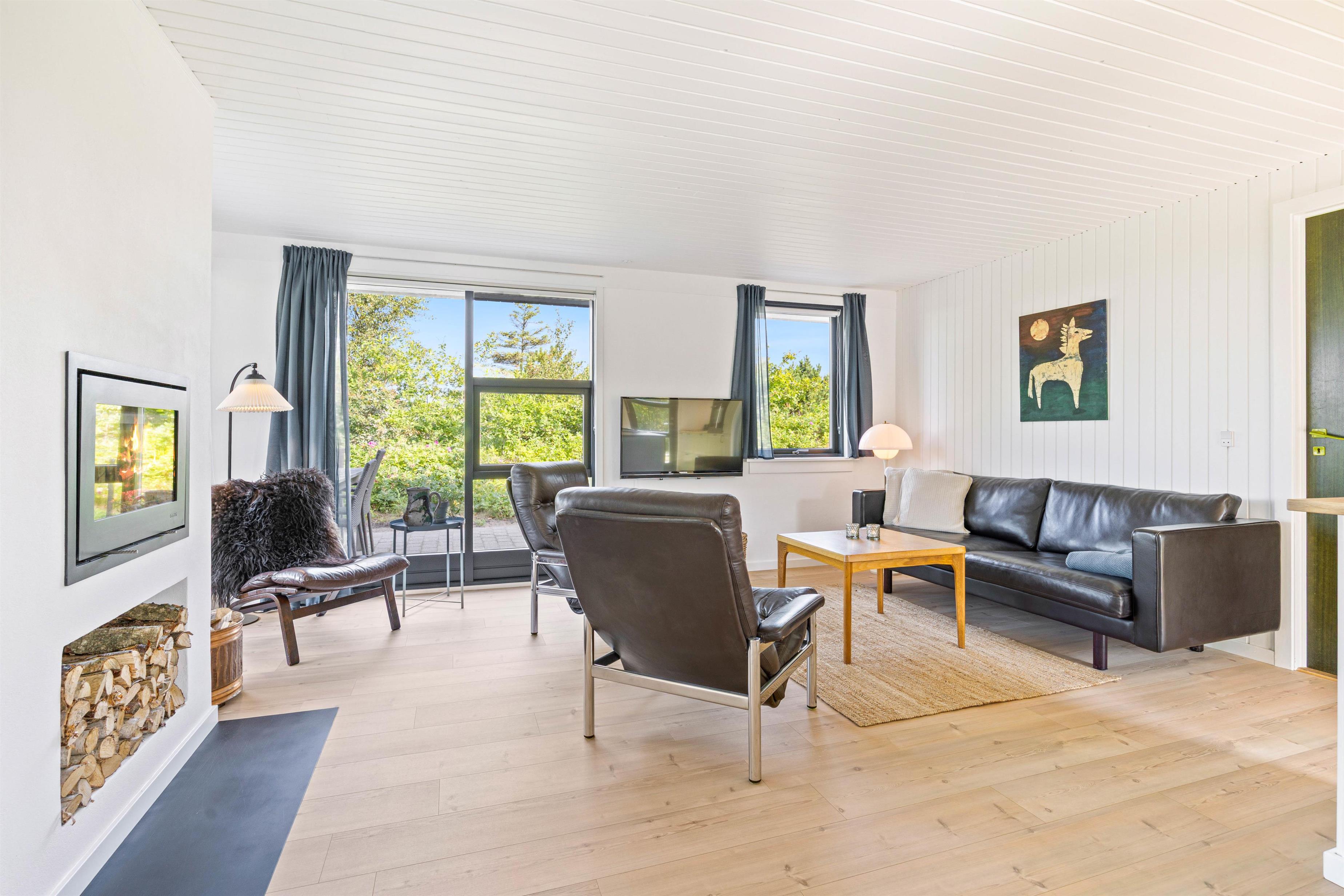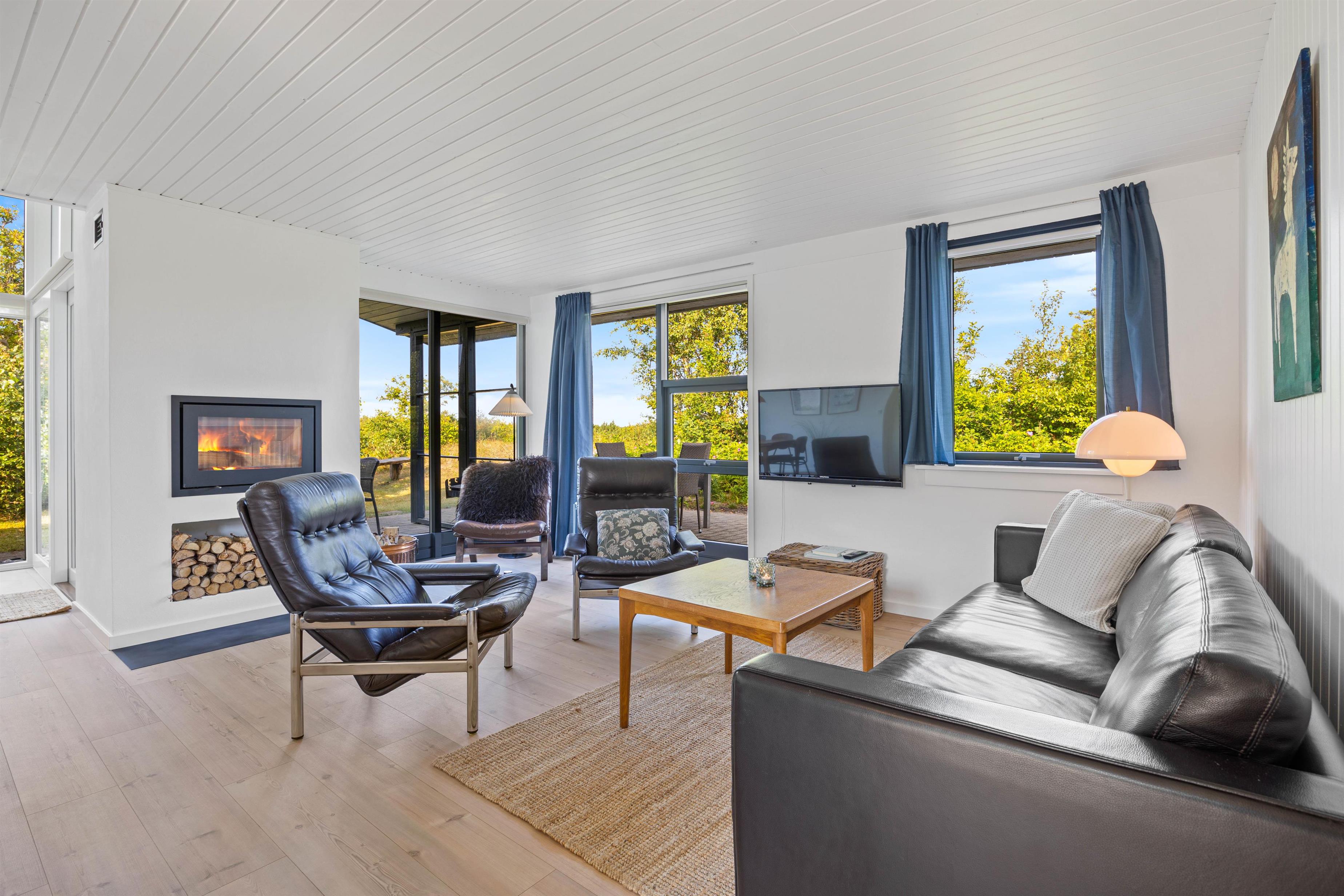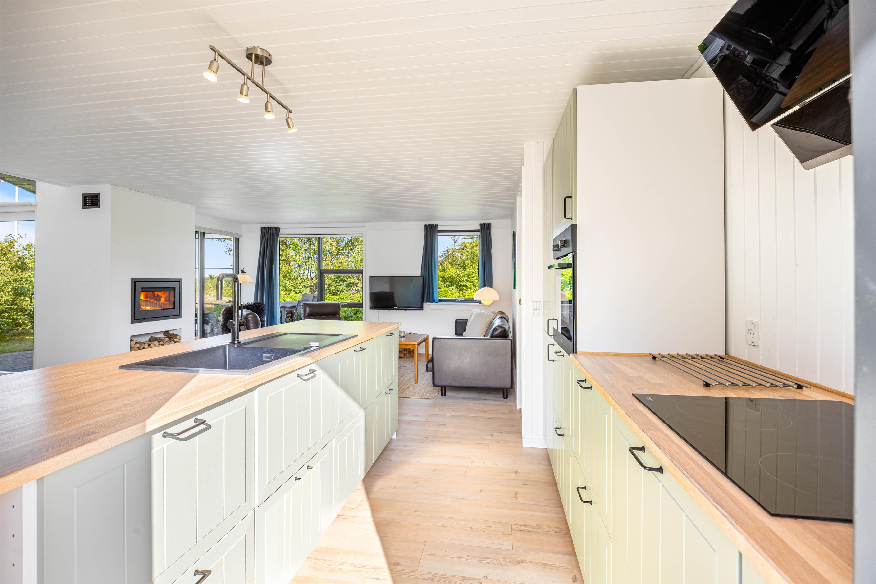 Indenfor mødes I af en varm og hjemlig stemning i det åbne opholdsrum, hvor køkken, spiseplads og stue flyder naturligt sammen. Midt i det hele står den hyggelige brændeovn, som spreder varme og hygge især på kølige aftener.